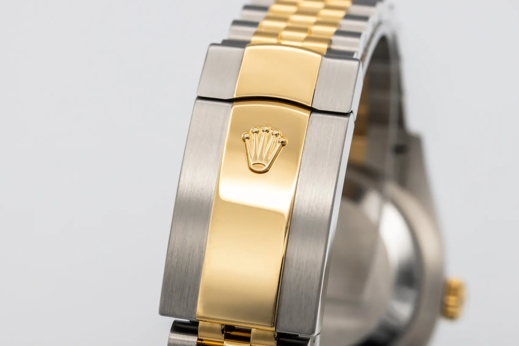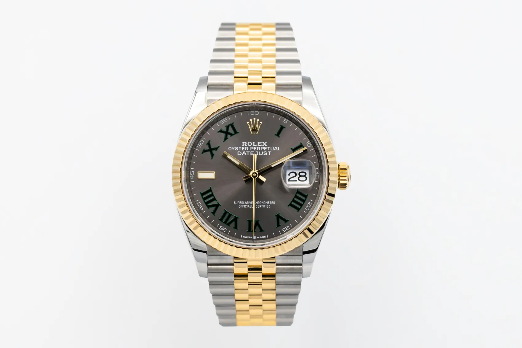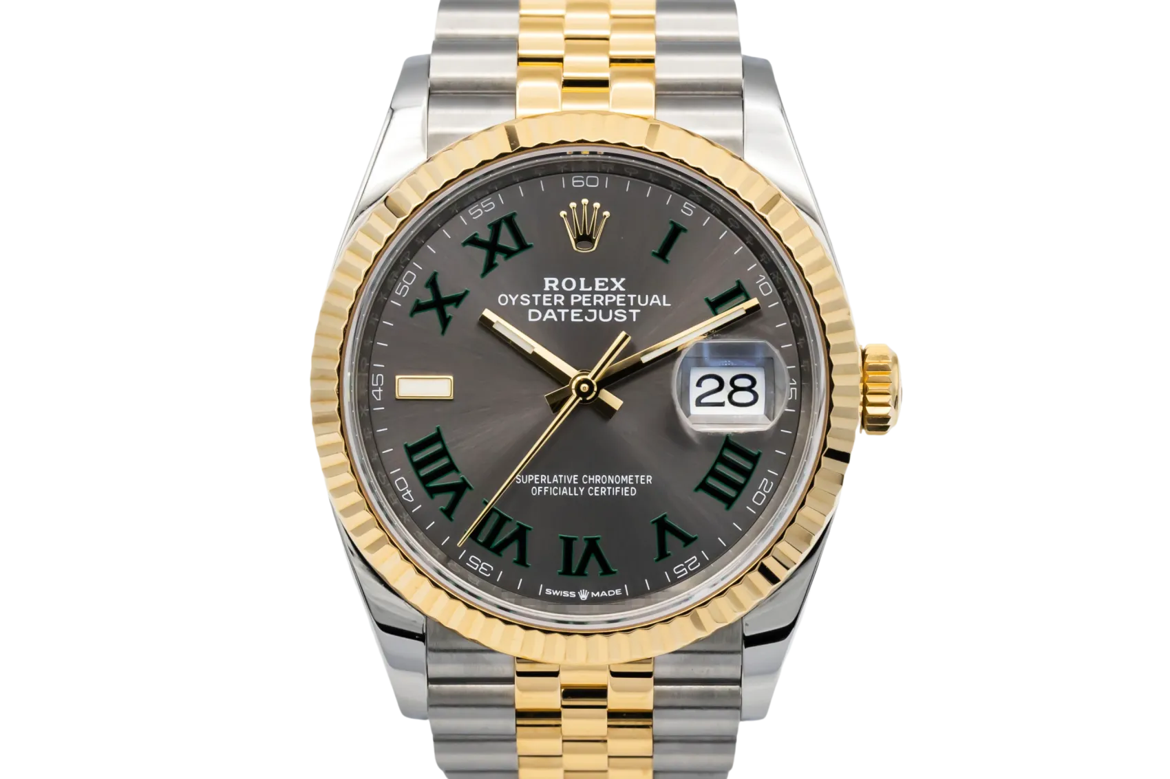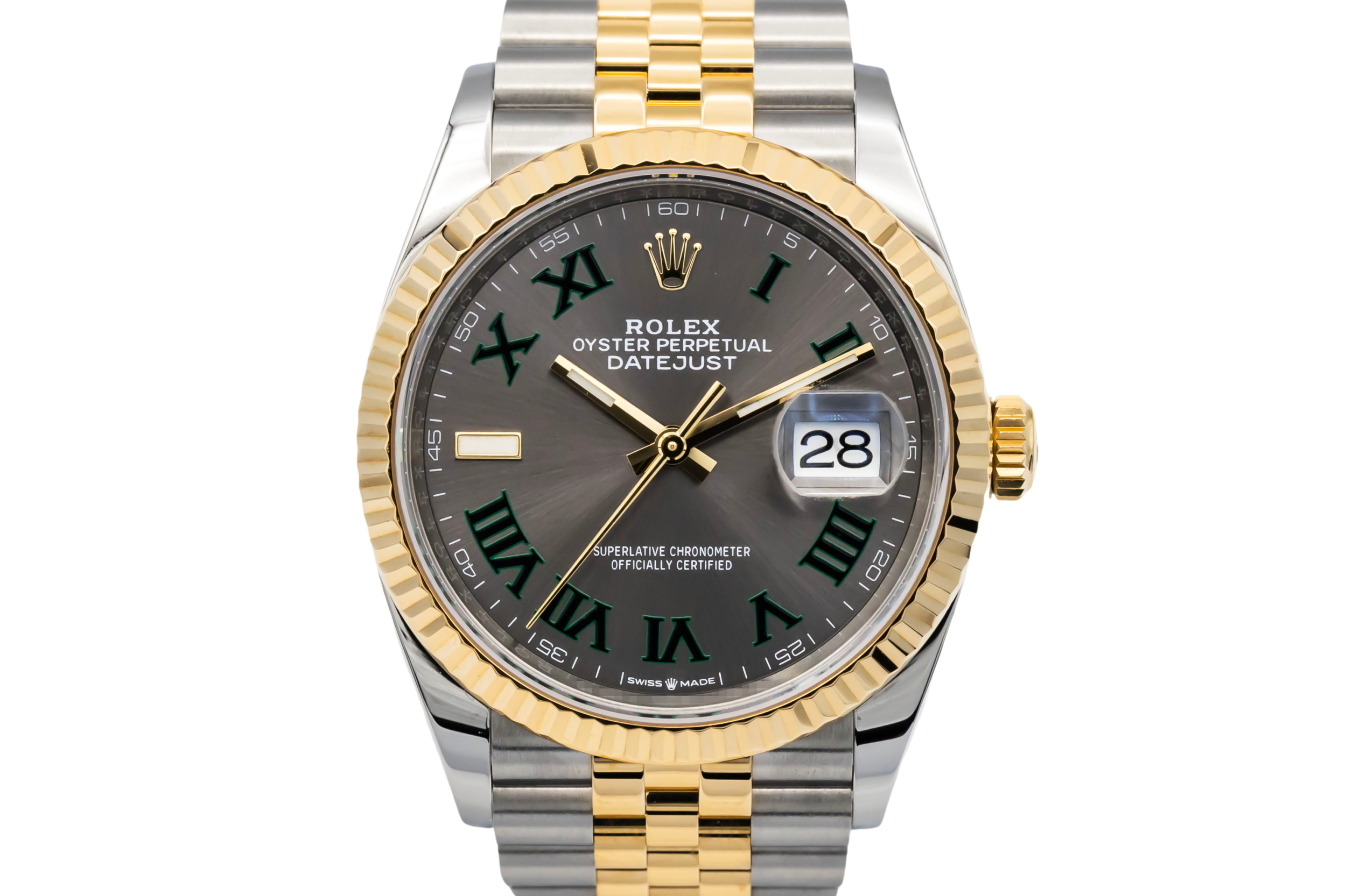 finance this from £179.77 p/m call the shop Read about our Limited Lifetime WarrantyThis 2023 Rolex DateJust 36mm ‘Wimbledon’ is a refined two-tone timepiece crafted in stainless steel and 18ct yellow gold, featuring the distinctive slate grey dial with green Roman numerals and the signature date display at 3 o’clock. Finished with a fluted yellow gold bezel and Jubilee bracelet.