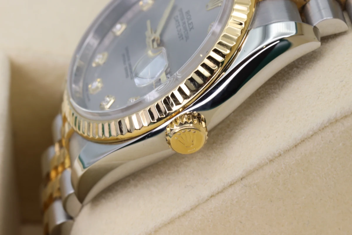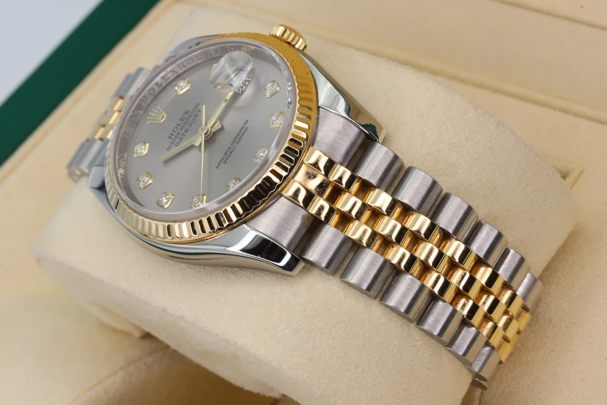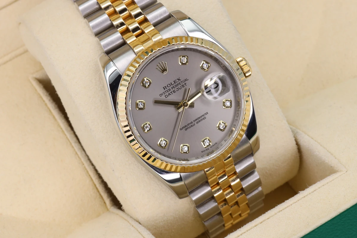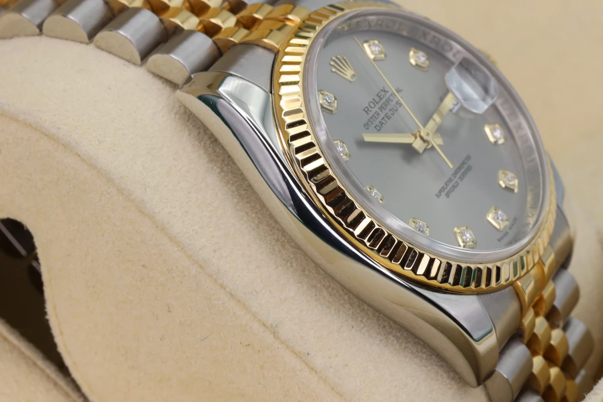 Rolex Datejust 36mm stainless steel & 18ct Yellow gold, 18ct Yellow gold fluted bezel, Rhodium 10 bit diamond dial, concealed rolex crown clasp now discontinued