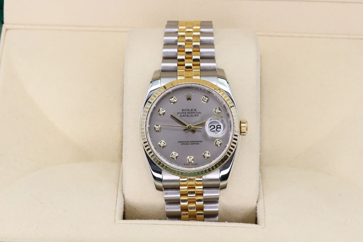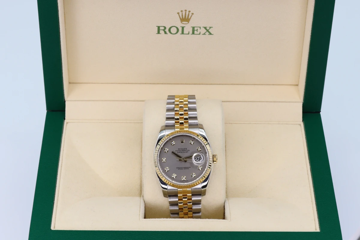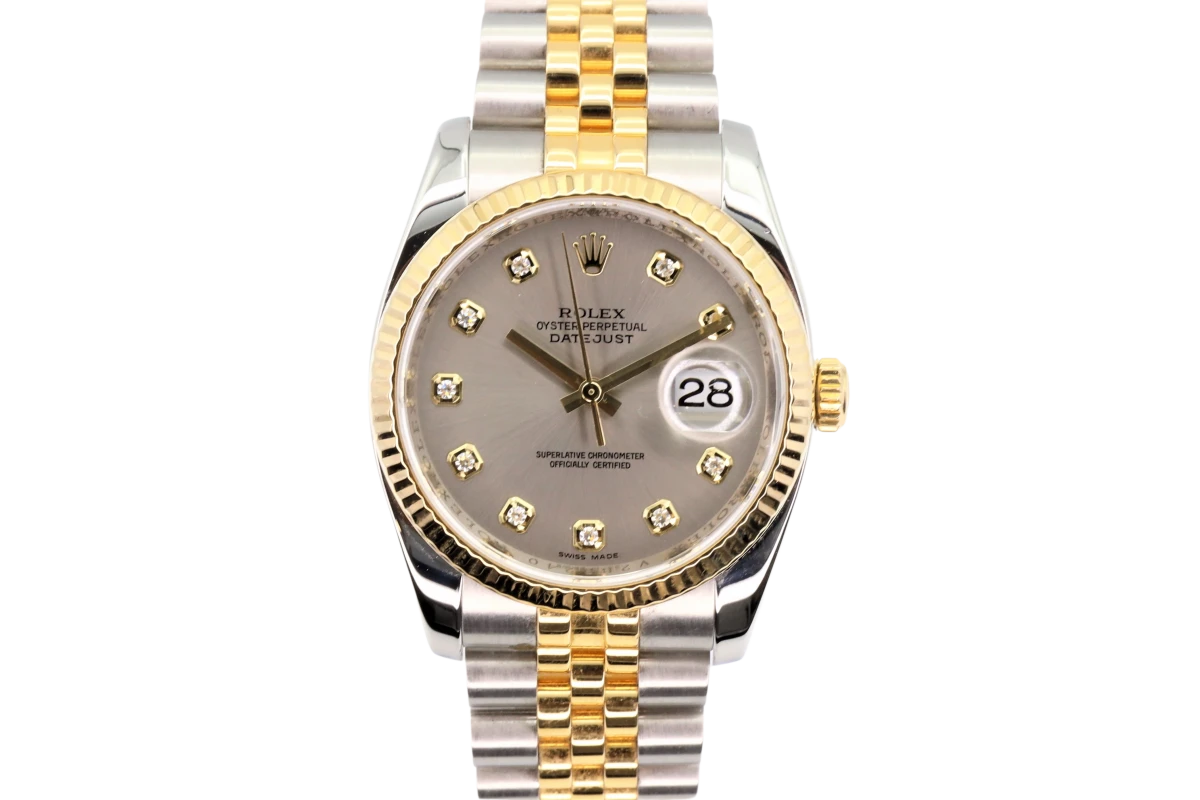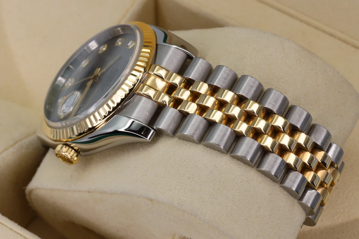 Rolex Datejust 36mm stainless steel & 18ct Yellow gold, 18ct Yellow gold fluted bezel, Rhodium 10 bit diamond dial, concealed rolex crown clasp now discontinued