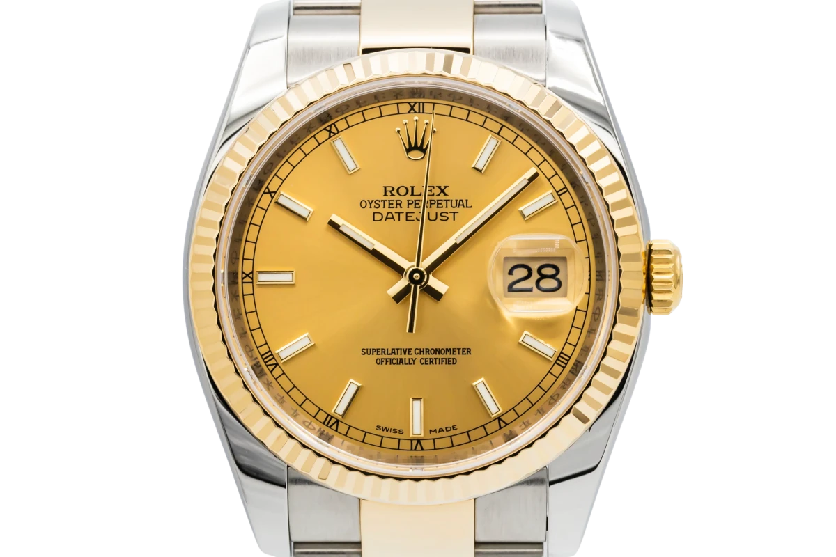 This 2018 Rolex DateJust 36mm features a champagne dial with baton markers and a stainless steel and 18ct yellow gold oyster bracelet. It also features a 18ct yellow gold fluted bezel.
