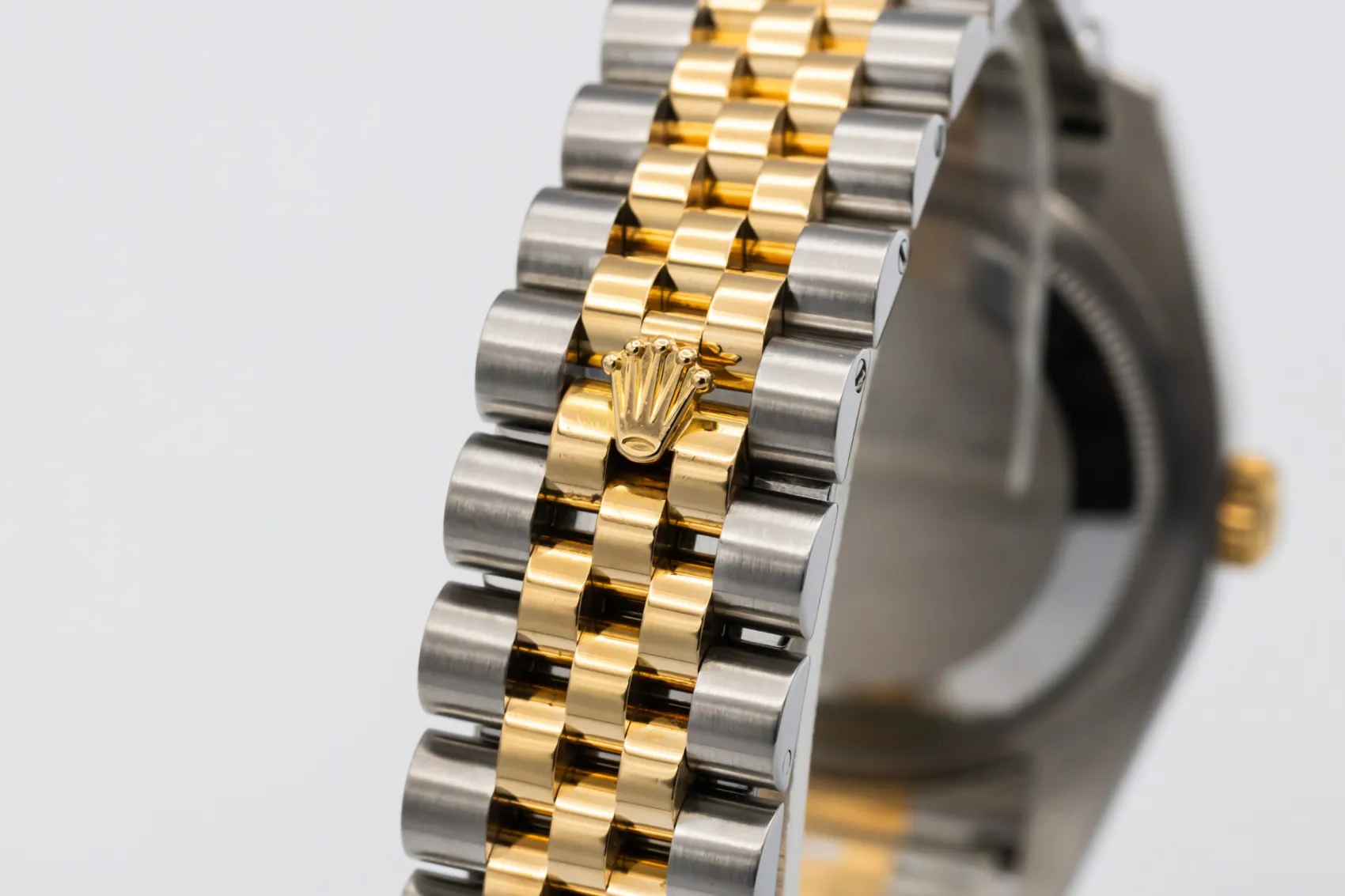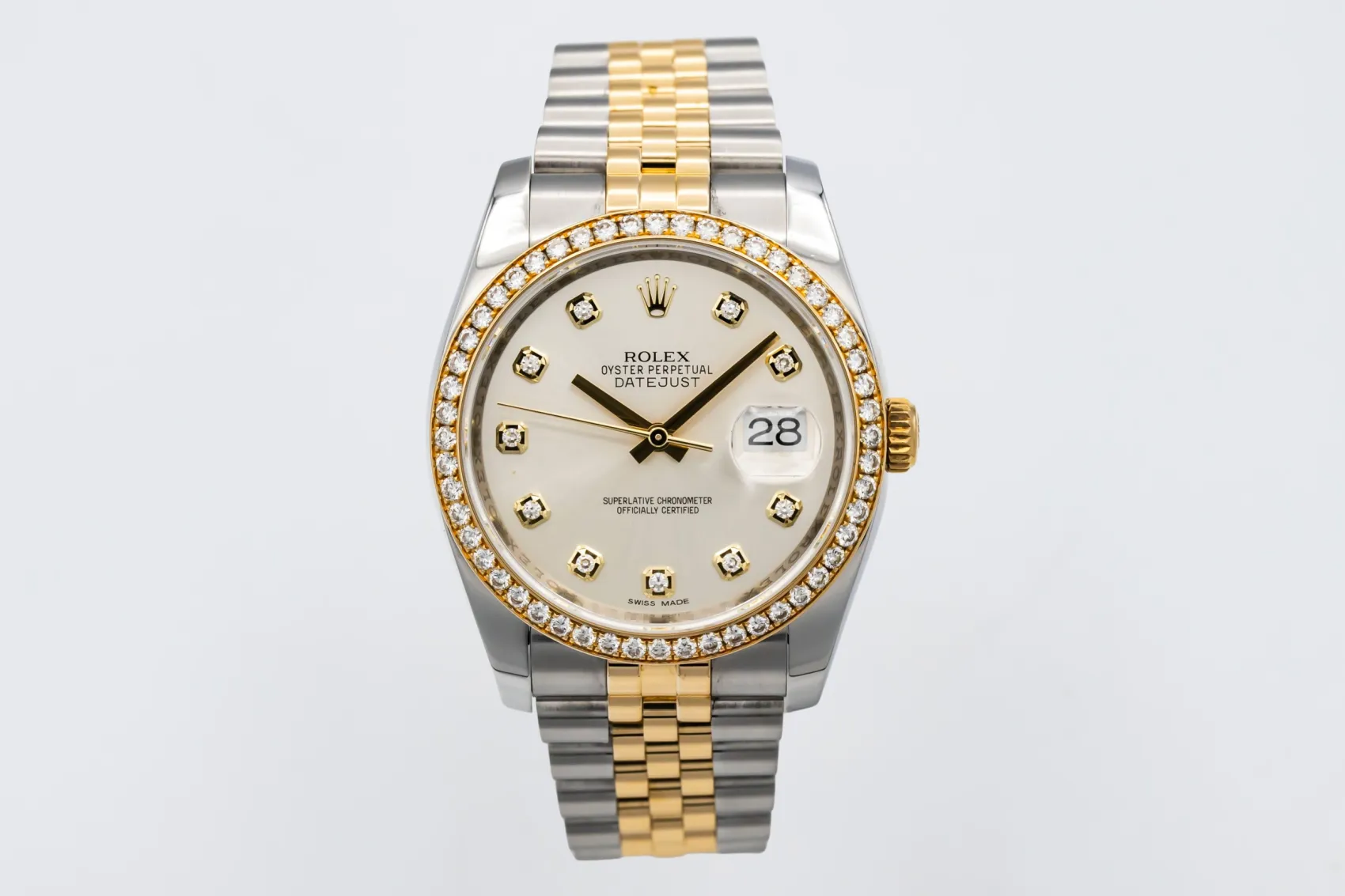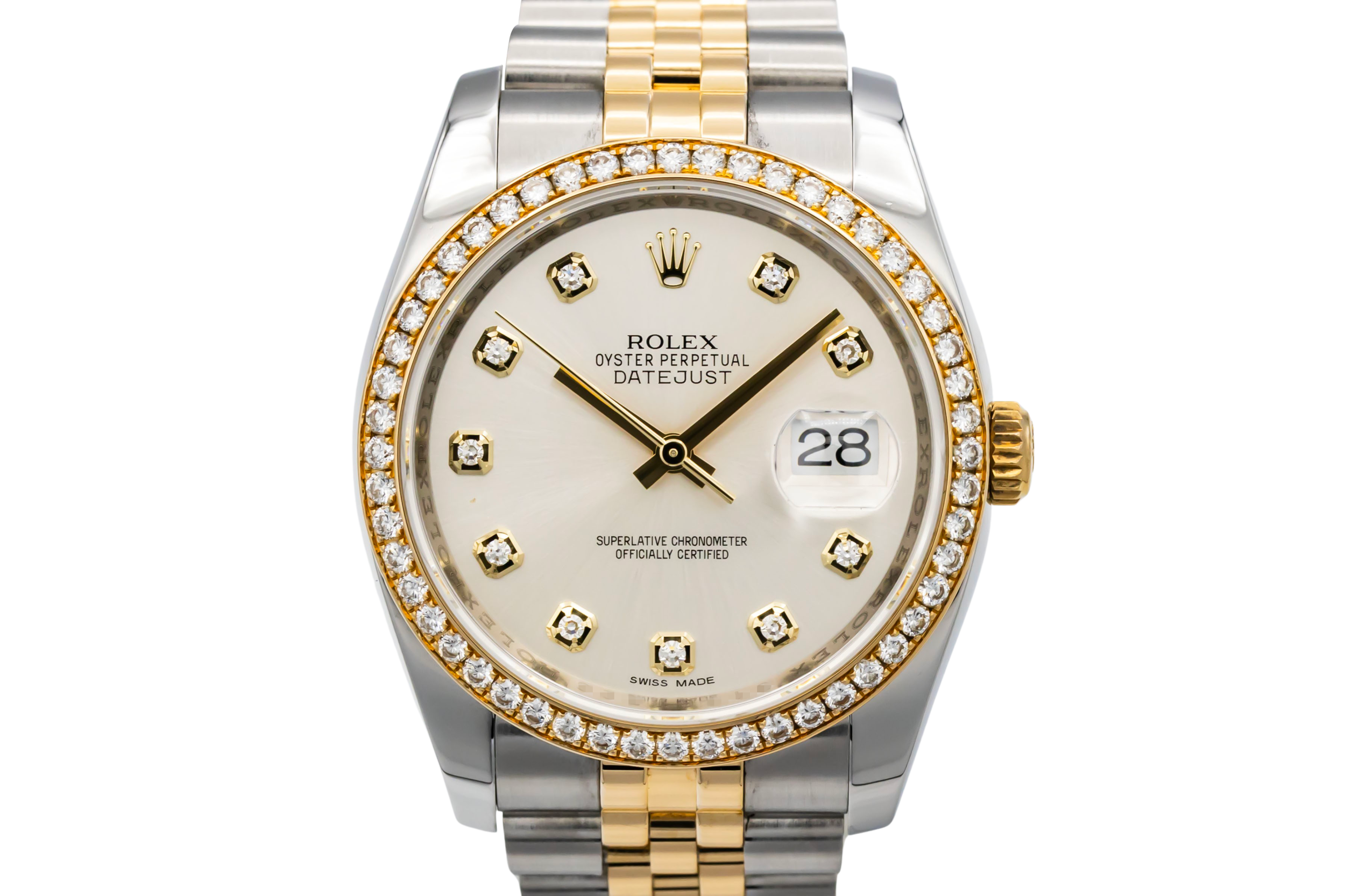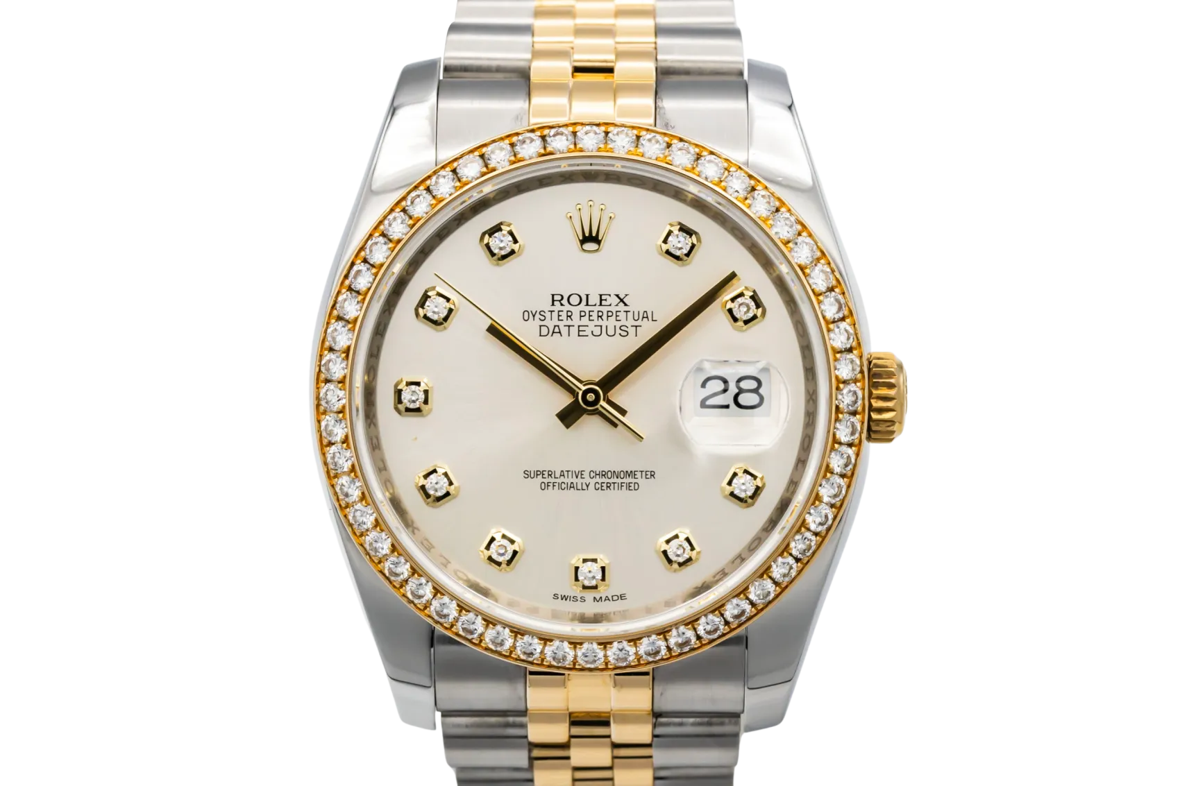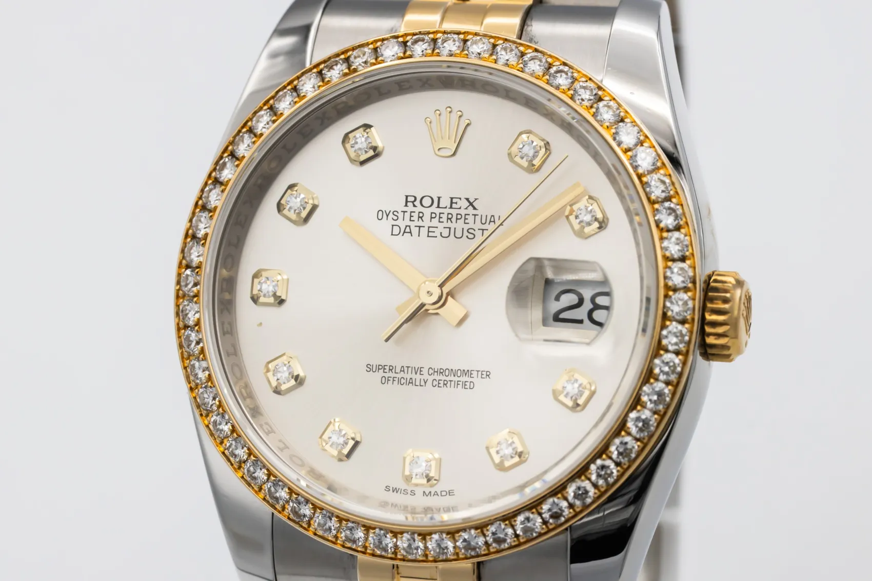 finance this from £176.65 p/m call the shop Read about our Limited Lifetime WarrantyThis 2013 Rolex DateJust 36mm is a refined luxury timepiece crafted from stainless steel and 18ct yellow gold. The silver dial is set with diamond hour markers, complemented by the signature date window at 3 o’clock for classic Rolex functionality. Framed by a factory-set diamond bezel and finished on the elegant steel and yellow gold Jubilee bracelet.
