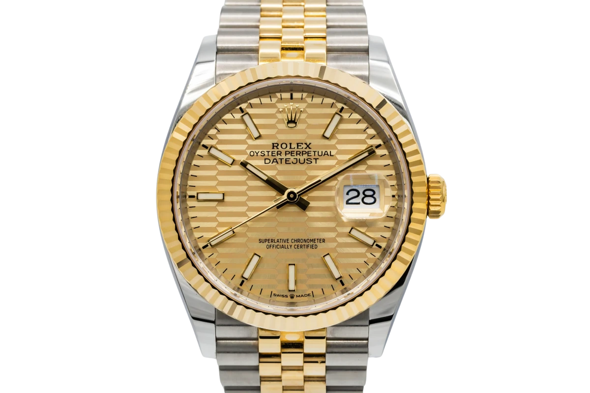 This 2022 Rolex DateJust 36mm features a champagne dial with baton markers and a stainless steel and 18ct yellow gold jubilee bracelet. It also features a 18ct yellow gold fluted bezel.