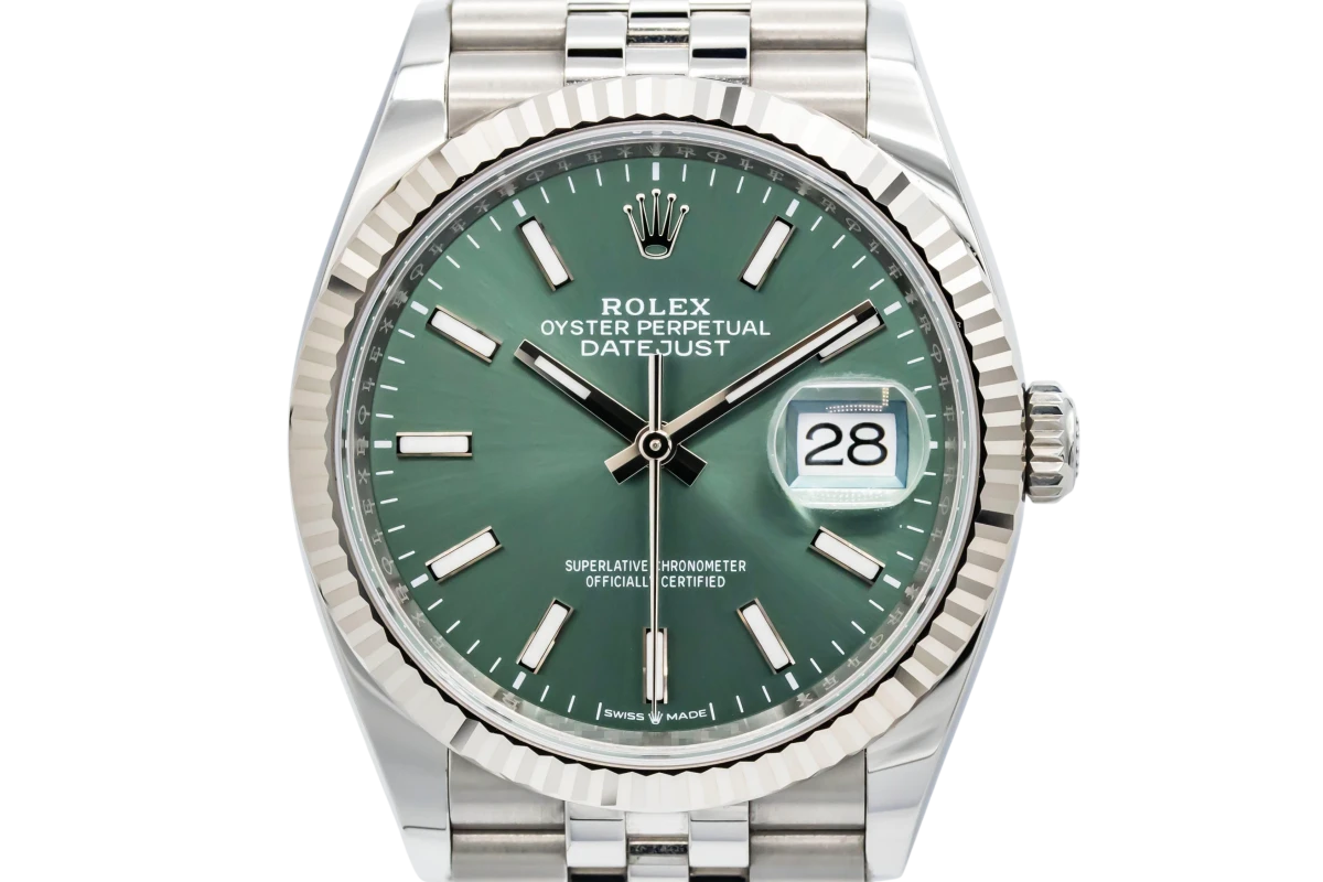 This 2025 Rolex DateJust 36mm features a green dial with baton markers and a stainless steel jubilee bracelet. It is fitted with an 18ct white gold fluted bezel.