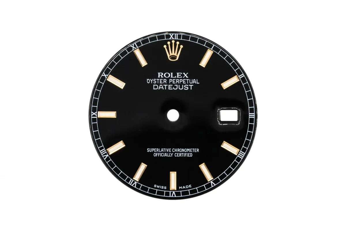 A black dial with 18ct rose gold baton markers, For a Rolex DateJust 36mm.