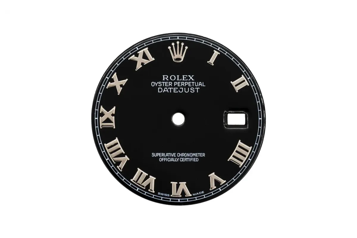 A black dial with white gold roman numeral markers, For a Rolex DateJust 36mm.