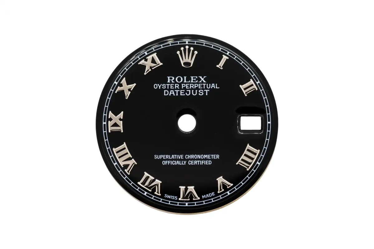 A black dial with white gold roman numeral markers, For a Rolex DateJust 36mm.