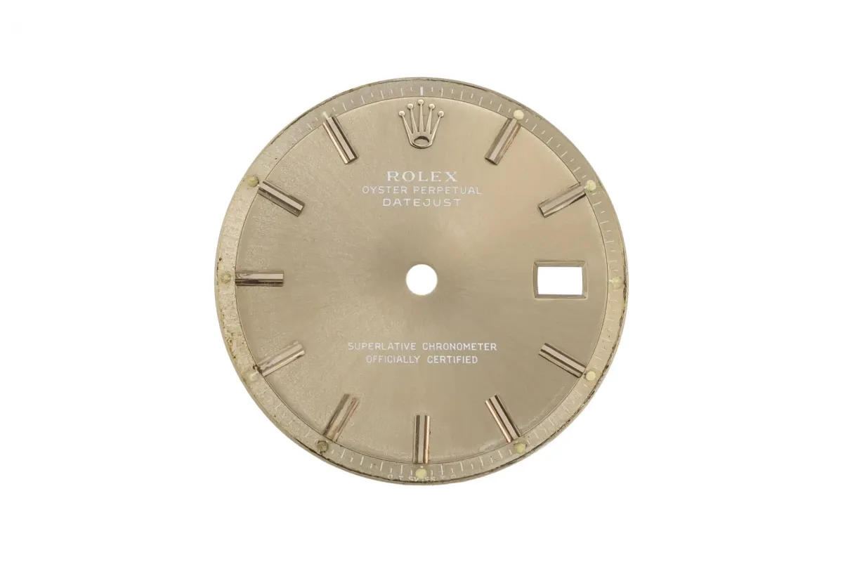 A gold 'piepan' dial with baton markers for a Rolex DateJust 36mm.