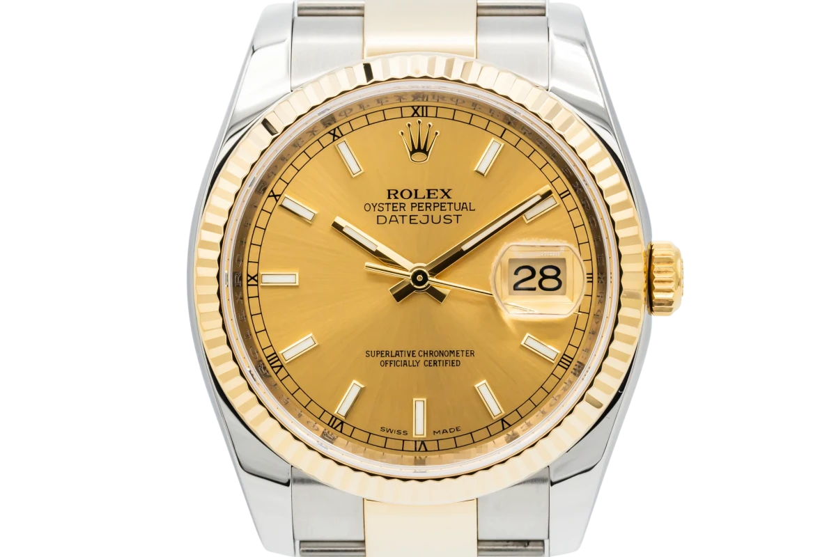 This 2021 Rolex DateJust 36mm features a champagne dial with baton markers and a stainless steel and 18ct yellow gold oyster bracelet. It also features a 18ct yellow gold fluted bezel.
