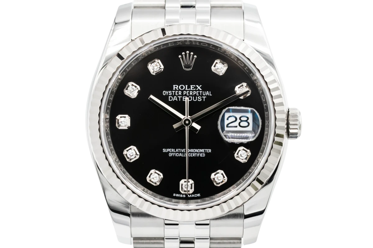 This 2019 Rolex DateJust 36mm features a black dial with factory diamond markers and a stainless steel jubilee bracelet. It fitted with a 18ct white gold fluted bezel.