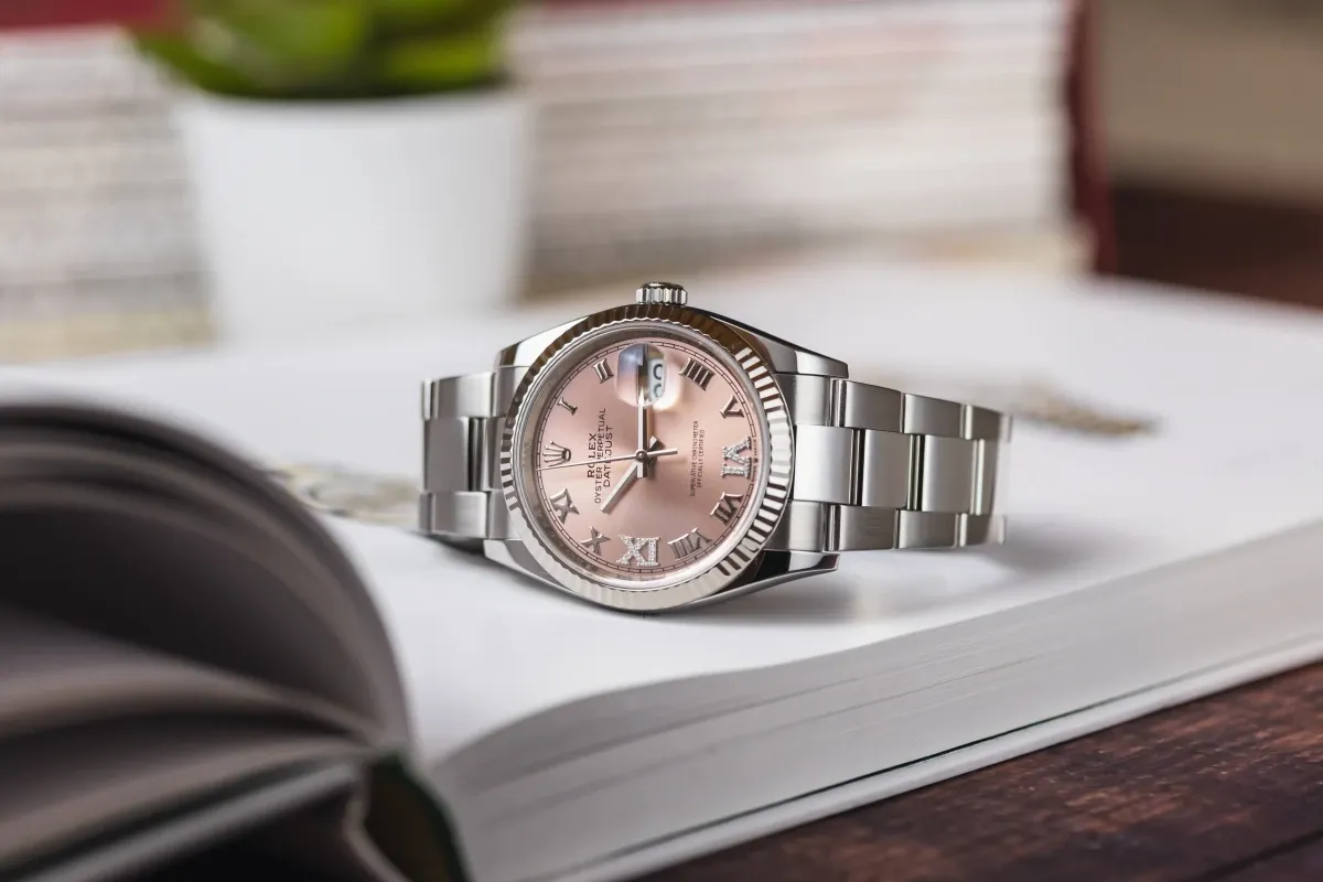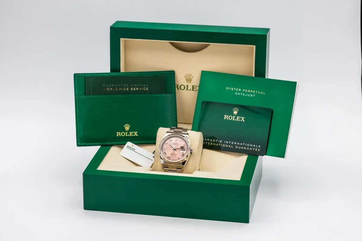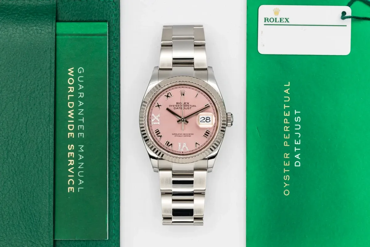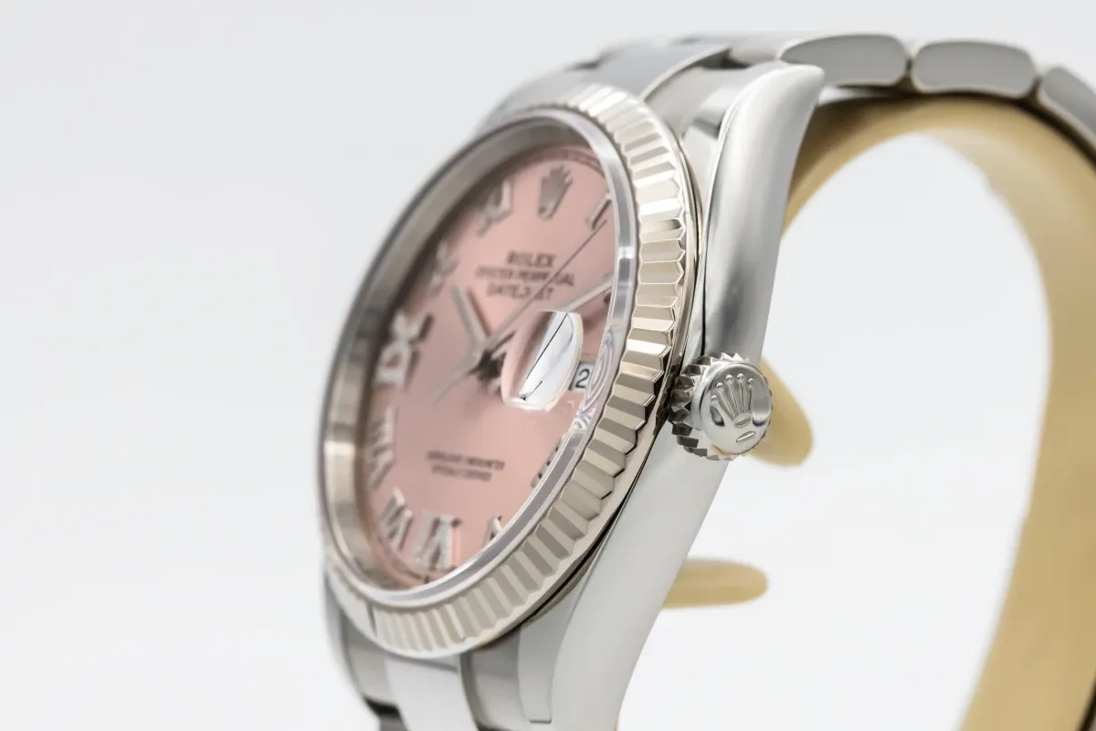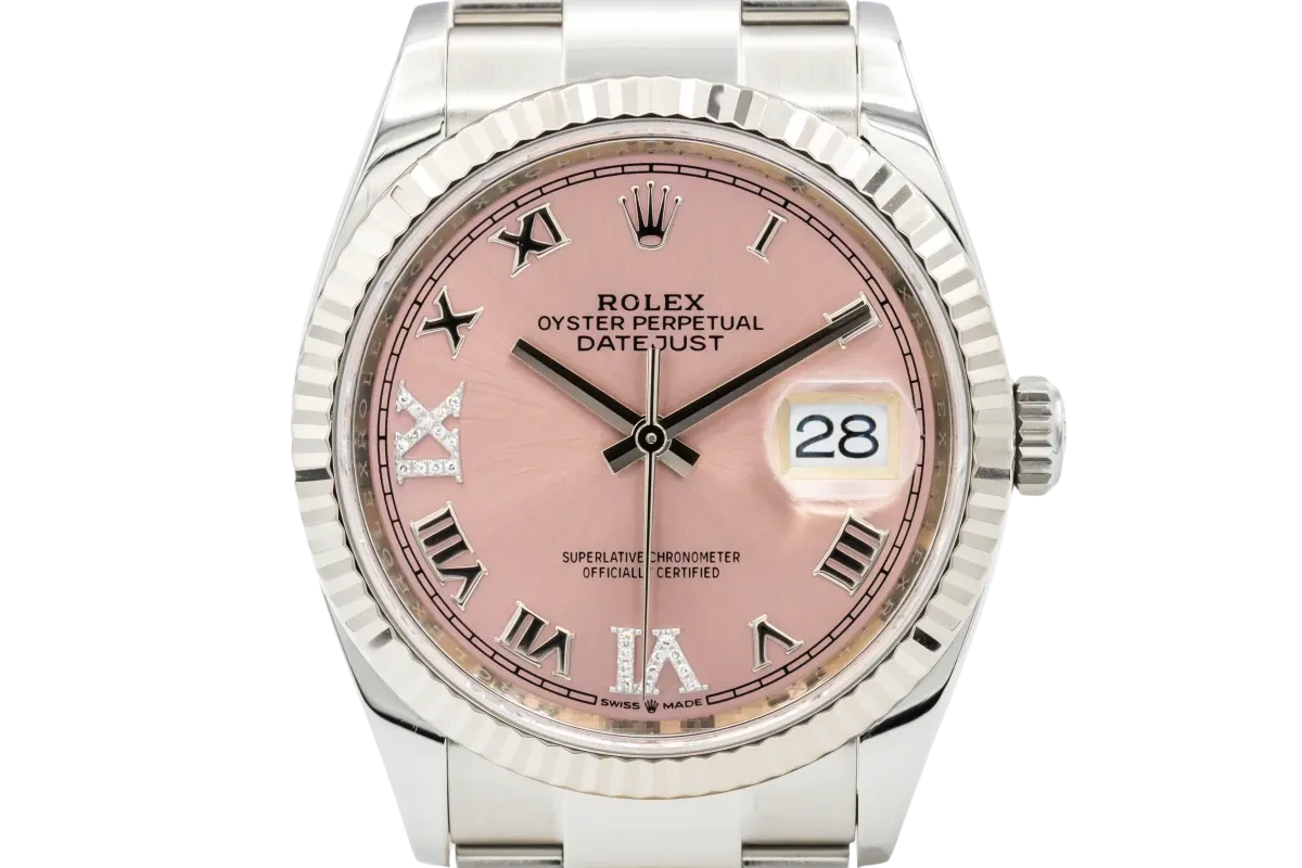 finance this from £221.09 p/m call the shop Read about our Limited Lifetime WarrantyThis 2021 Rolex DateJust 36mm features a pink dial with roman numerals and is paired with a stainless steel oyster bracelet. It also includes an 18ct white gold fluted bezel, adding a touch of classic elegance to its design.