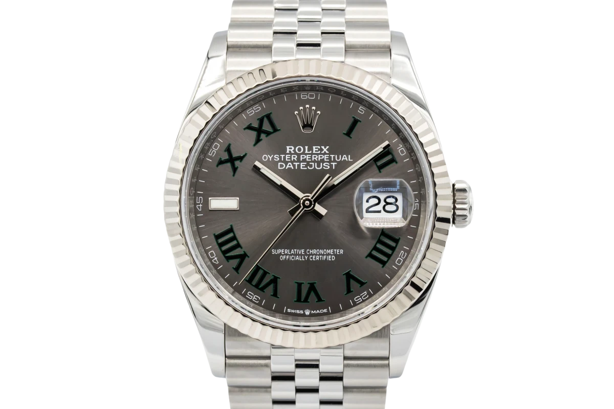 This 2022 Rolex DateJust 36mm features a grey dial with roman numerals and is paired with a stainless steel jubilee bracelet. It also includes an 18ct white gold fluted bezel, adding a touch of classic elegance to its design.