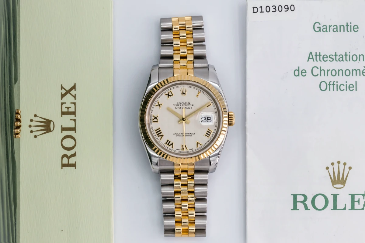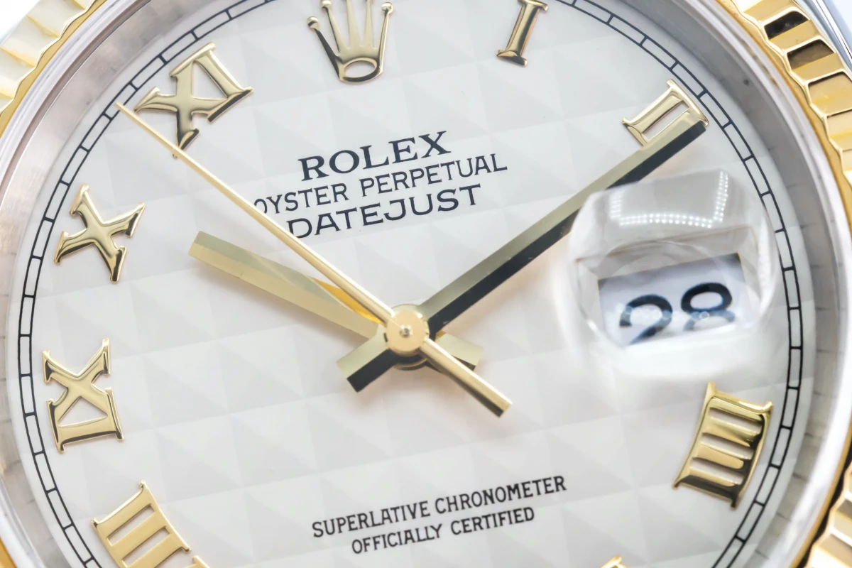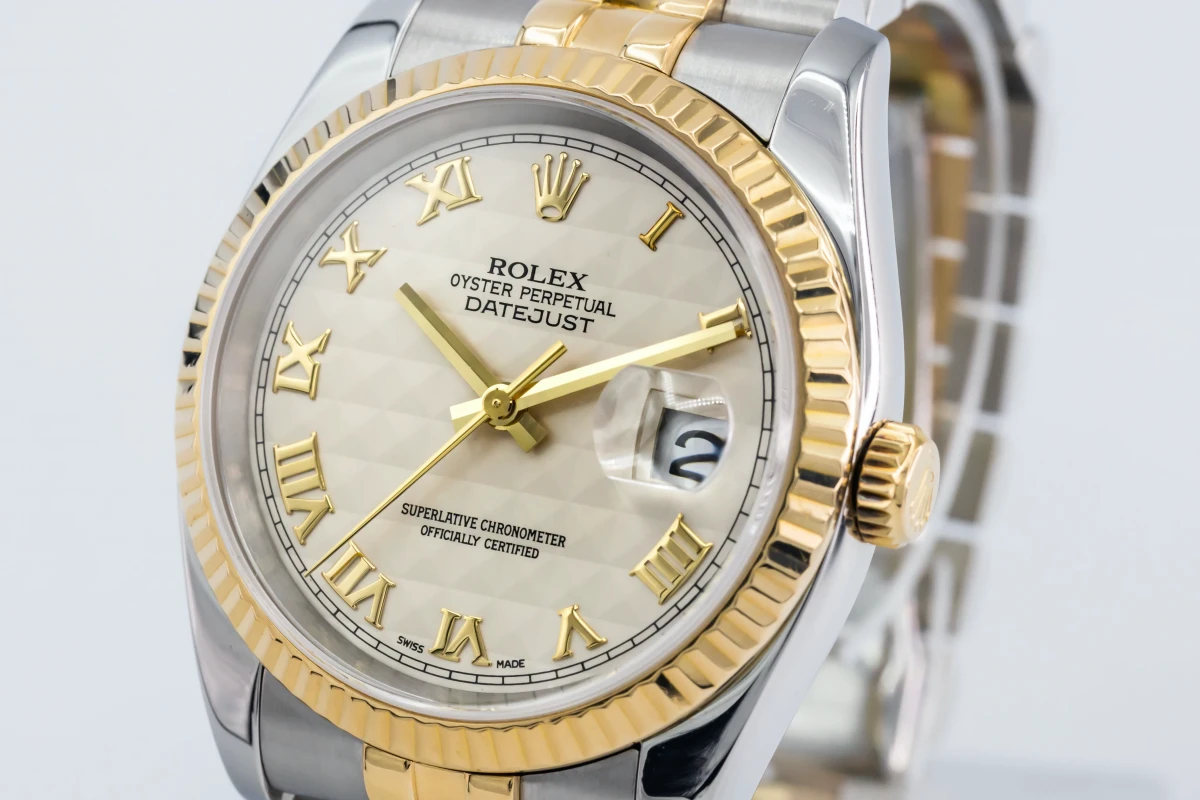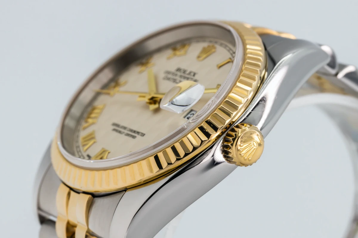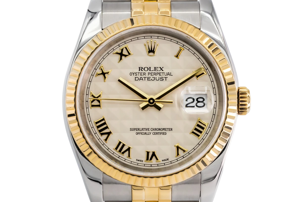 This 2006 Rolex DateJust 36mm features a ivory pyramid dial with yellow gold roman numerals and a stainless steel & 18ct yellow gold jubilee bracelet. It is fitted with an 18ct white gold fluted bezel.
