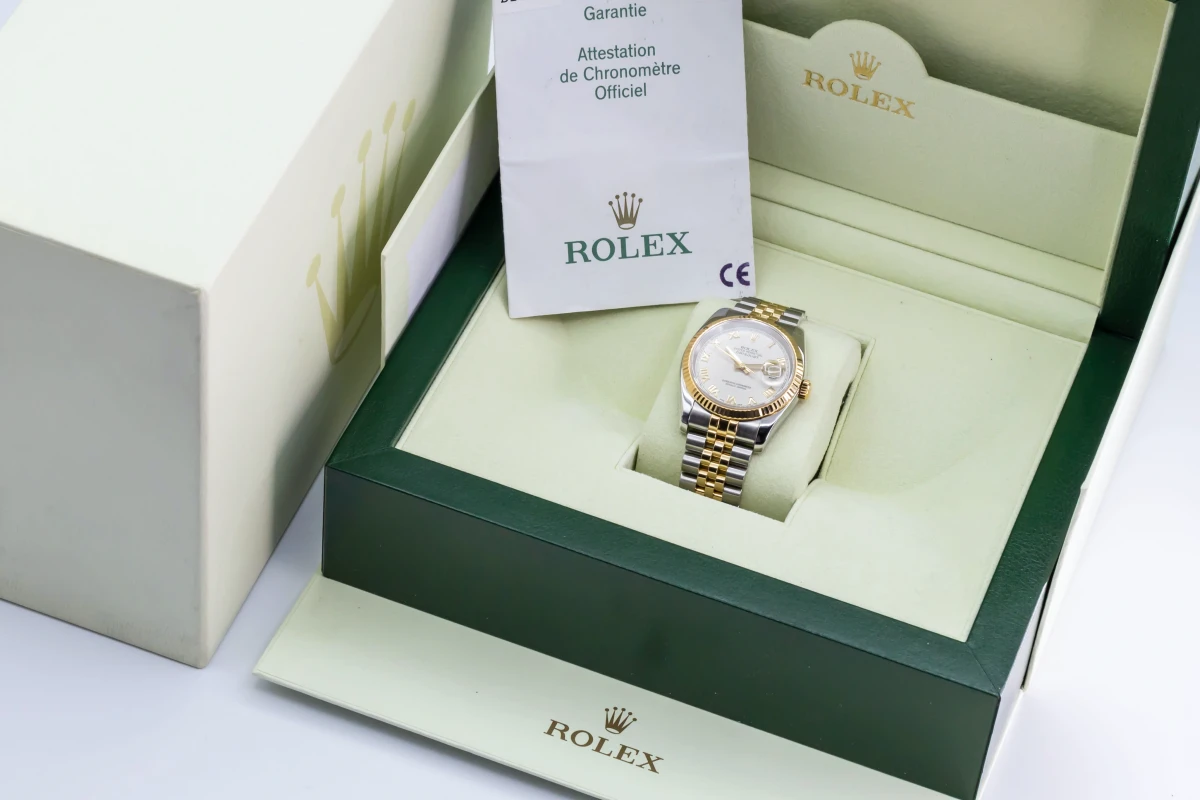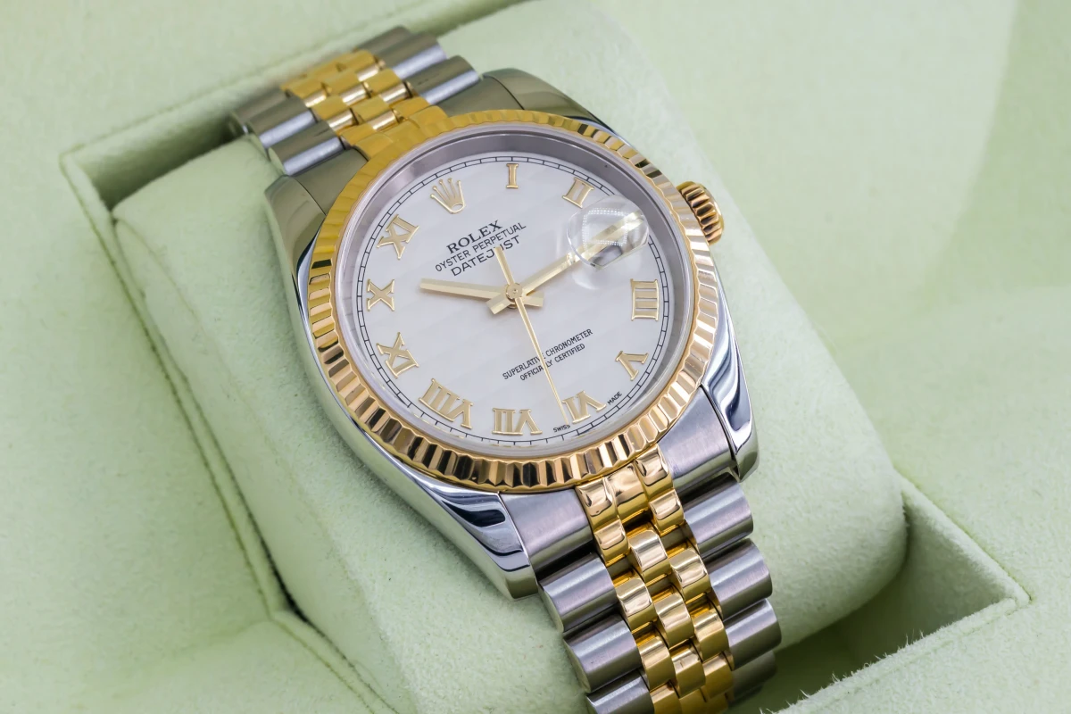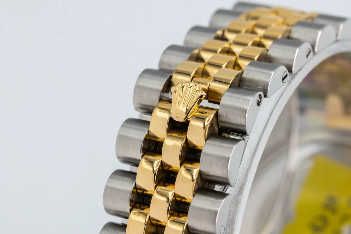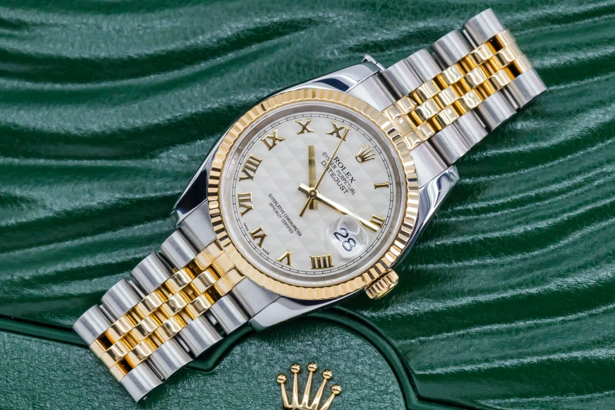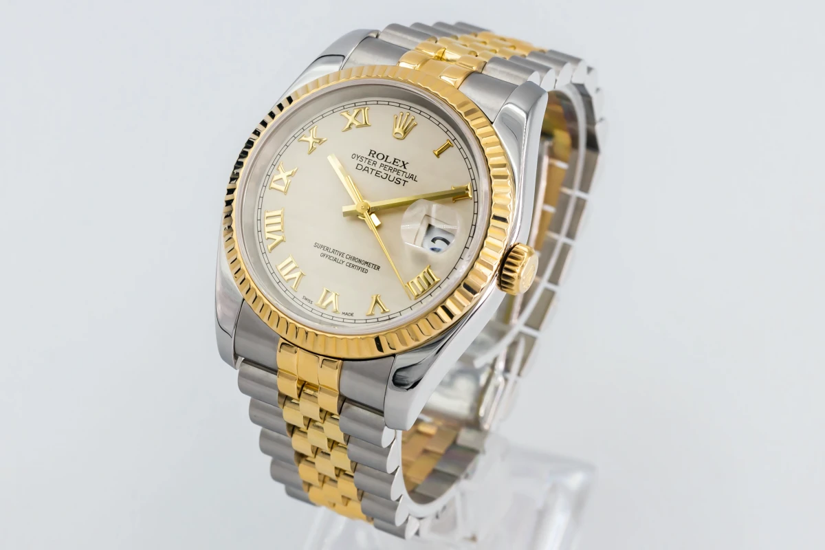 This 2006 Rolex DateJust 36mm features a ivory pyramid dial with yellow gold roman numerals and a stainless steel & 18ct yellow gold jubilee bracelet. It is fitted with an 18ct white gold fluted bezel.
