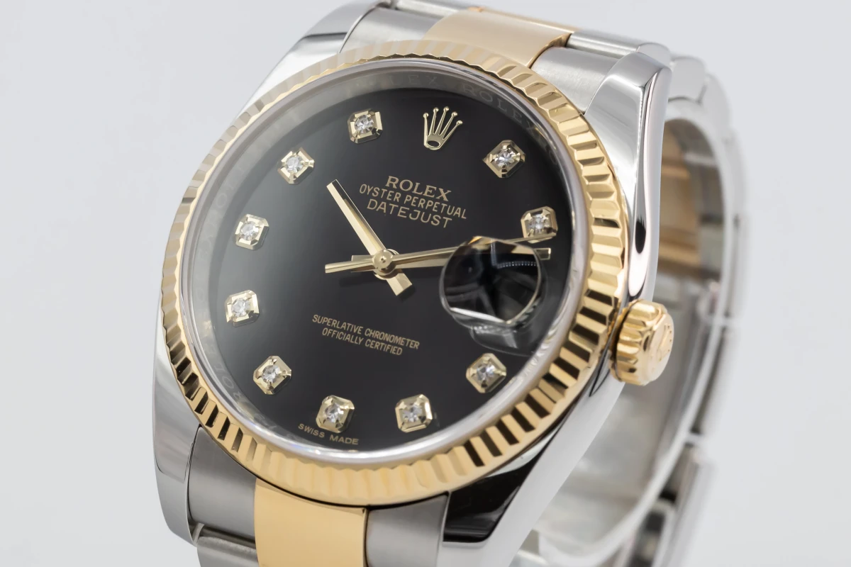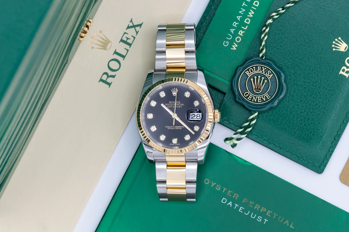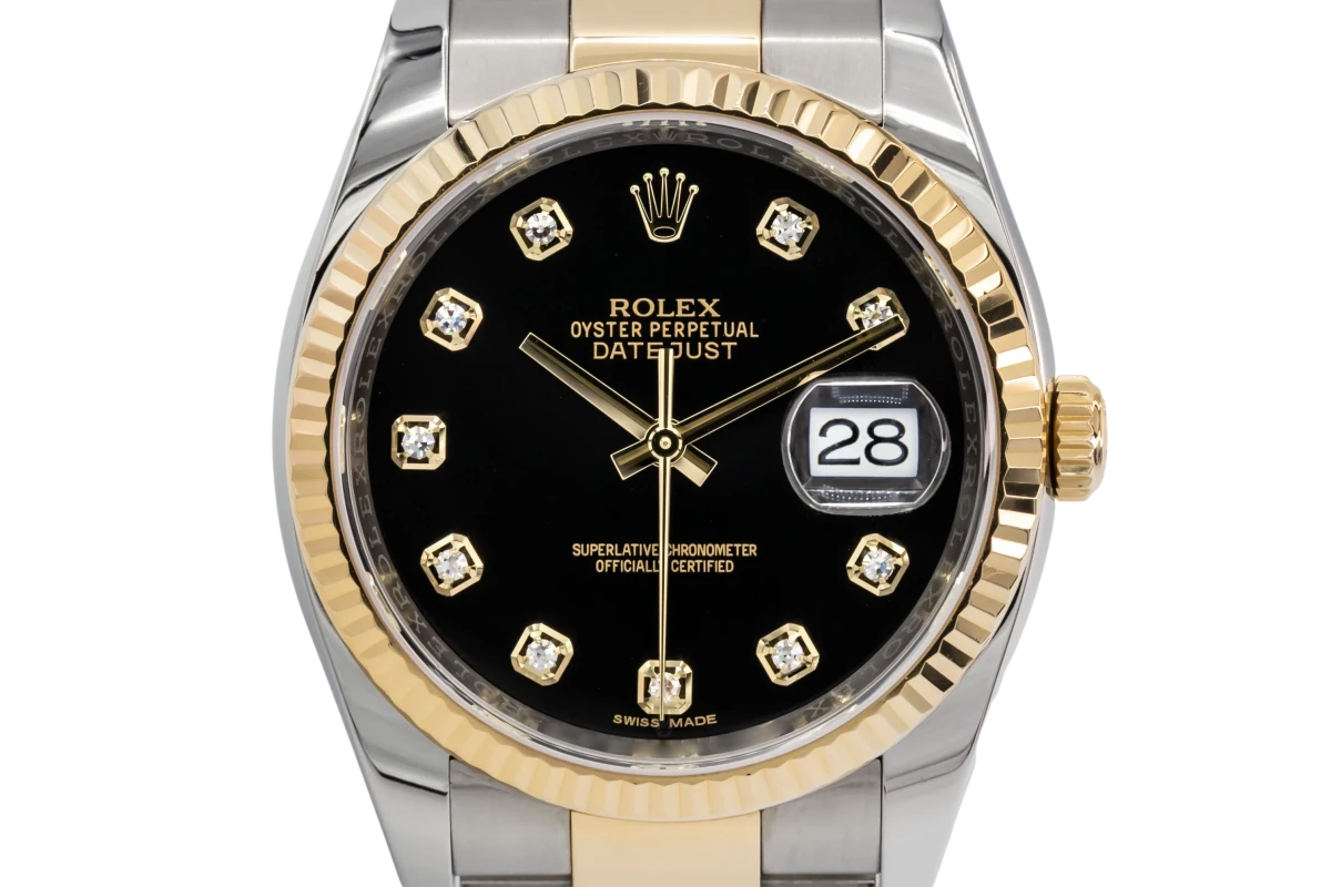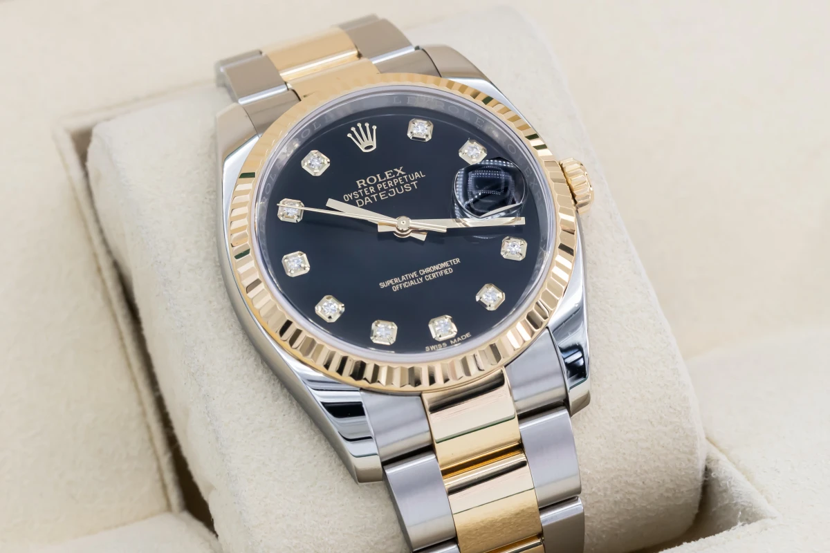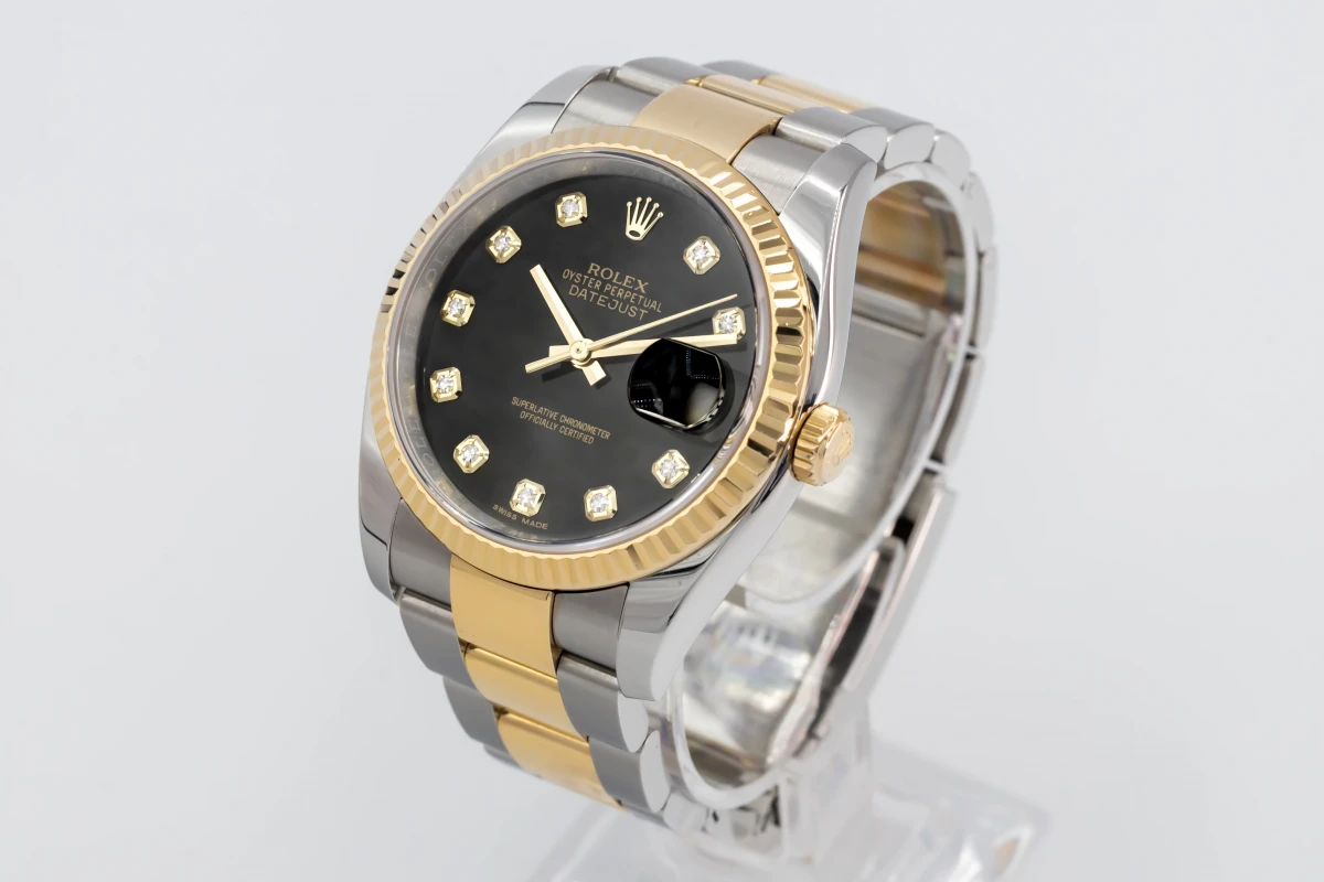 This 2017 Rolex DateJust features a 36mm black dial with factory diamond markers and a stainless steel and 18ct yellow gold oyster bracelet. It fitted with a 18ct yellow gold fluted bezel.