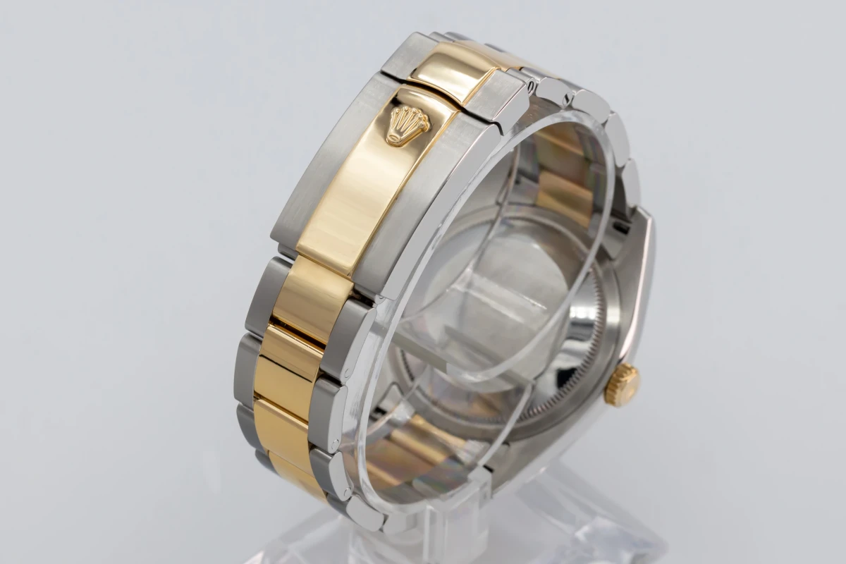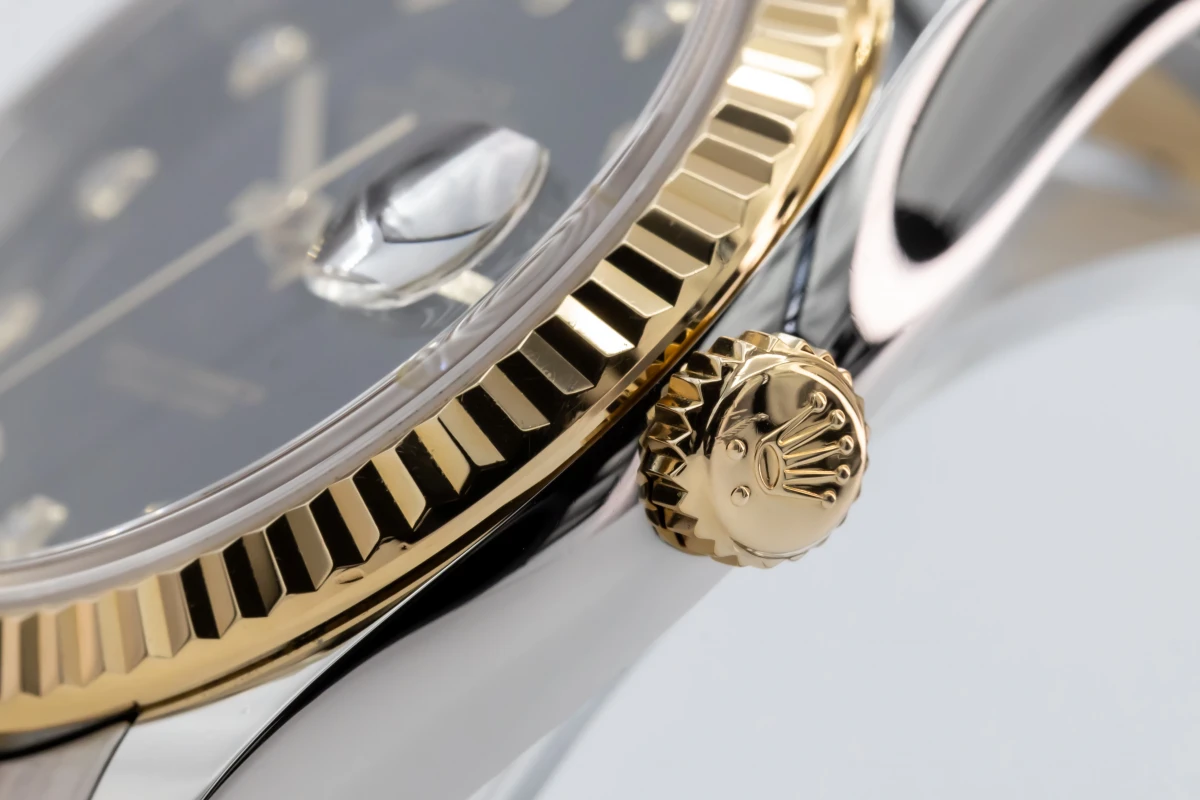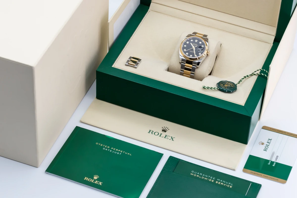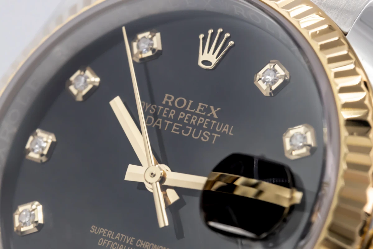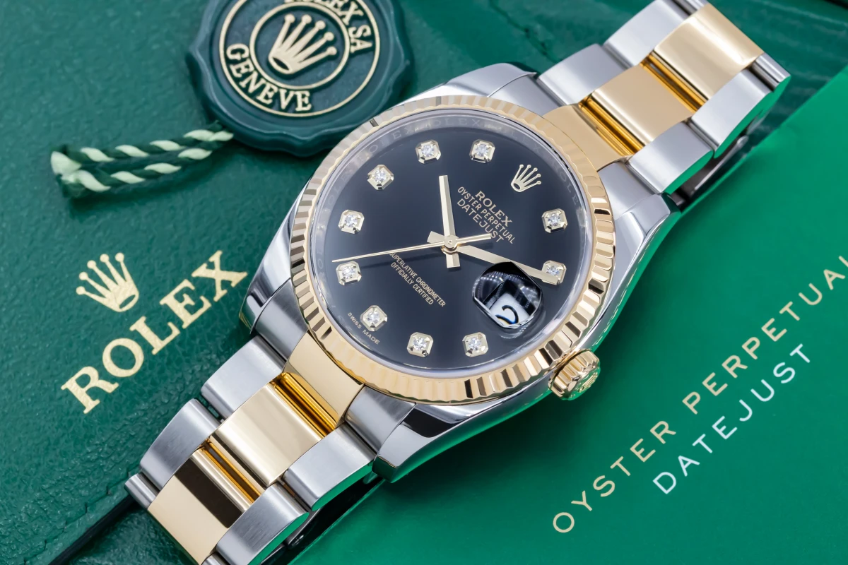 This 2017 Rolex DateJust features a 36mm black dial with factory diamond markers and a stainless steel and 18ct yellow gold oyster bracelet. It fitted with a 18ct yellow gold fluted bezel.