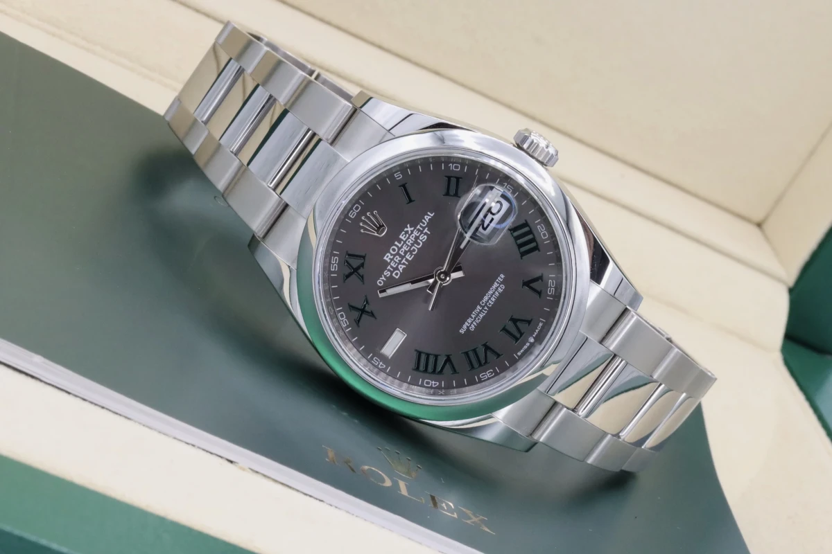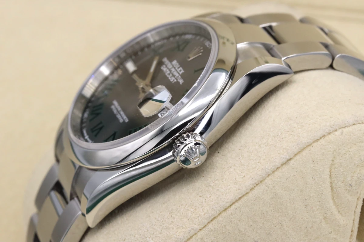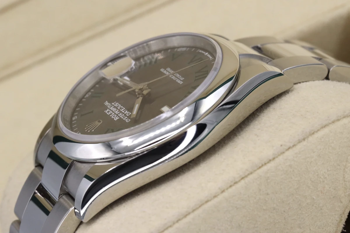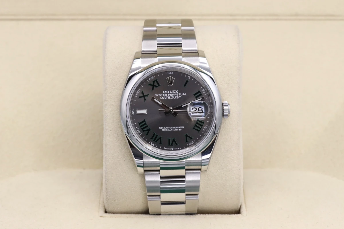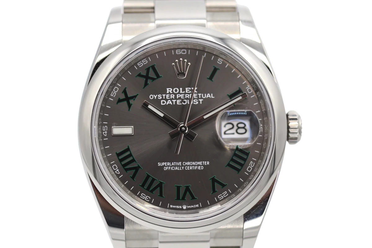 This 2021 Rolex DateJust features a 36mm slate gray and gren dial with roman numeral markers. It also features a stainless steel oyster bracelet and a stainless steel smooth bezel.
