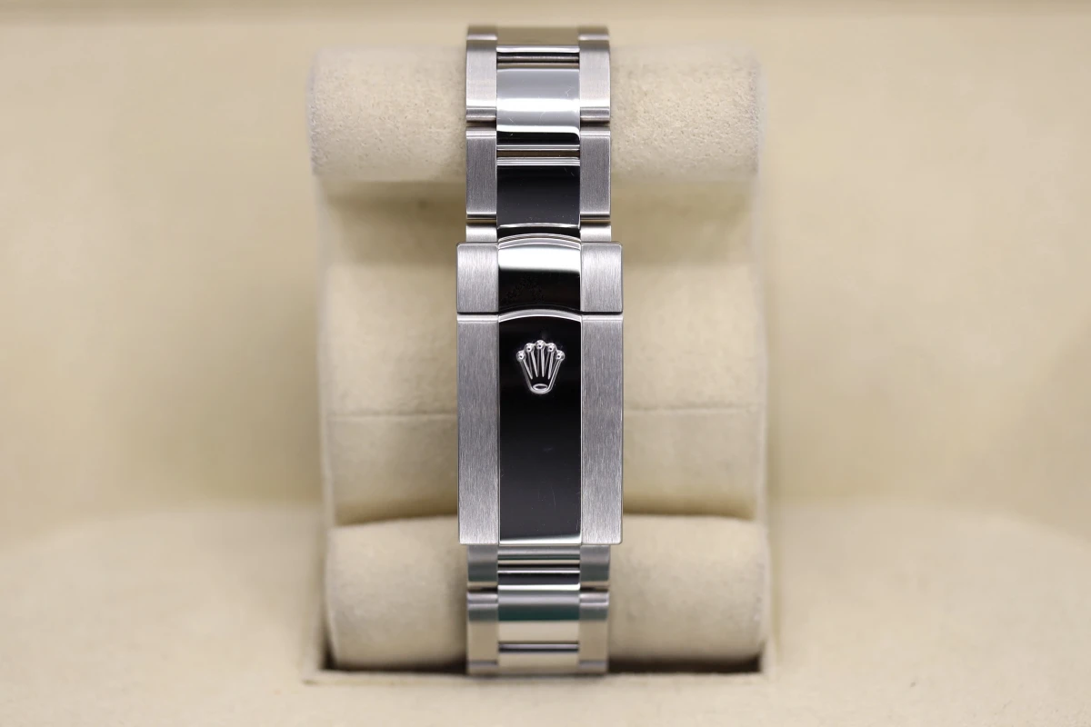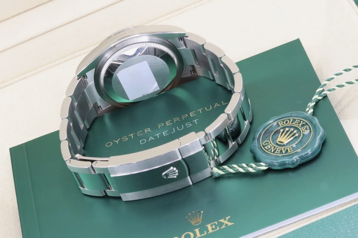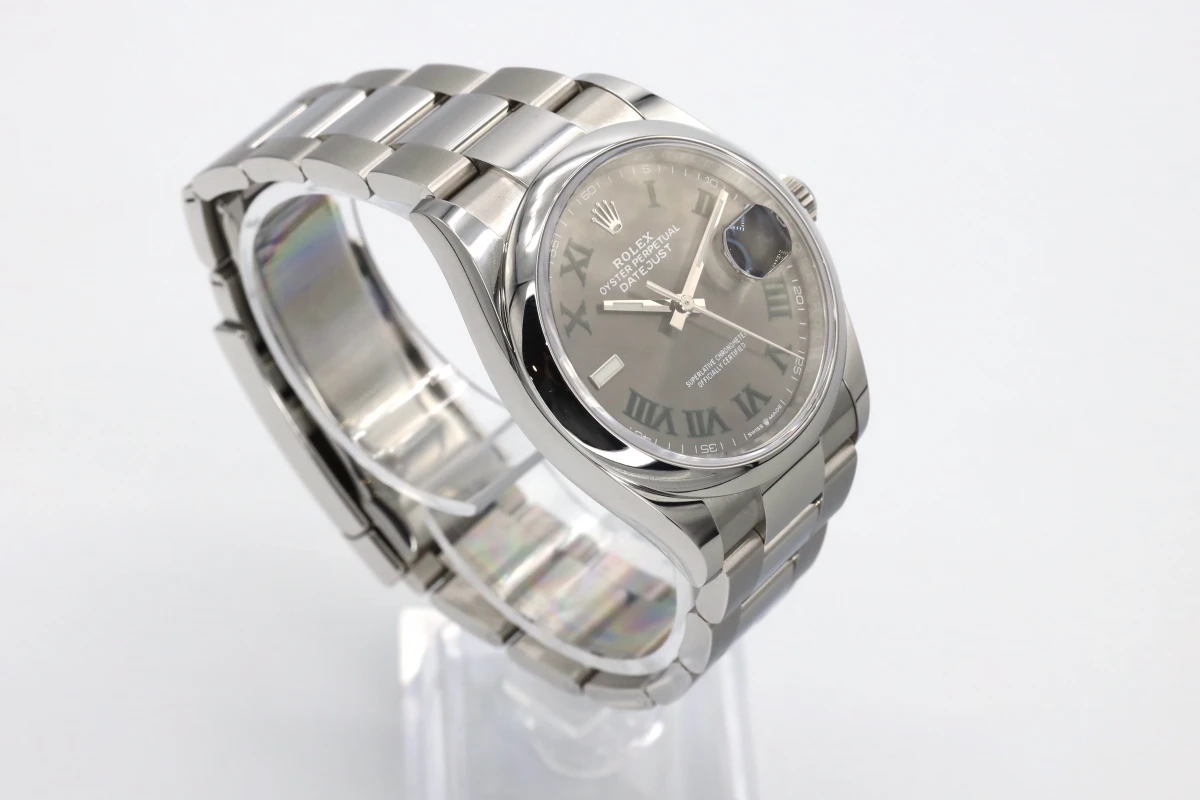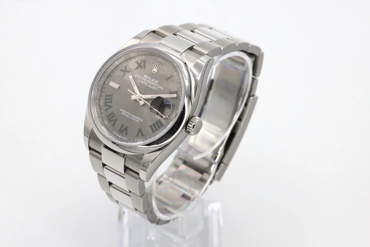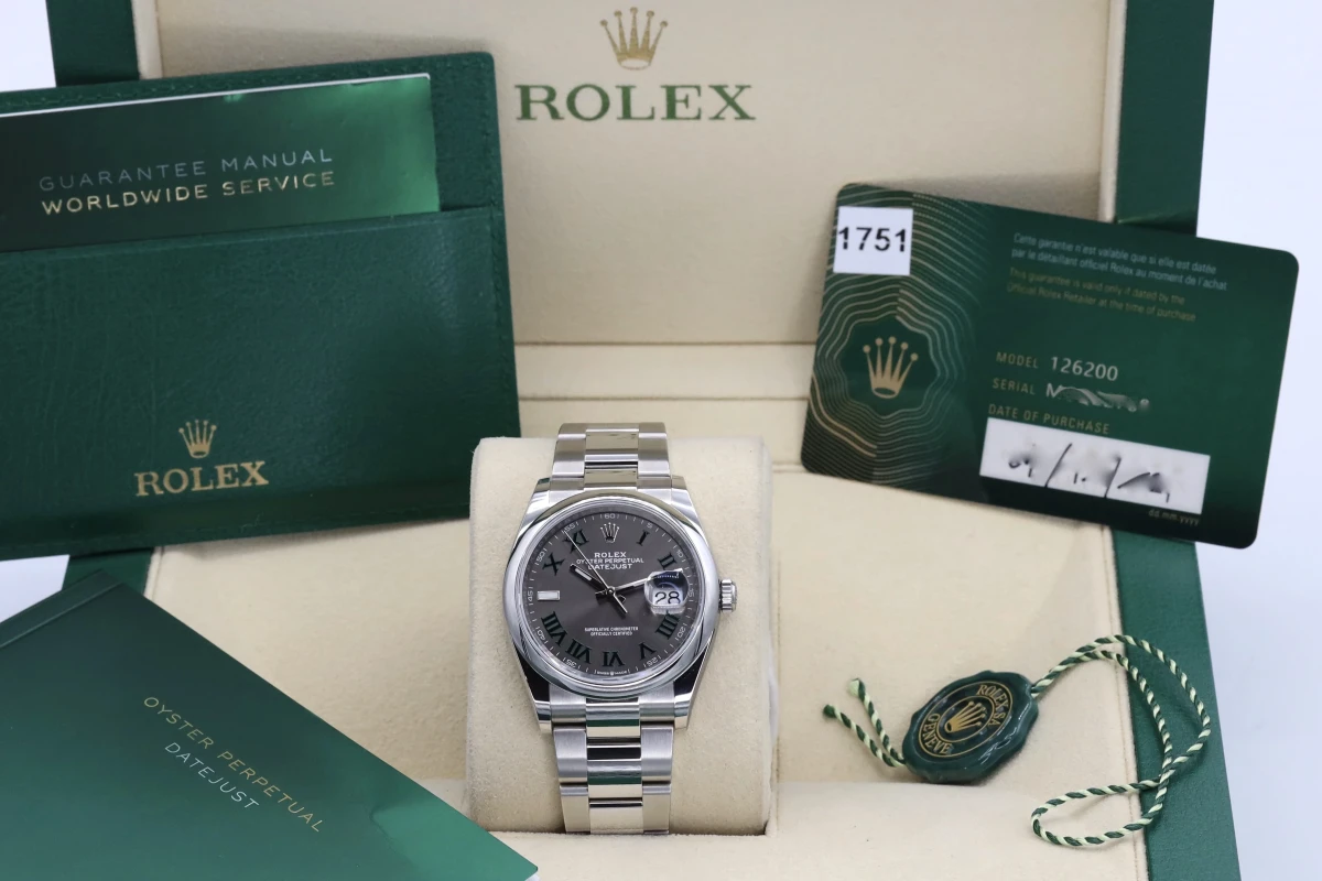 This 2021 Rolex DateJust features a 36mm slate gray and gren dial with roman numeral markers. It also features a stainless steel oyster bracelet and a stainless steel smooth bezel.