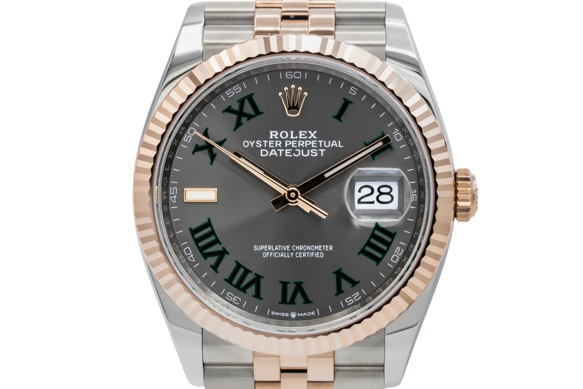 This unworn 2022 Rolex DateJust features a slate grey and green 'Wimbledon' roman numeral dial and a jubilee bracelet in steel 18ct rose gold. It is also fitted with a 18ct rose gold fluted bezel.