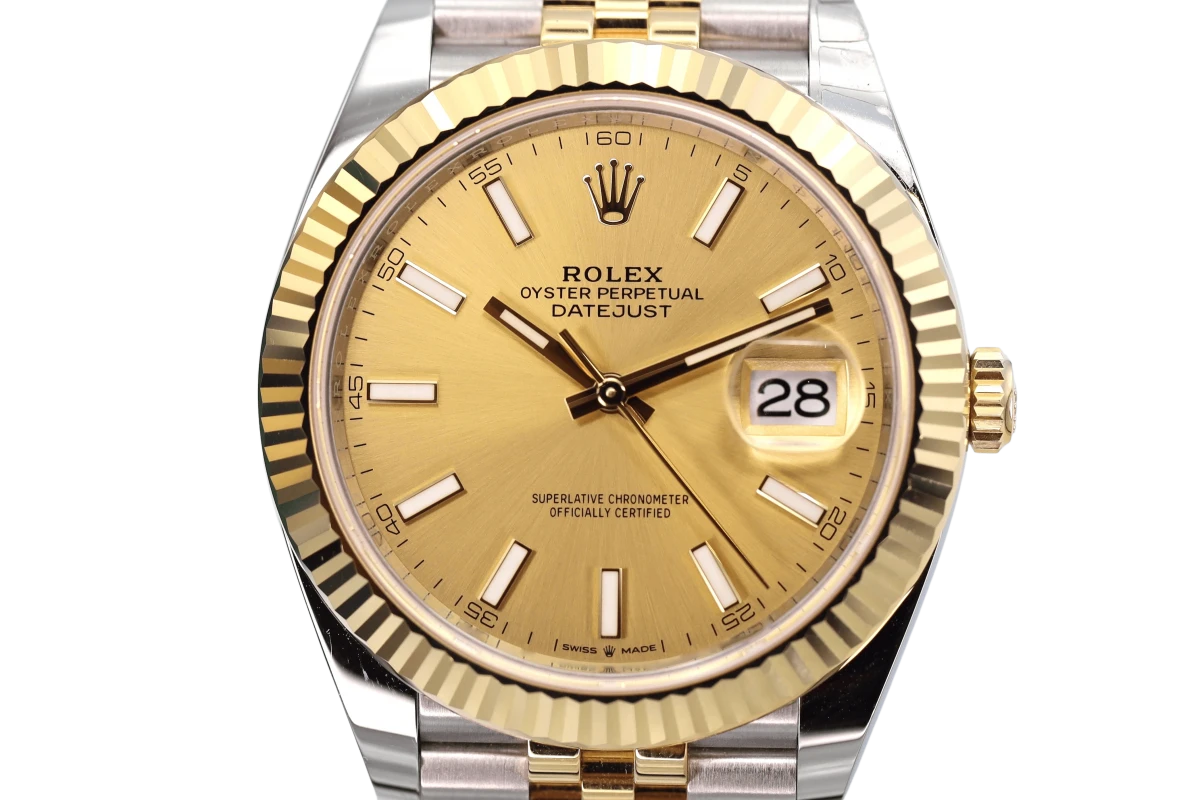 Unworn Rolex Datejust 41 Stainless steel & 18ct yellow gold on an Oyster Strap with an 18ct yellow gold fluted bezel and champagne index dial. 2021 unworn with Box & papers Ref 126333