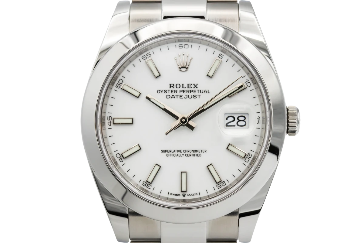This 2022 Rolex DateJust 41mm features a white dial with baton markers and a stainless steel oyster bracelet. It fitted with a stainless steel smooth bezel.
