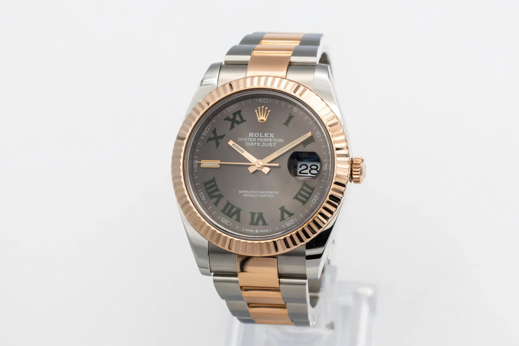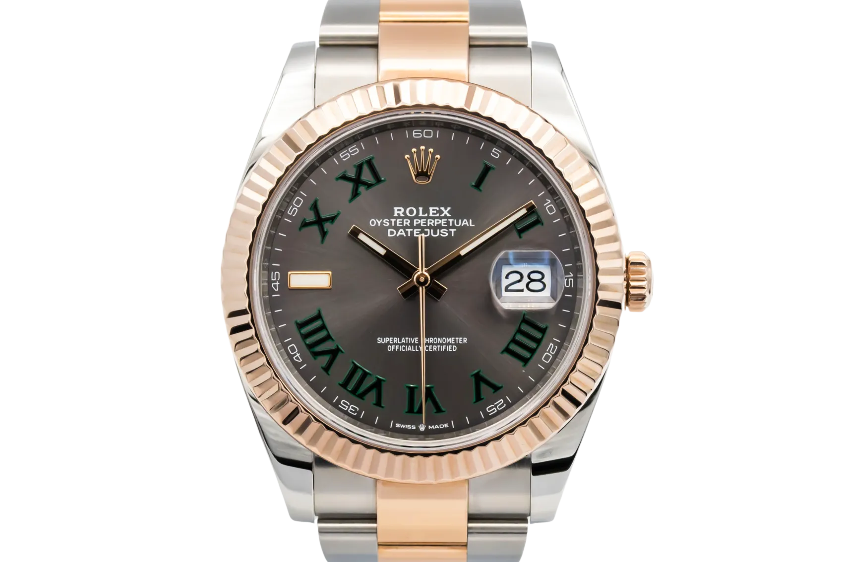finance this from £164.14 p/m call the shop Read about our Limited Lifetime WarrantyThis 2020 Rolex DateJust 41mm is a refined two-tone timepiece crafted in stainless steel and 18ct Everose gold, featuring the distinctive Wimbledon dial with slate grey finish, green Roman numerals and the signature date display at 3 o’clock. Finished with a smooth bezel and Oyster bracelet.