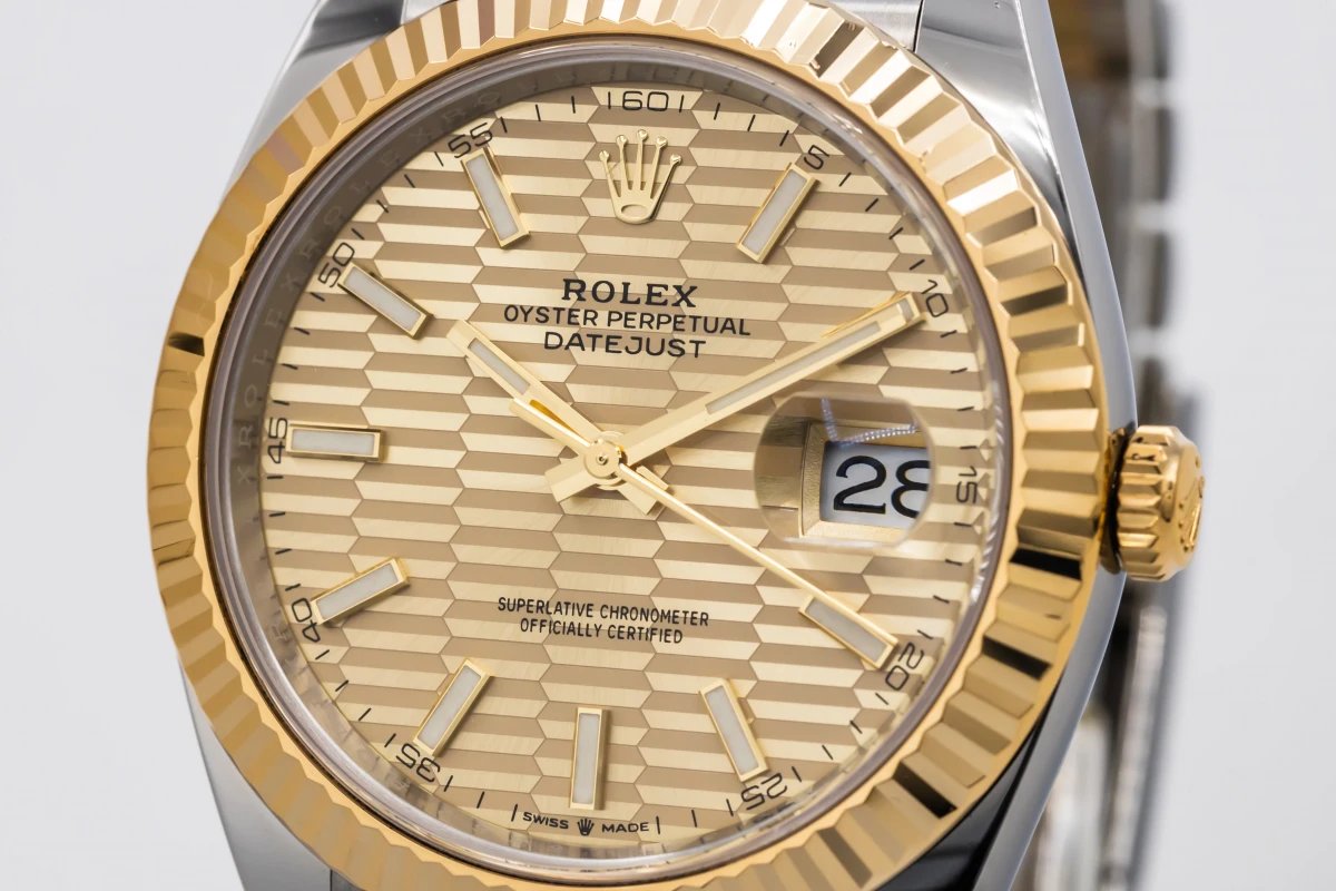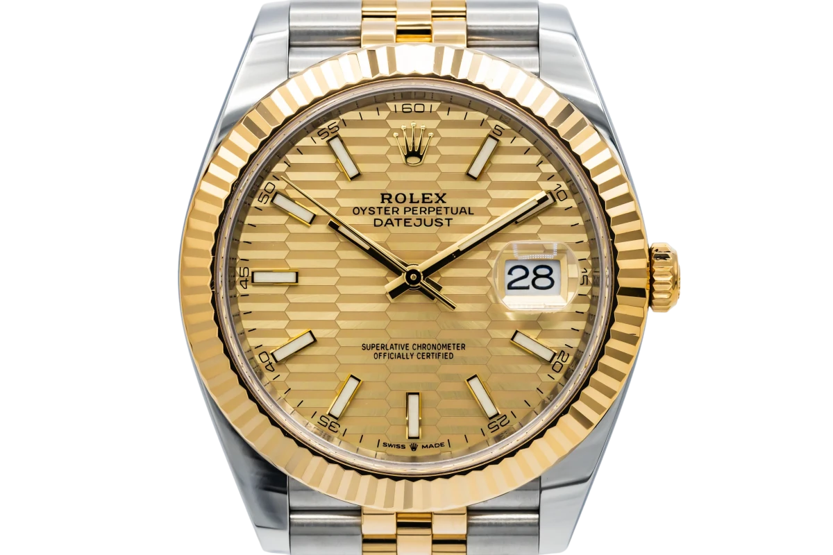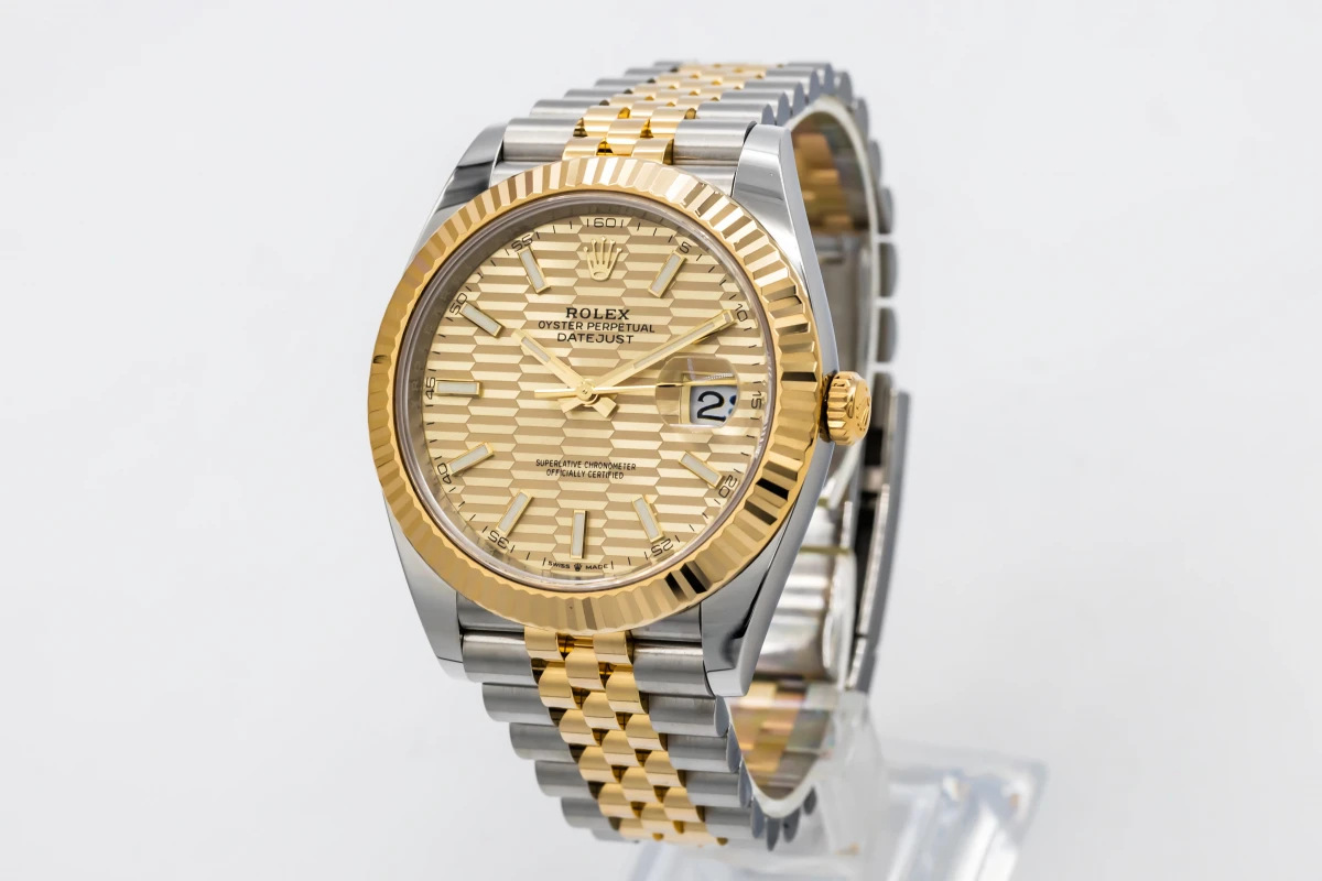 This 2022 Rolex DateJust 41mm features a champagne motif dial with baton markers and a stainless steel and 18ct yellow gold jubilee bracelet. It fitted with a 18ct yellow gold fluted bezel.