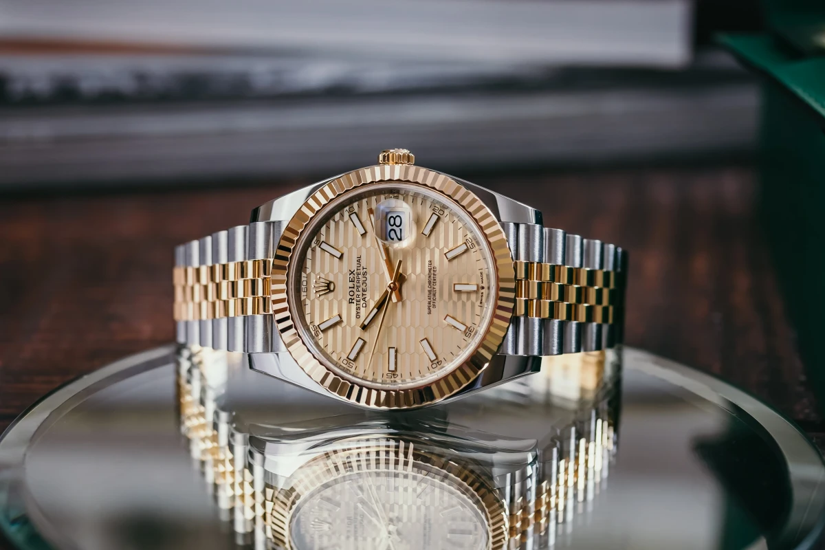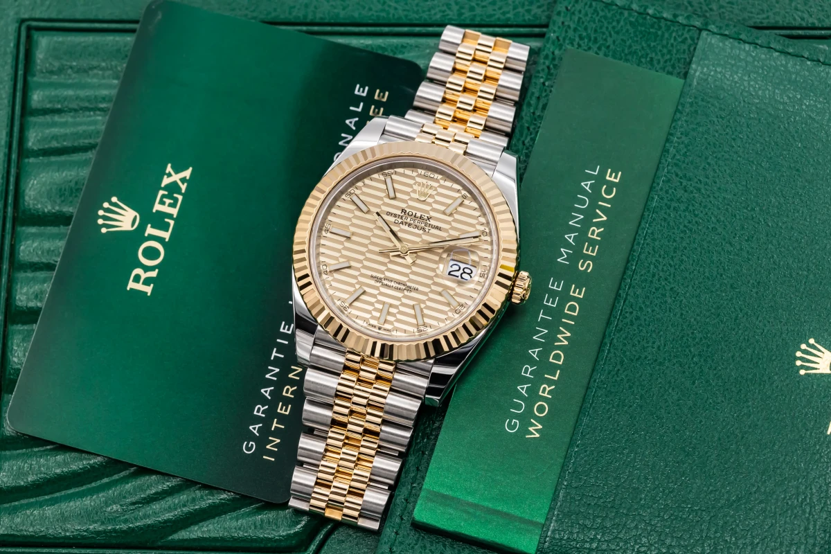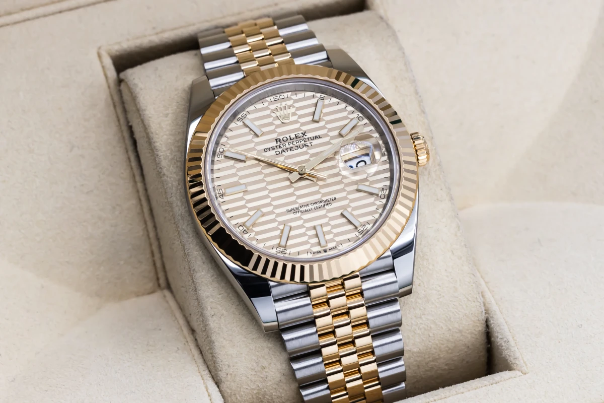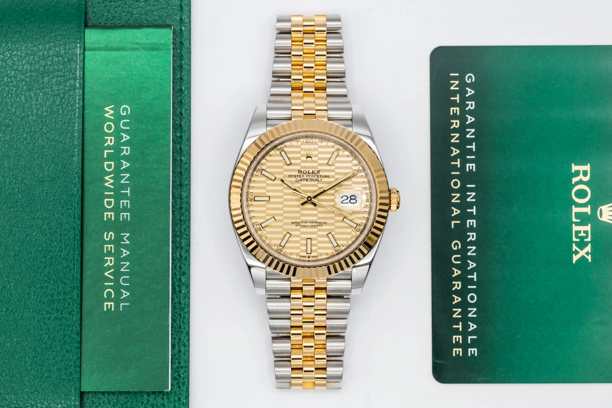 This 2022 Rolex DateJust 41mm features a champagne motif dial with baton markers and a stainless steel and 18ct yellow gold jubilee bracelet. It fitted with a 18ct yellow gold fluted bezel.