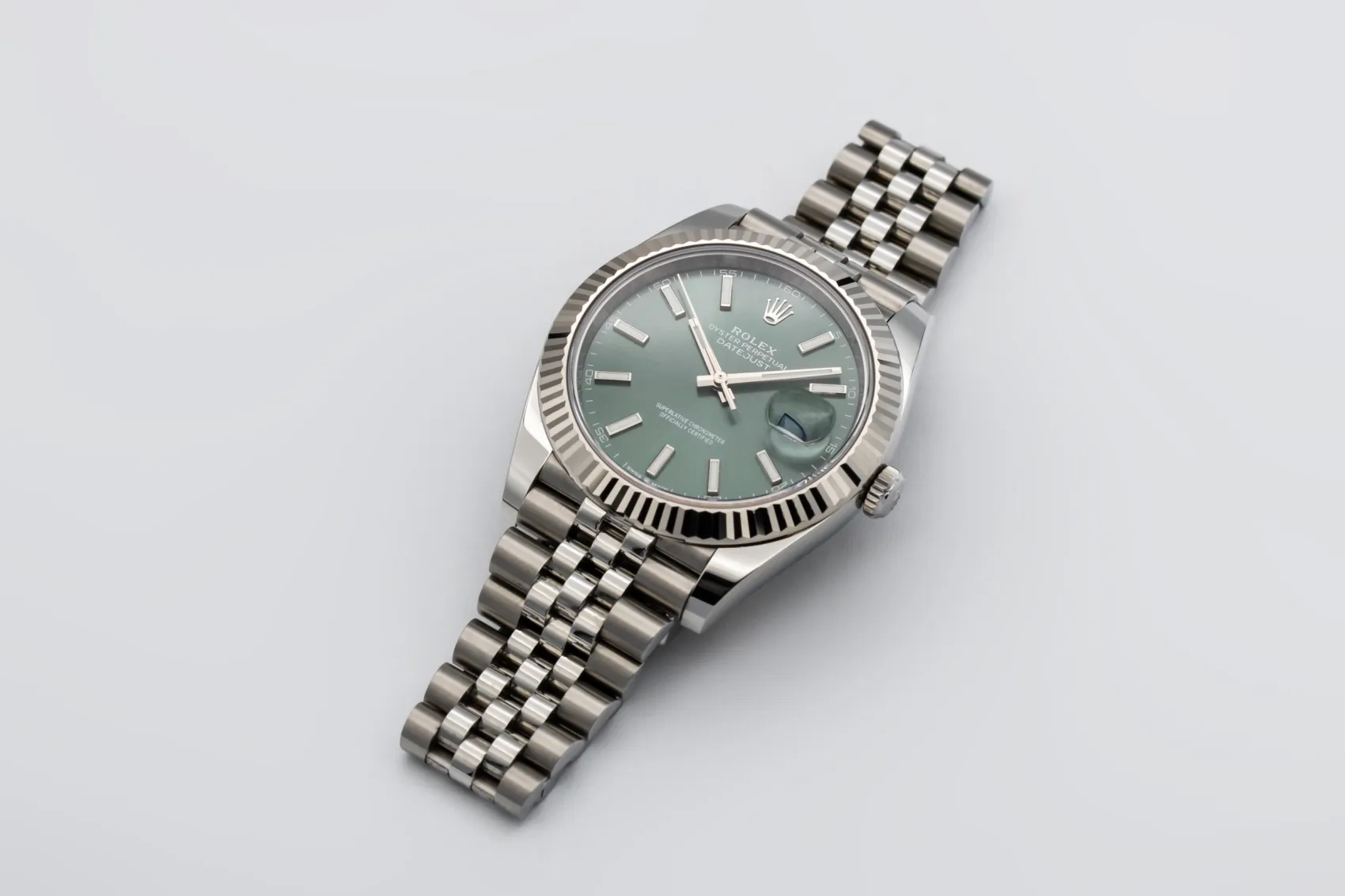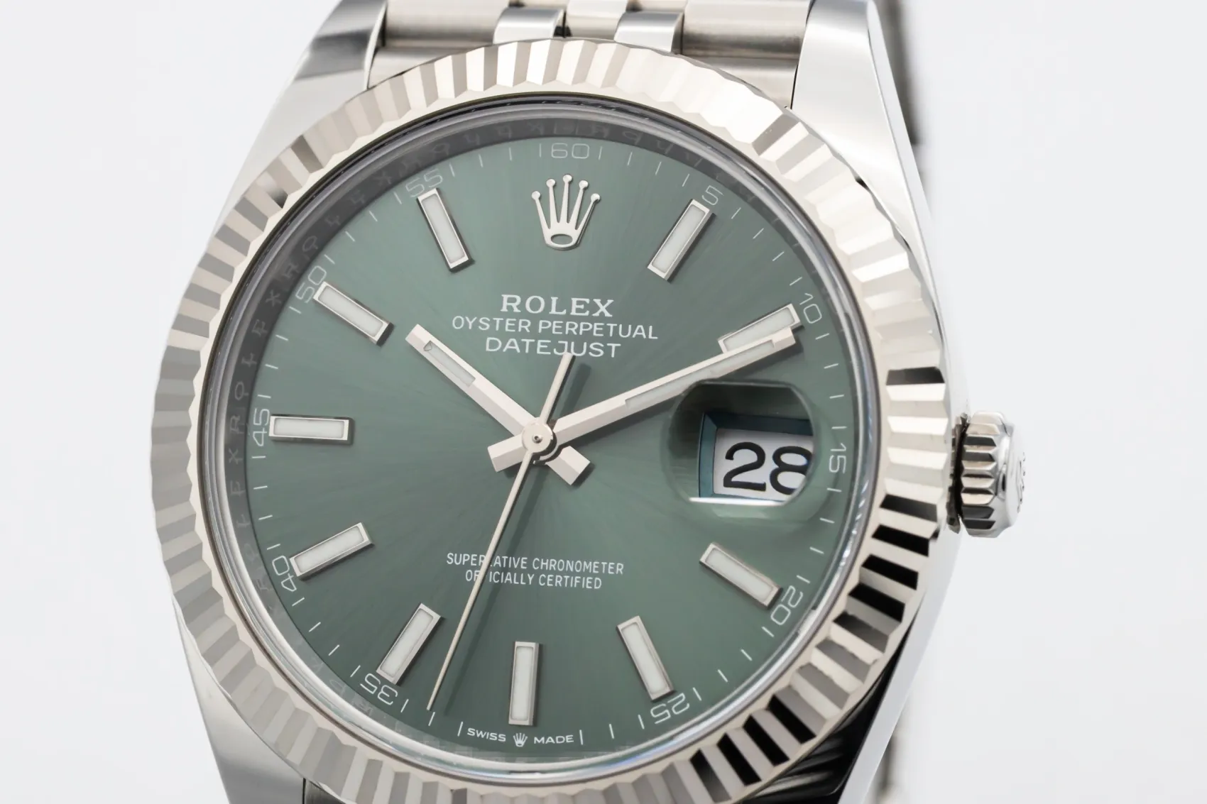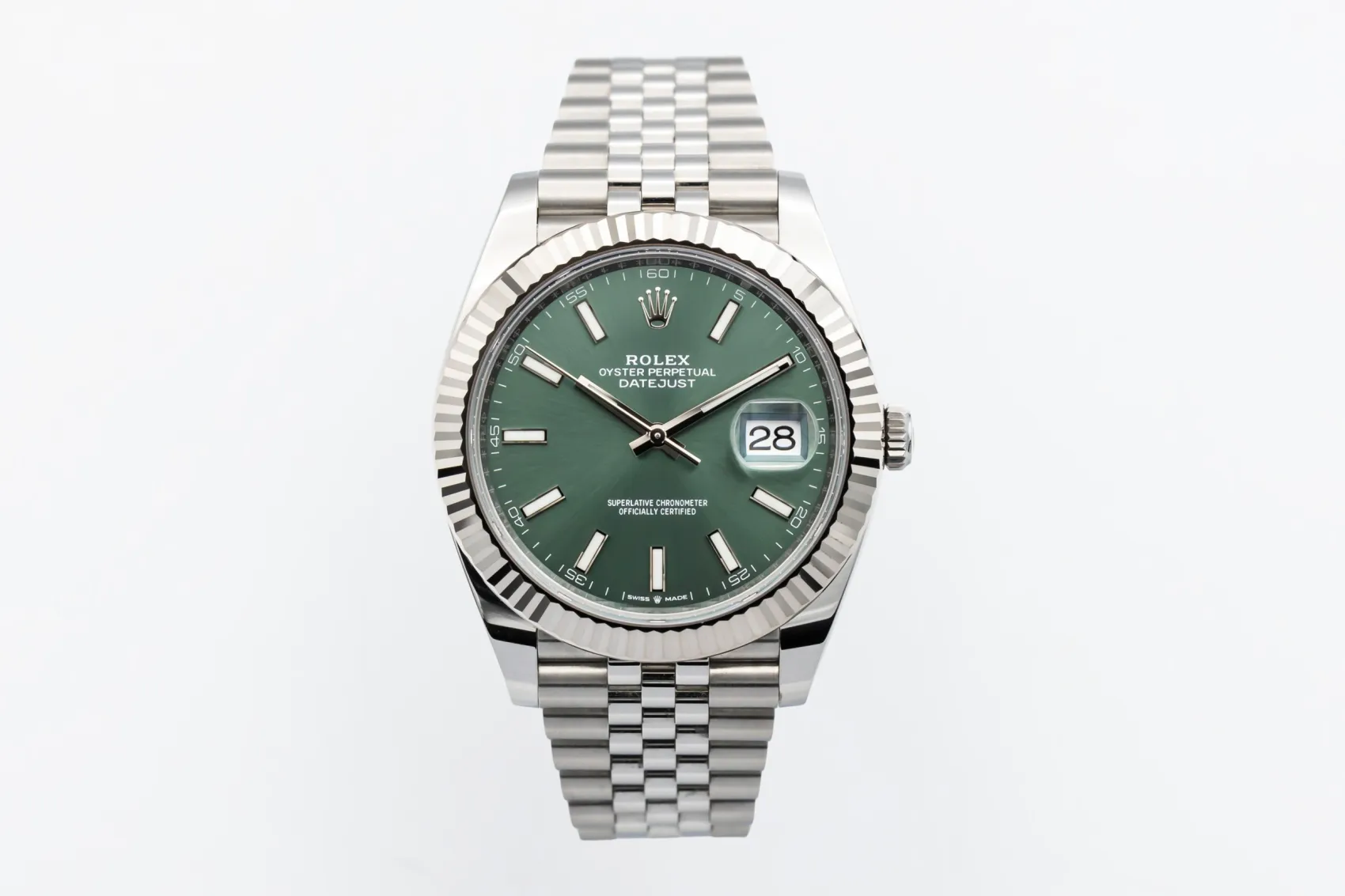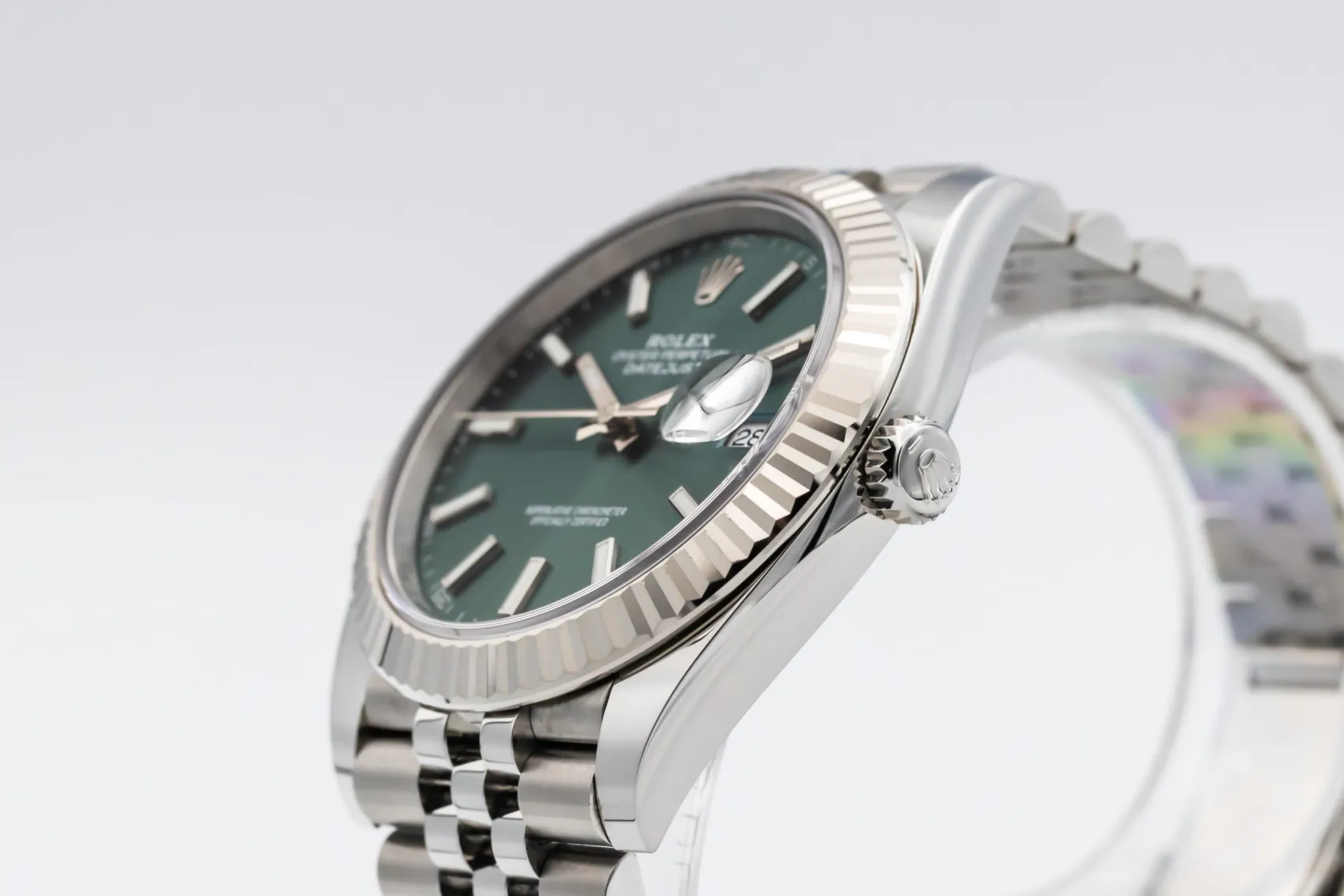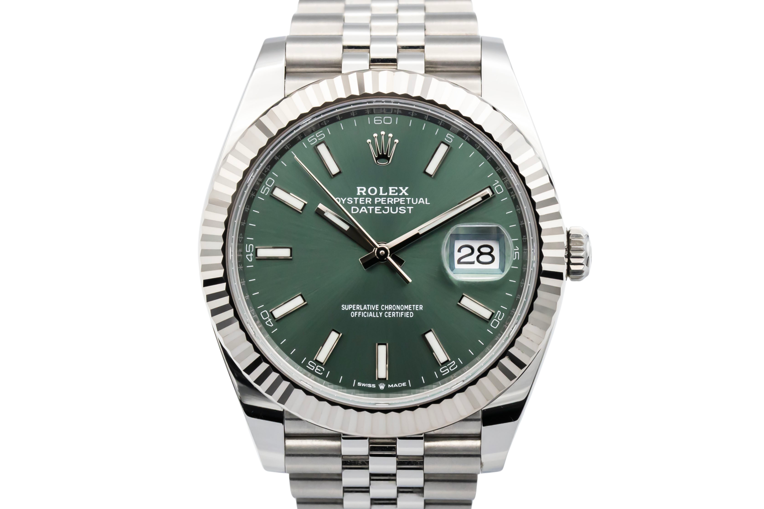 finance this from £192.29 p/m call the shop Read about our Limited Lifetime WarrantyThis 2024 Rolex DateJust 41mm is a refined luxury timepiece crafted in Oystersteel with a distinctive fluted white gold bezel. The green dial features baton hour markers and the signature date window at 3 o’clock with Rolex’s Cyclops lens for enhanced legibility. Finished on the elegant stainless steel Jubilee bracelet.