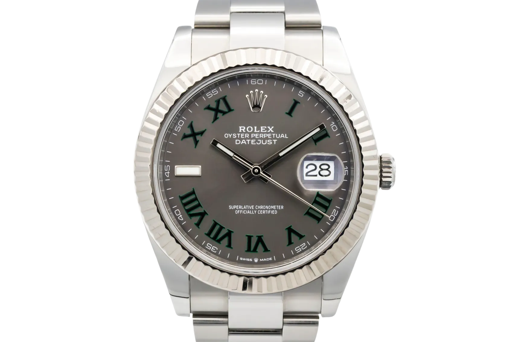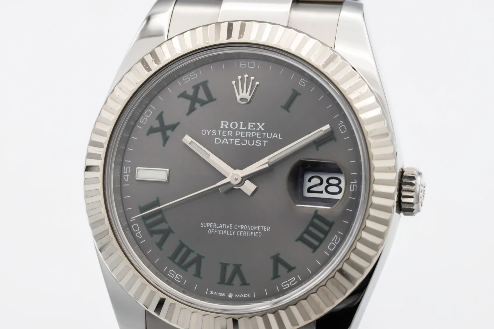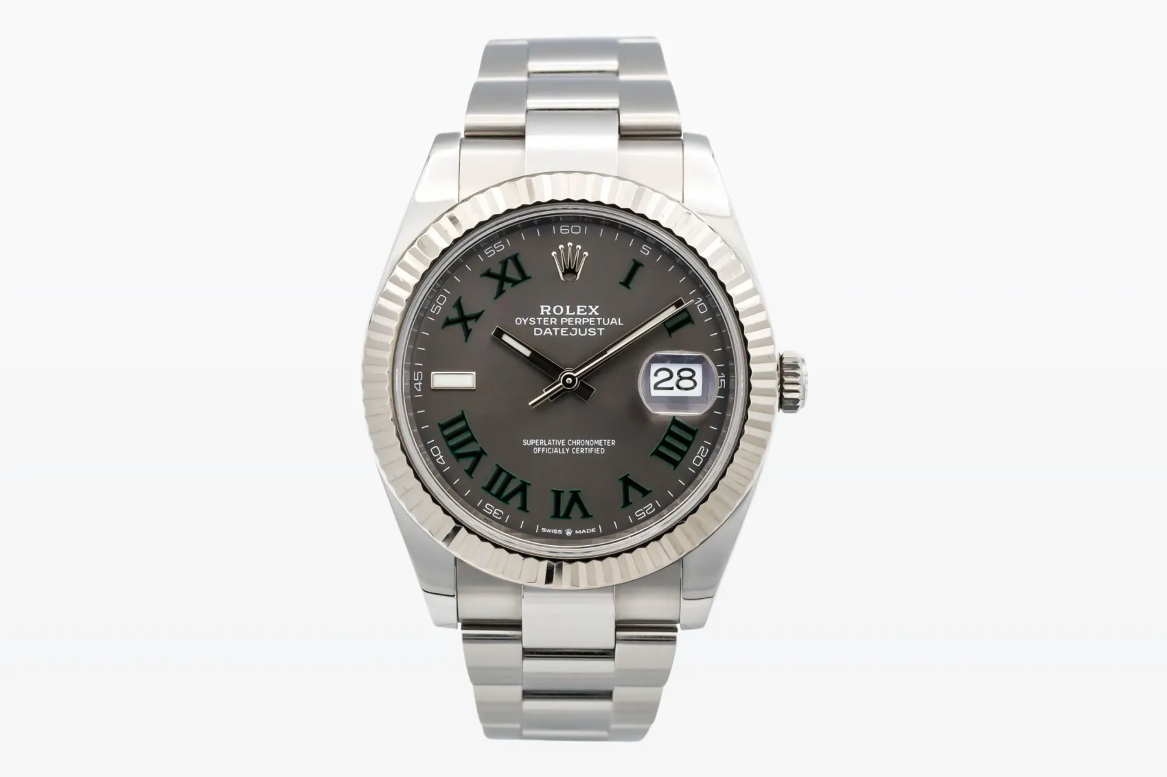 finance this from £161.01 p/m call the shop Read about our Limited Lifetime WarrantyThis 2021 Rolex DateJust 41mm ‘Wimbledon’ is a distinctive and modern luxury timepiece crafted in stainless steel with a fluted white gold bezel. The slate dial features the signature green Roman numeral hour markers that define the Wimbledon model, alongside the date window at 3 o’clock with Rolex’s Cyclops lens for enhanced legibility. Finished on the sporty stainless steel Oyster bracelet.