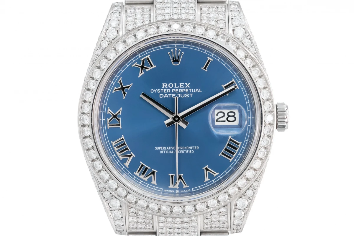 This 2019 Rolex DateJust features a 41mm azzuro dial with roman numeral markers and a full custom diamond stainless steel oyster bracelet. It is also fitted with a full custom stainless steel bezel.