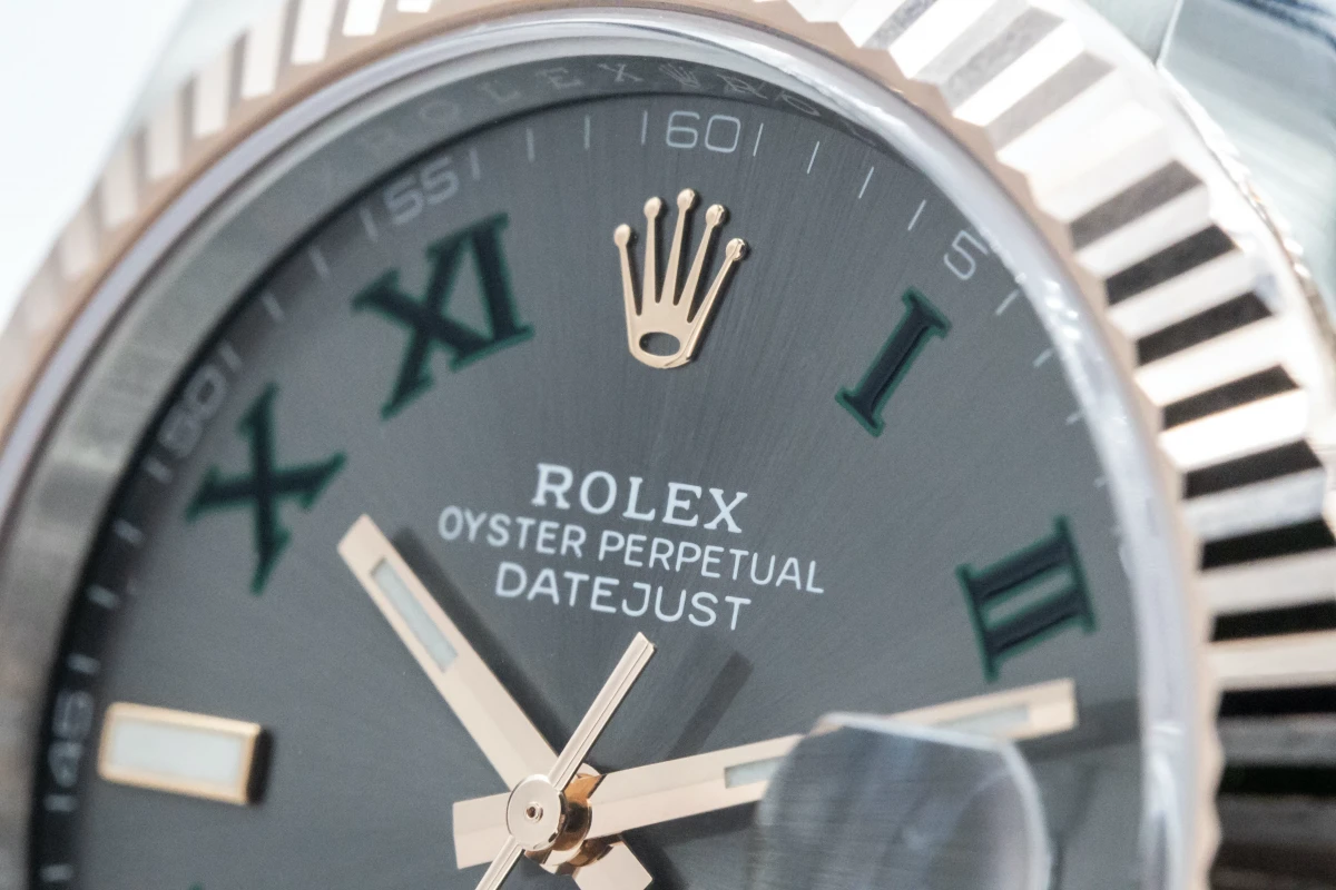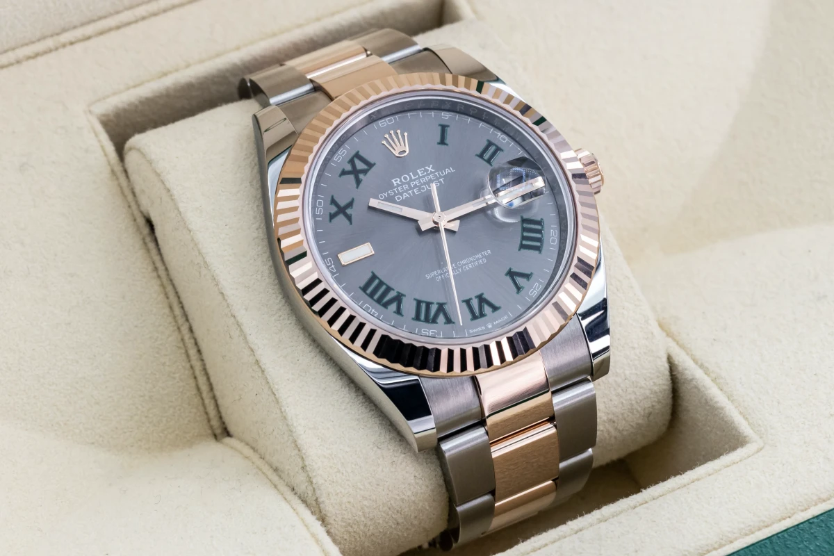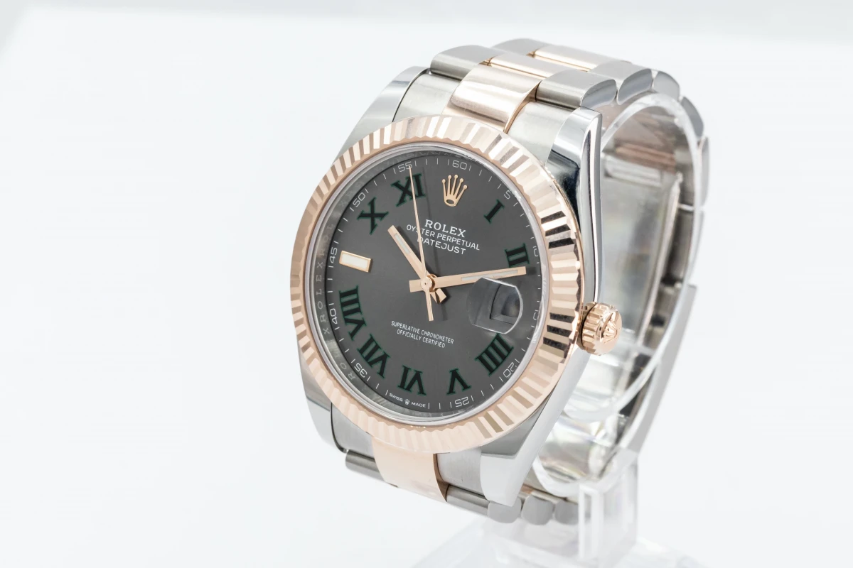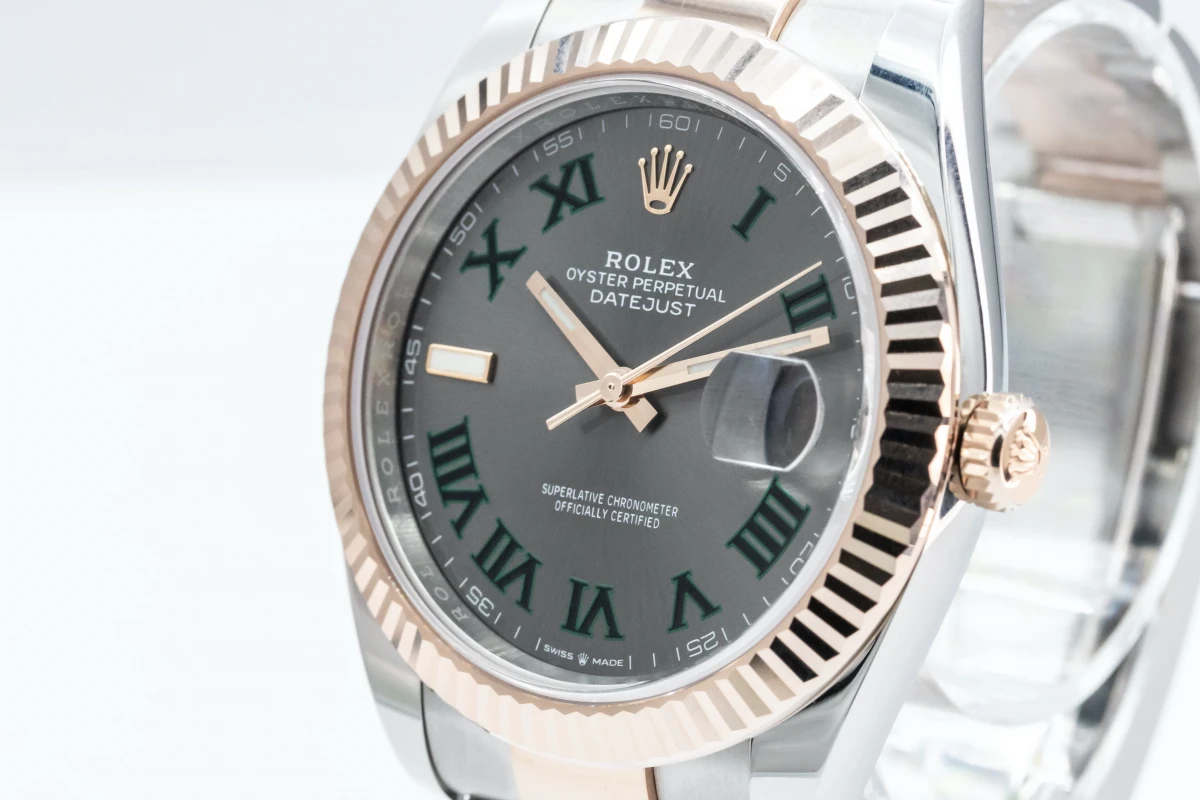 This 2022 unworn Rolex DateJust 'Wimbledon' features a 41mm slate grey and green dial with roman numeral markers. It also features a stainless steel and 18ct everose oyster bracelet with a 18ct everose fluted bezel.