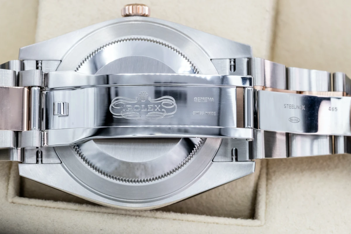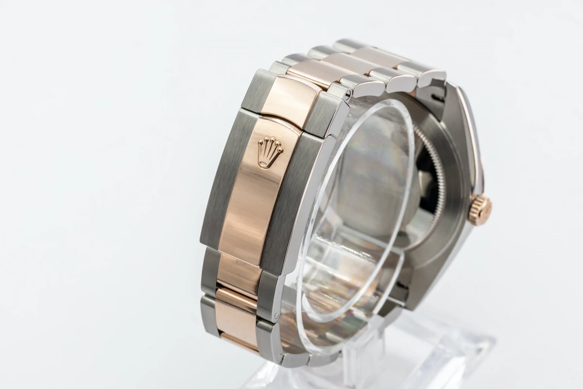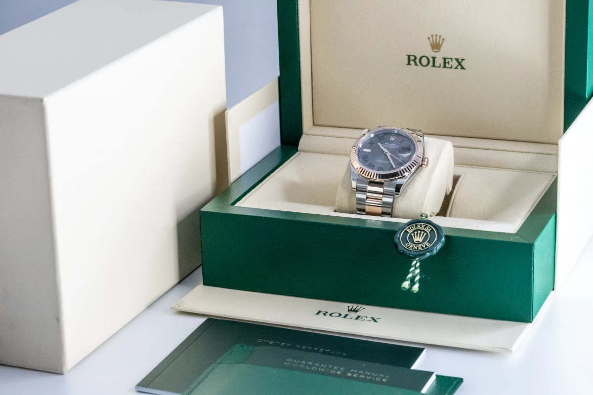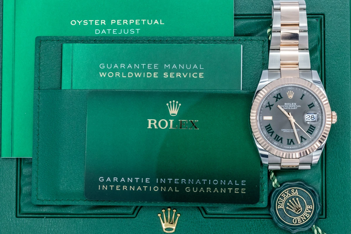 This 2022 unworn Rolex DateJust 'Wimbledon' features a 41mm slate grey and green dial with roman numeral markers. It also features a stainless steel and 18ct everose oyster bracelet with a 18ct everose fluted bezel.