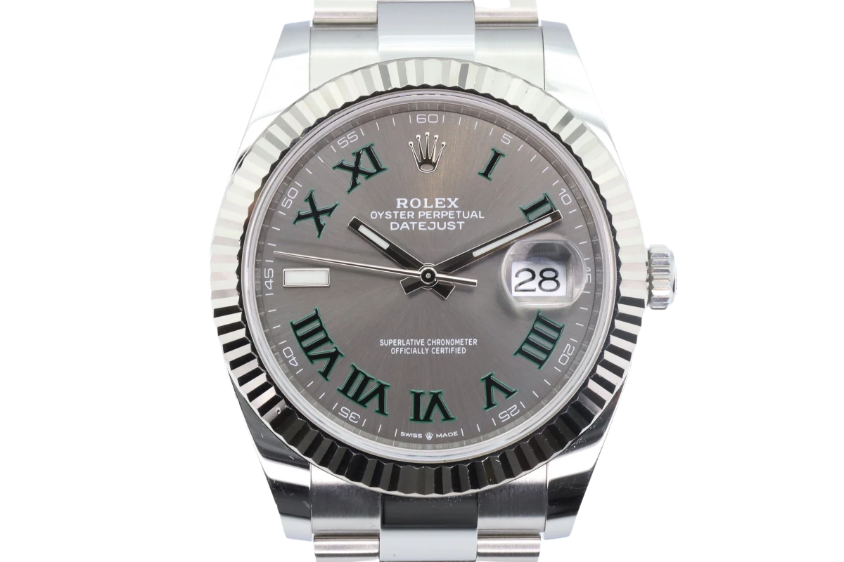 This unworn 2021 Rolex DateJust features a 41mm slate grey and green roman numeral dial known as the 'Wimbledon', and a stainless steel oyster bracelet.