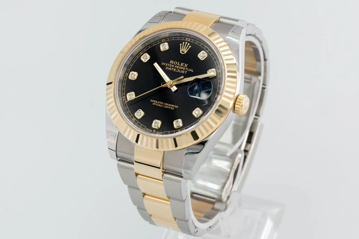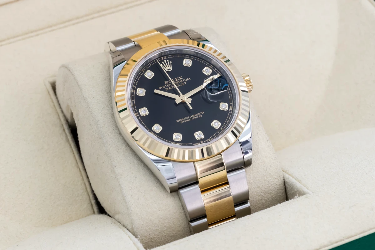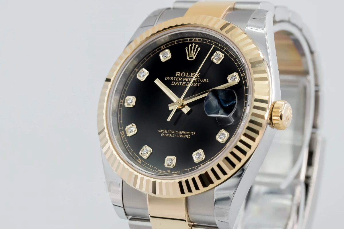 This 2022 Unworn Rolex DateJust Features A 41mm Black Factory Diamond Dial, A Stainless Steel & 18ct Yellow Gold Oyster Bracelet And A 18ct Yellow Gold Fluted Bezel.