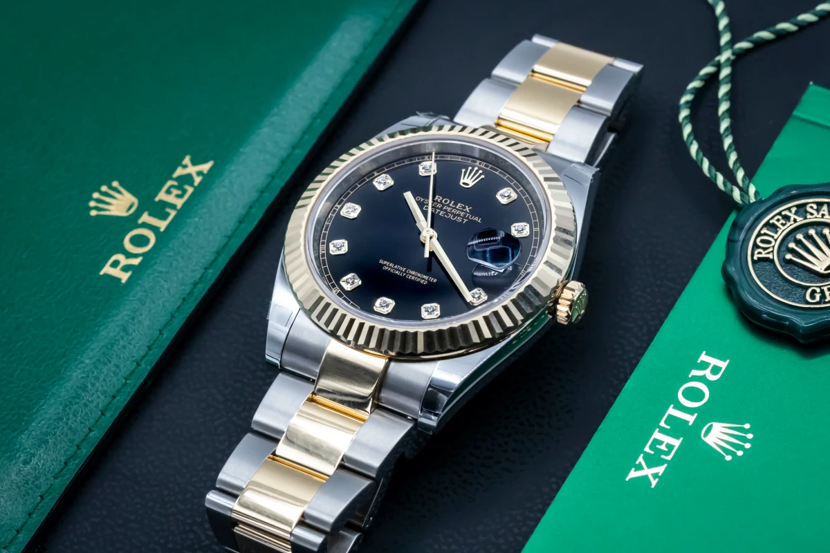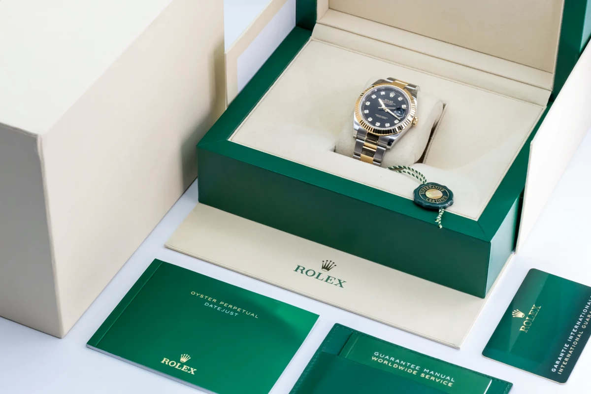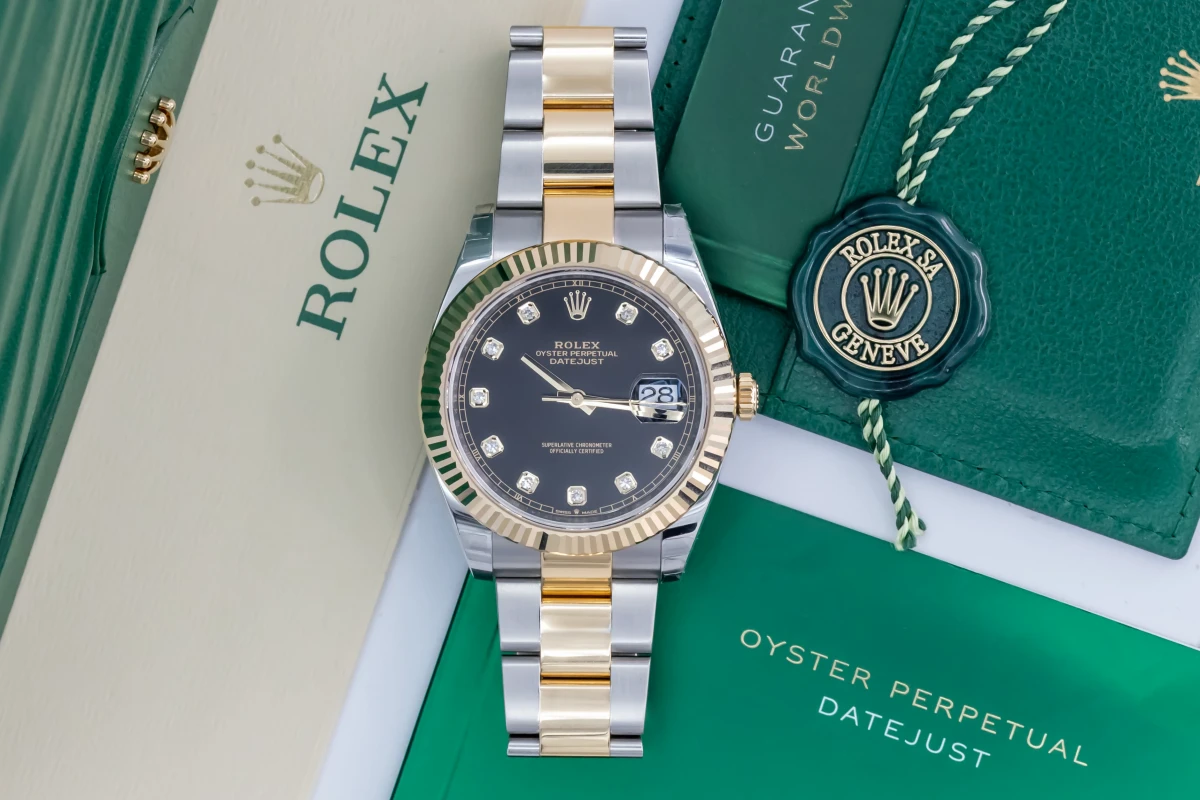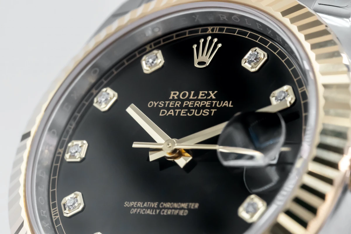 This 2022 Unworn Rolex DateJust Features A 41mm Black Factory Diamond Dial, A Stainless Steel & 18ct Yellow Gold Oyster Bracelet And A 18ct Yellow Gold Fluted Bezel.
