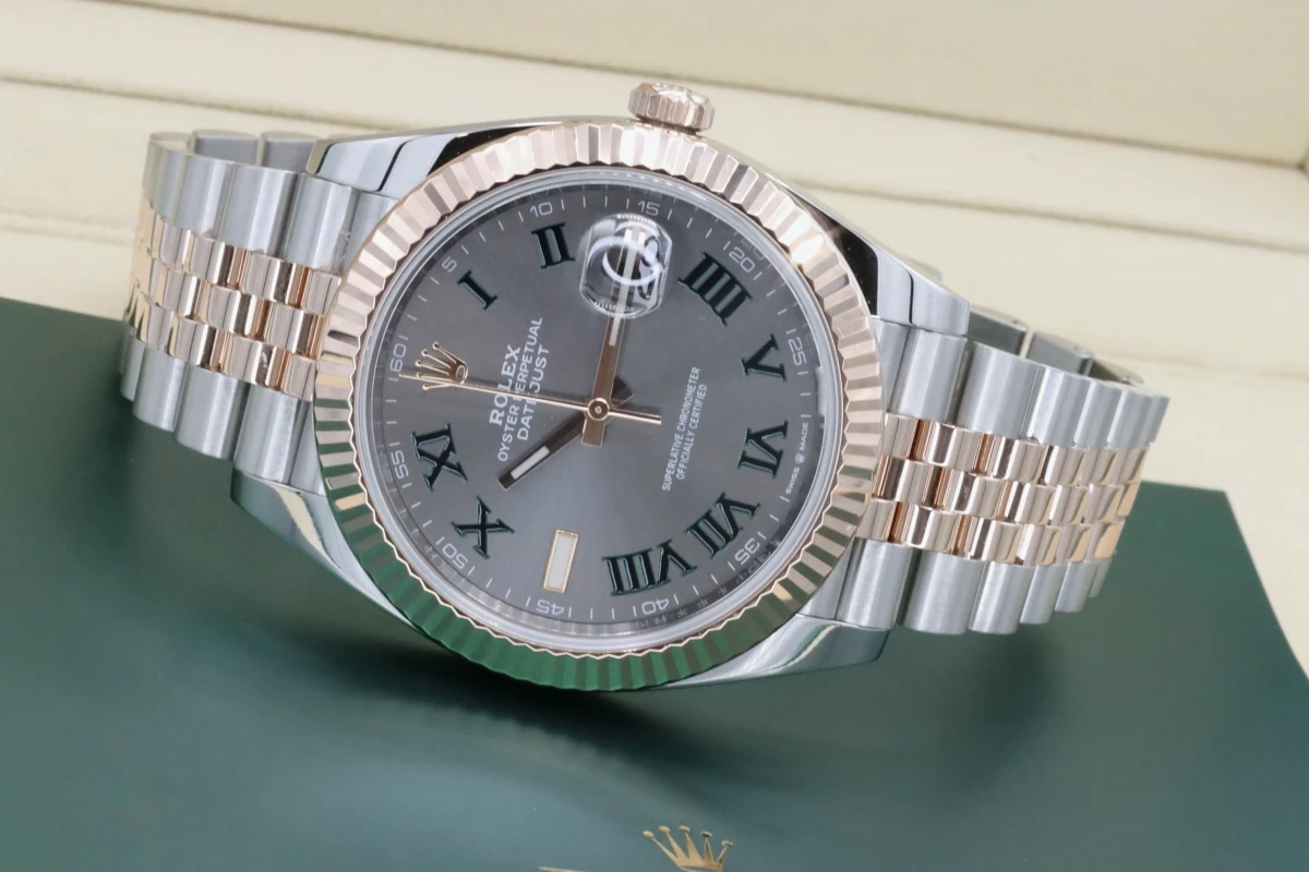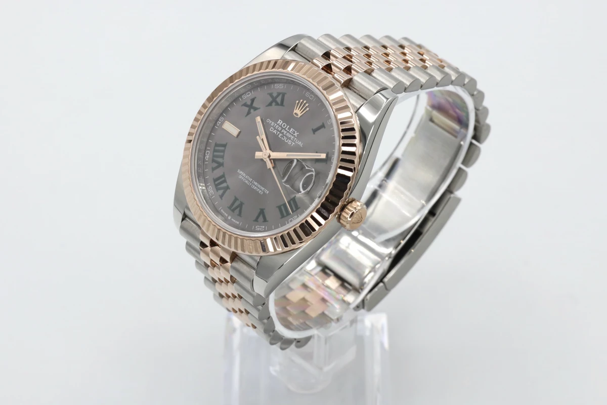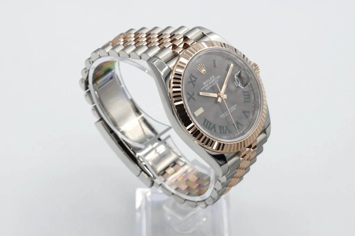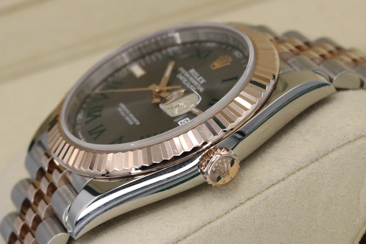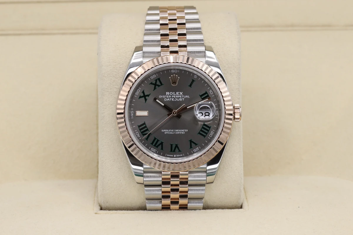 This 2021 Rolex DateJust features a 41mm Slate Gray and Green Dial "Wimbledon" A Steel and Everose Jubilee Bracelet and a Rose Gold Fluted Bezel.