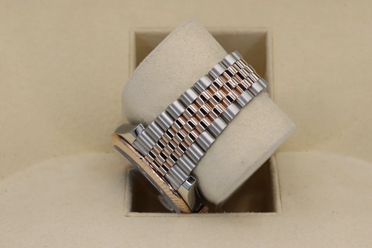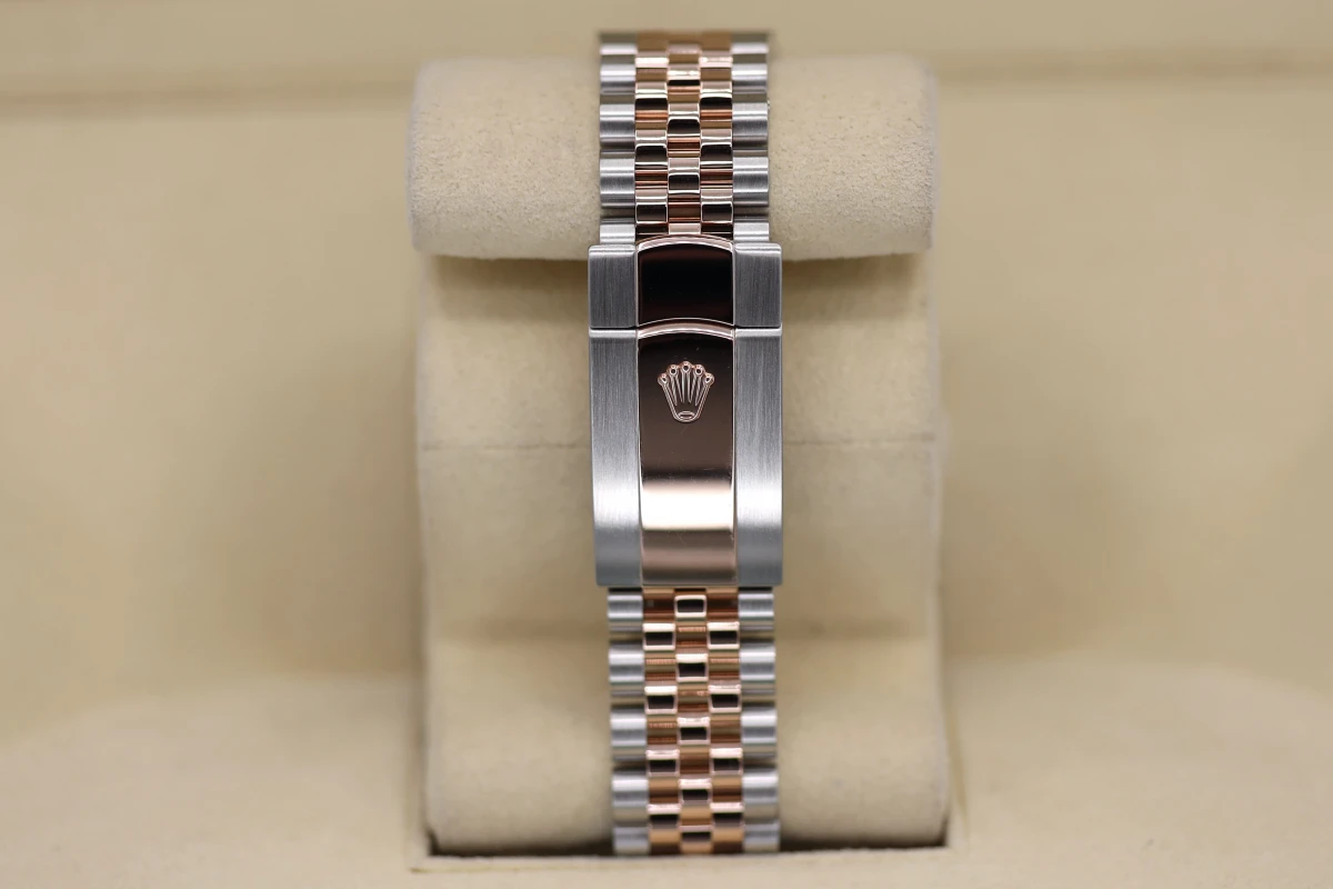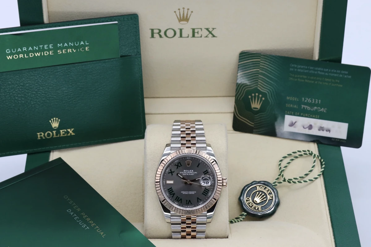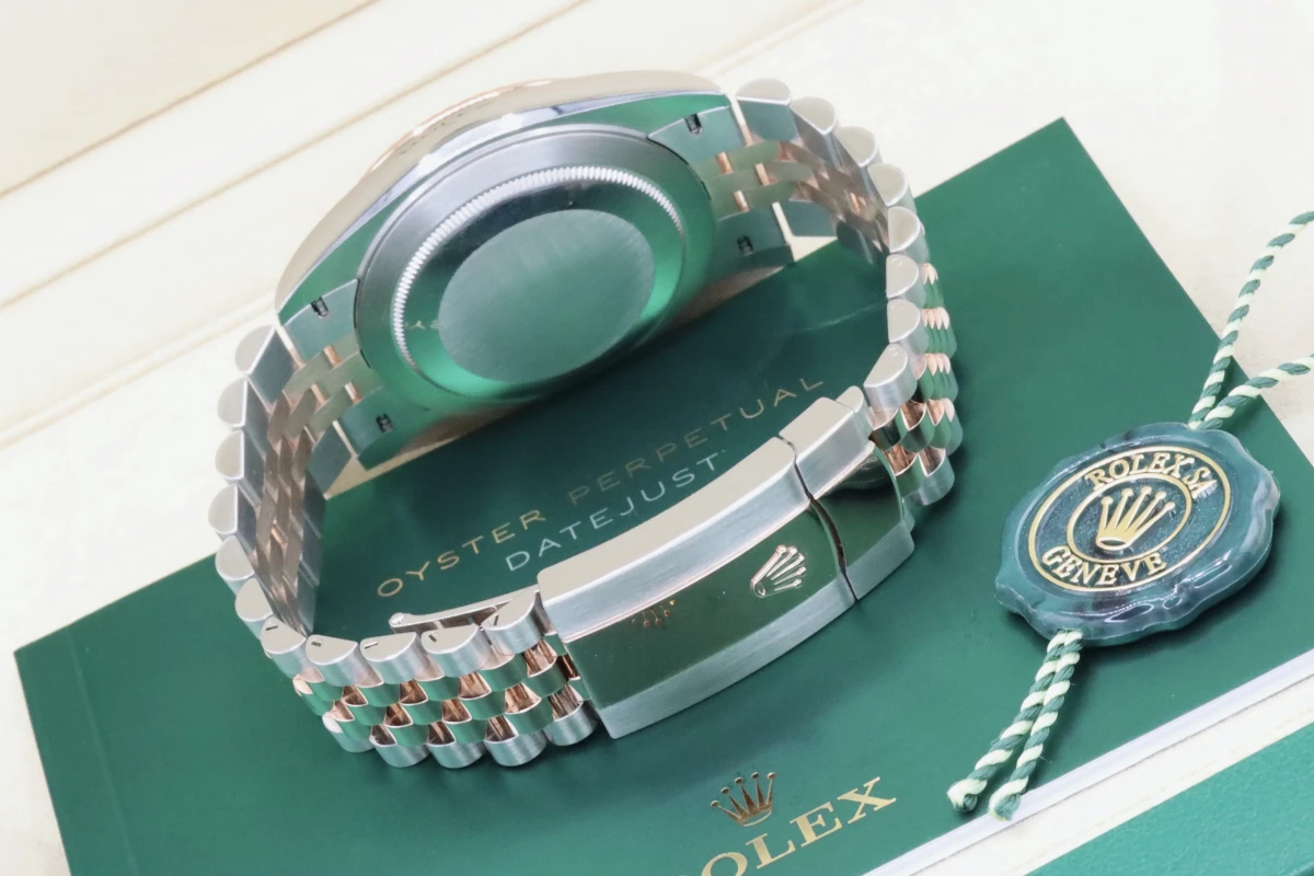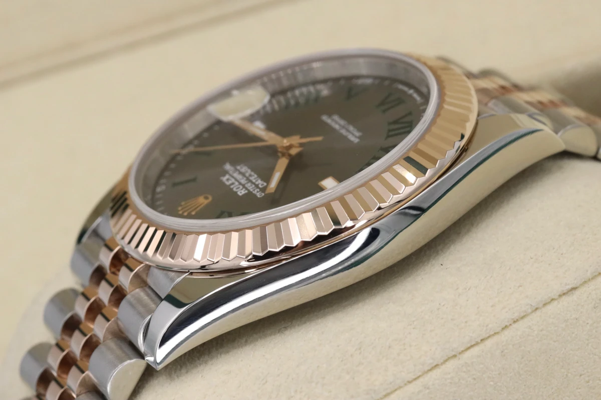 This 2021 Rolex DateJust features a 41mm Slate Gray and Green Dial "Wimbledon" A Steel and Everose Jubilee Bracelet and a Rose Gold Fluted Bezel.