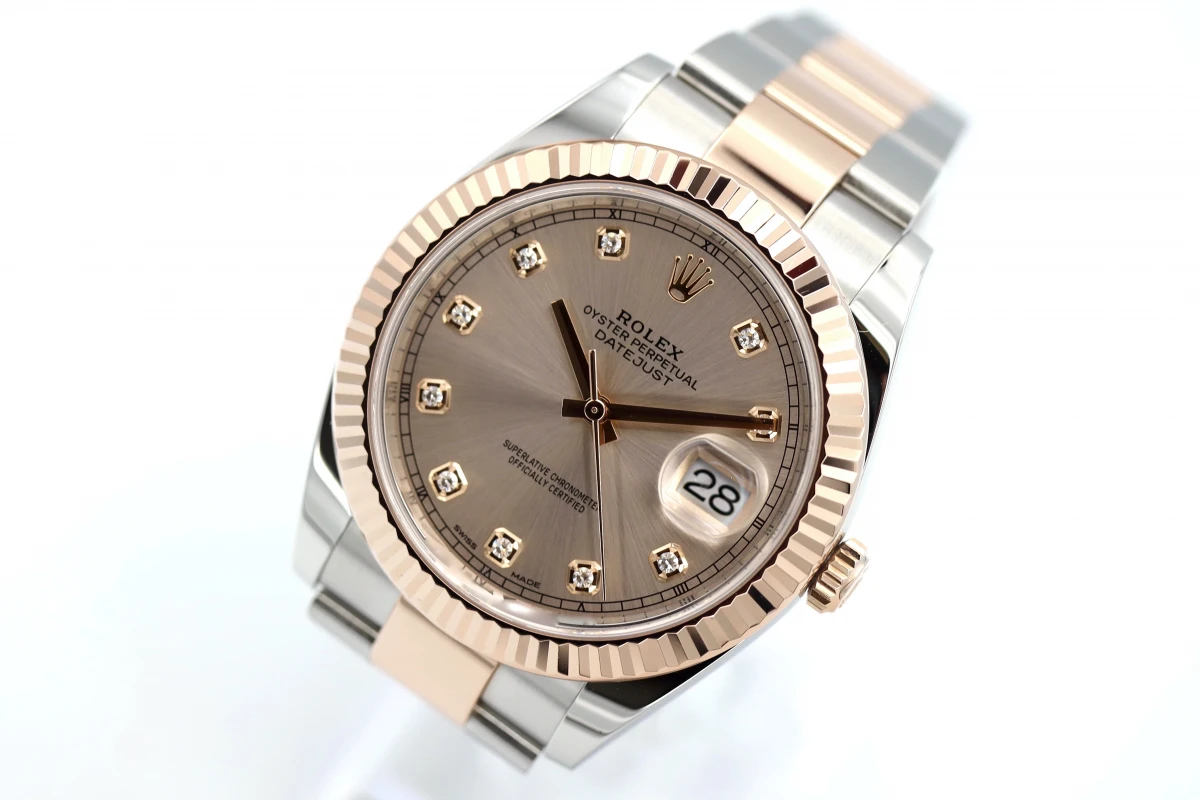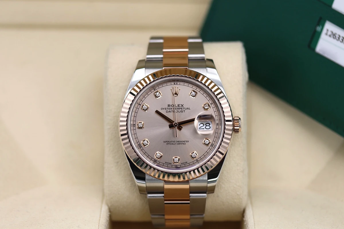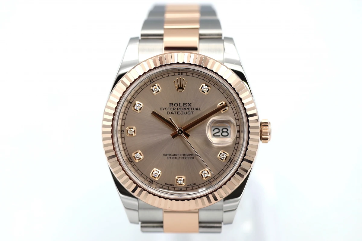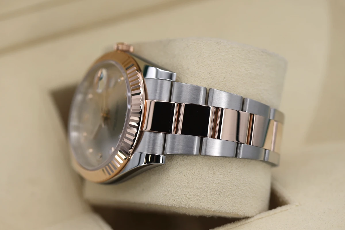 This 2019 Rolex DateJust Features a 41mm Pink Diamond dial, A Steel and Everose Oyster Bracelet and a Everose Fluted bezel.