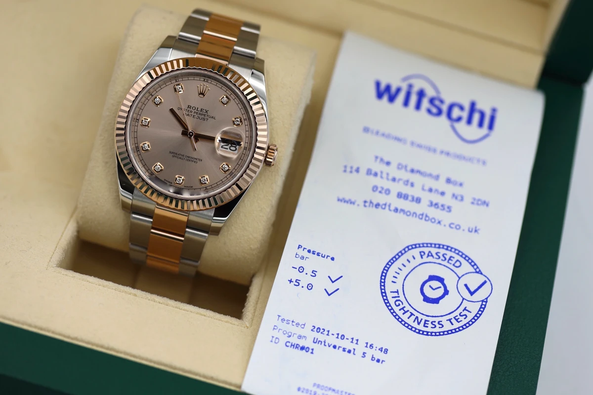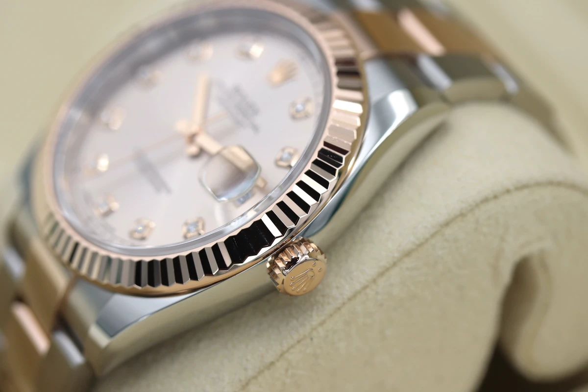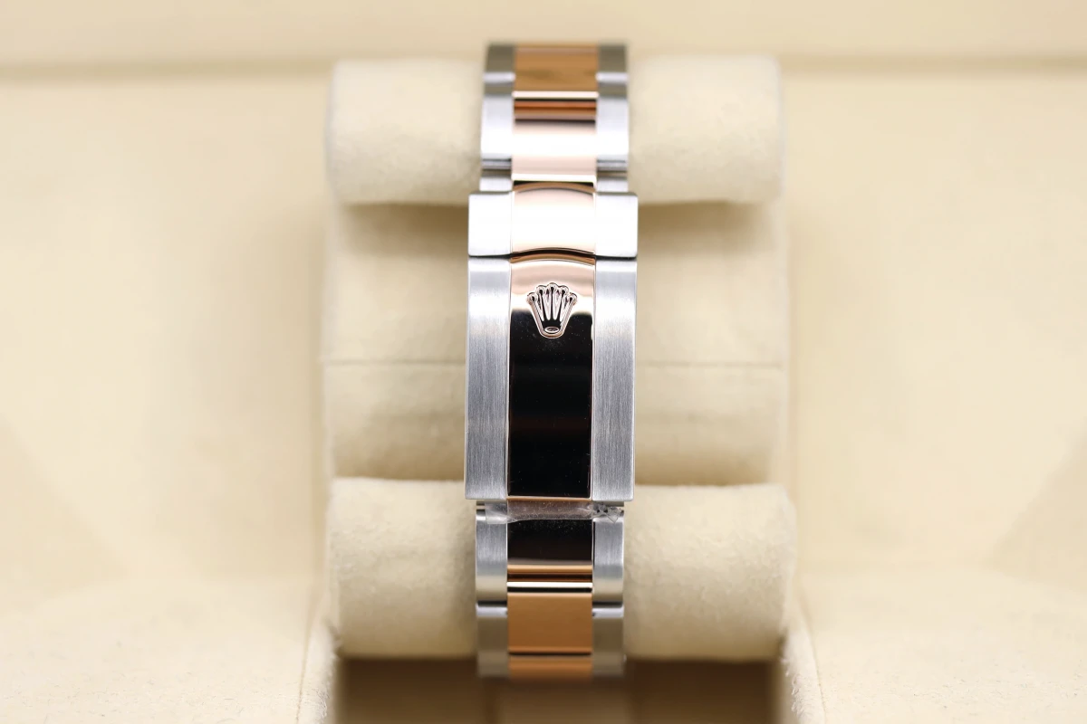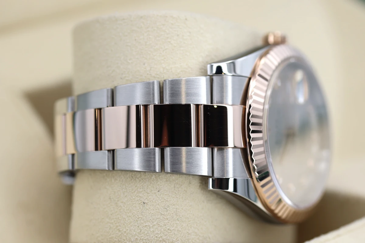 This 2019 Rolex DateJust Features a 41mm Pink Diamond dial, A Steel and Everose Oyster Bracelet and a Everose Fluted bezel.