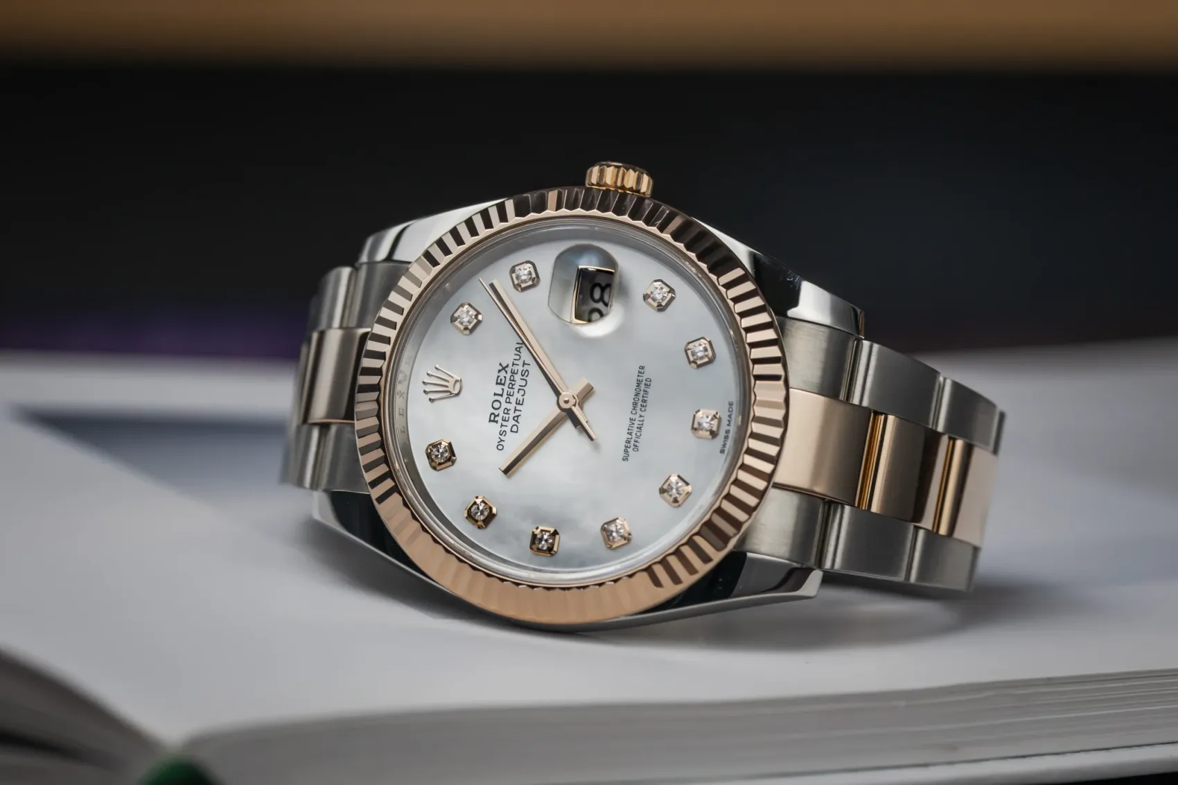 This 2019 Rolex DateJust 41mm features a mother of pearl dial with factory diamond markers and a stainless steel and 18ct rose gold oyster bracelet. It fitted with a 18ct rose gold fluted bezel.