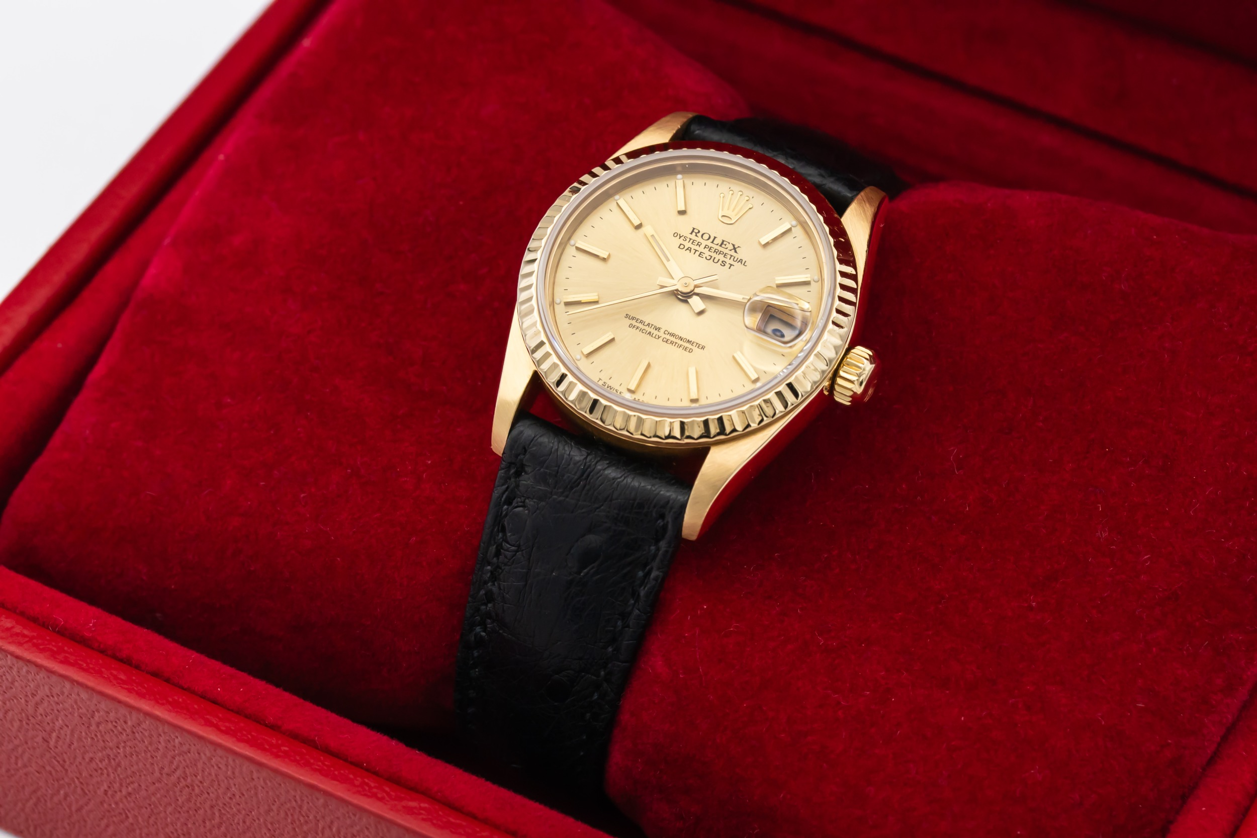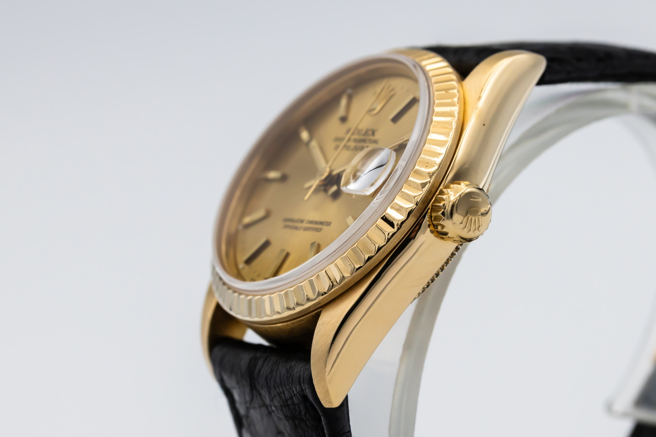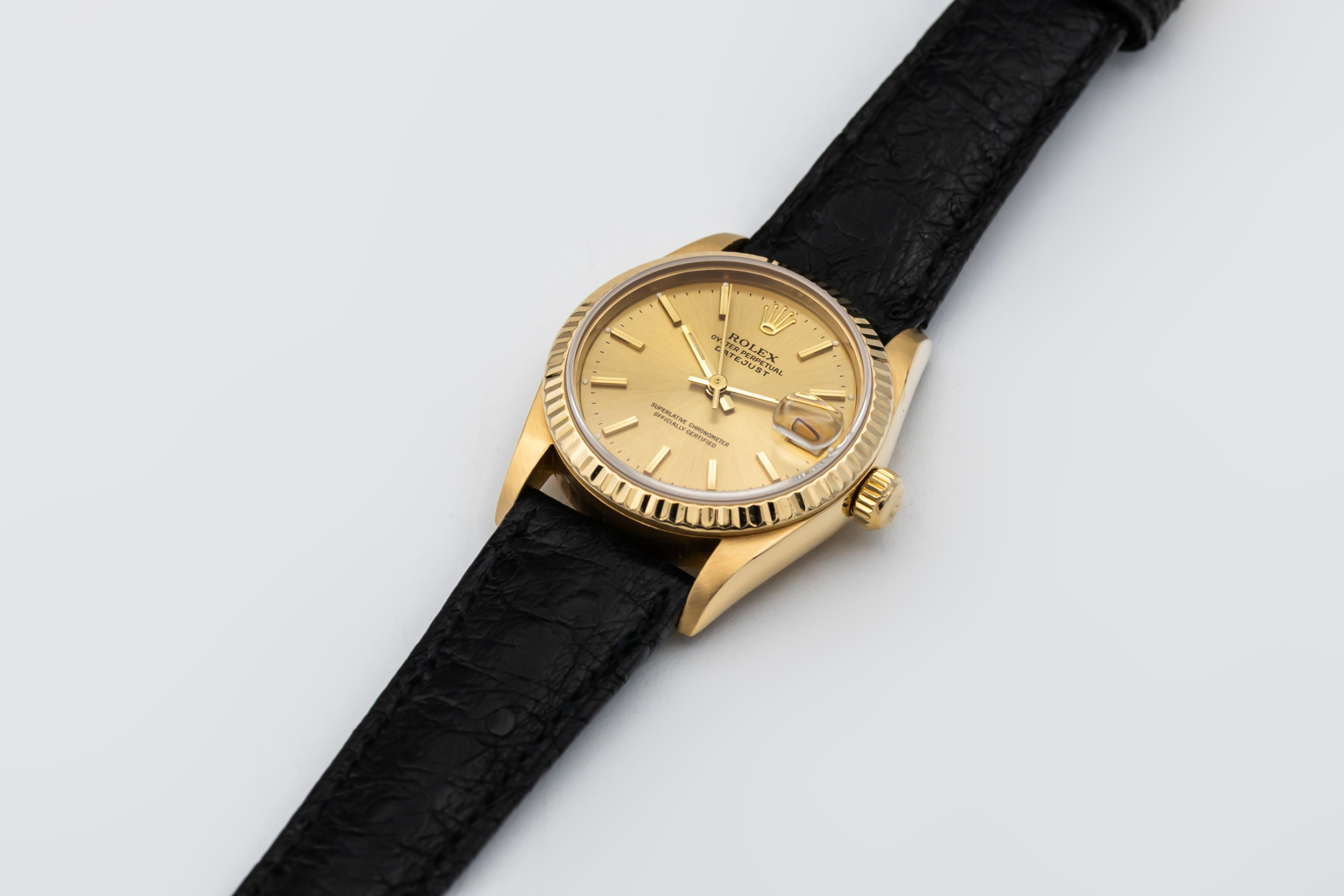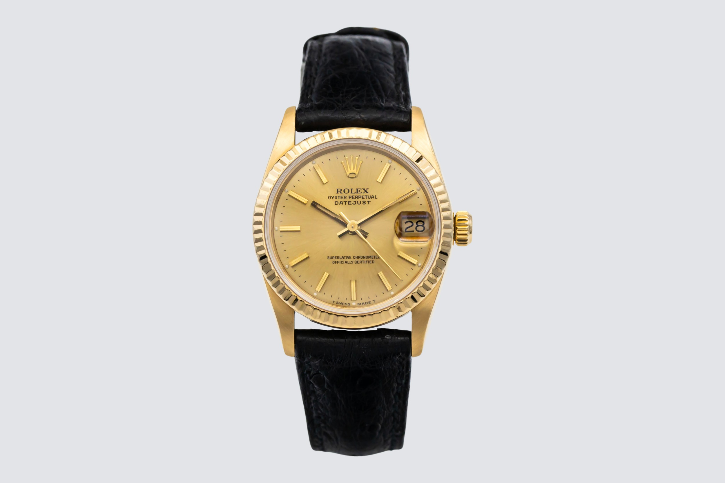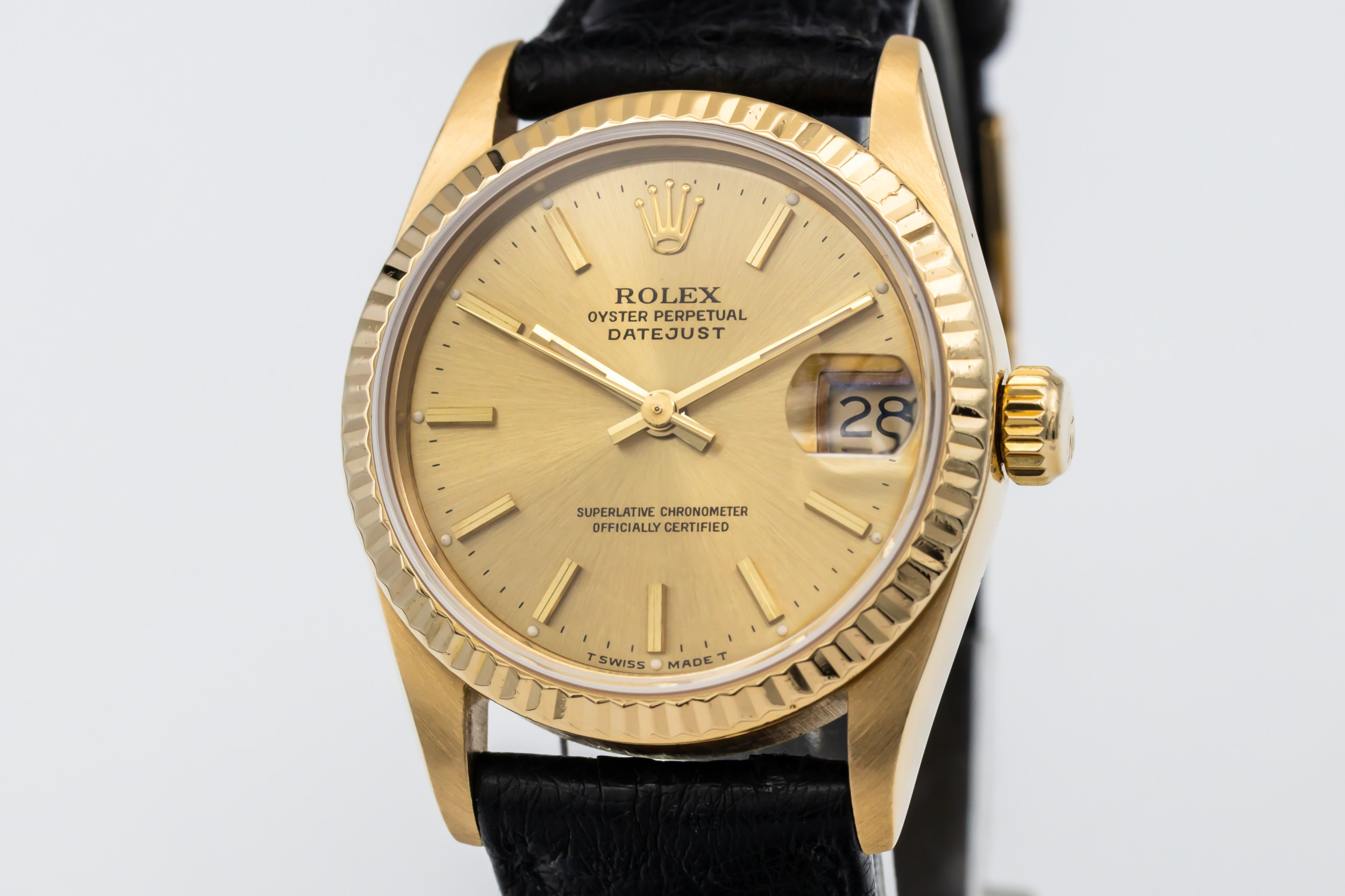 This 1993 Rolex DateJust 31mm features a champagne dial adorned with polished baton hour markers and matching gold hands, offering classic Rolex legibility and style. It is paired with a refined black leather strap that enhances its elegant, dress-watch appeal.