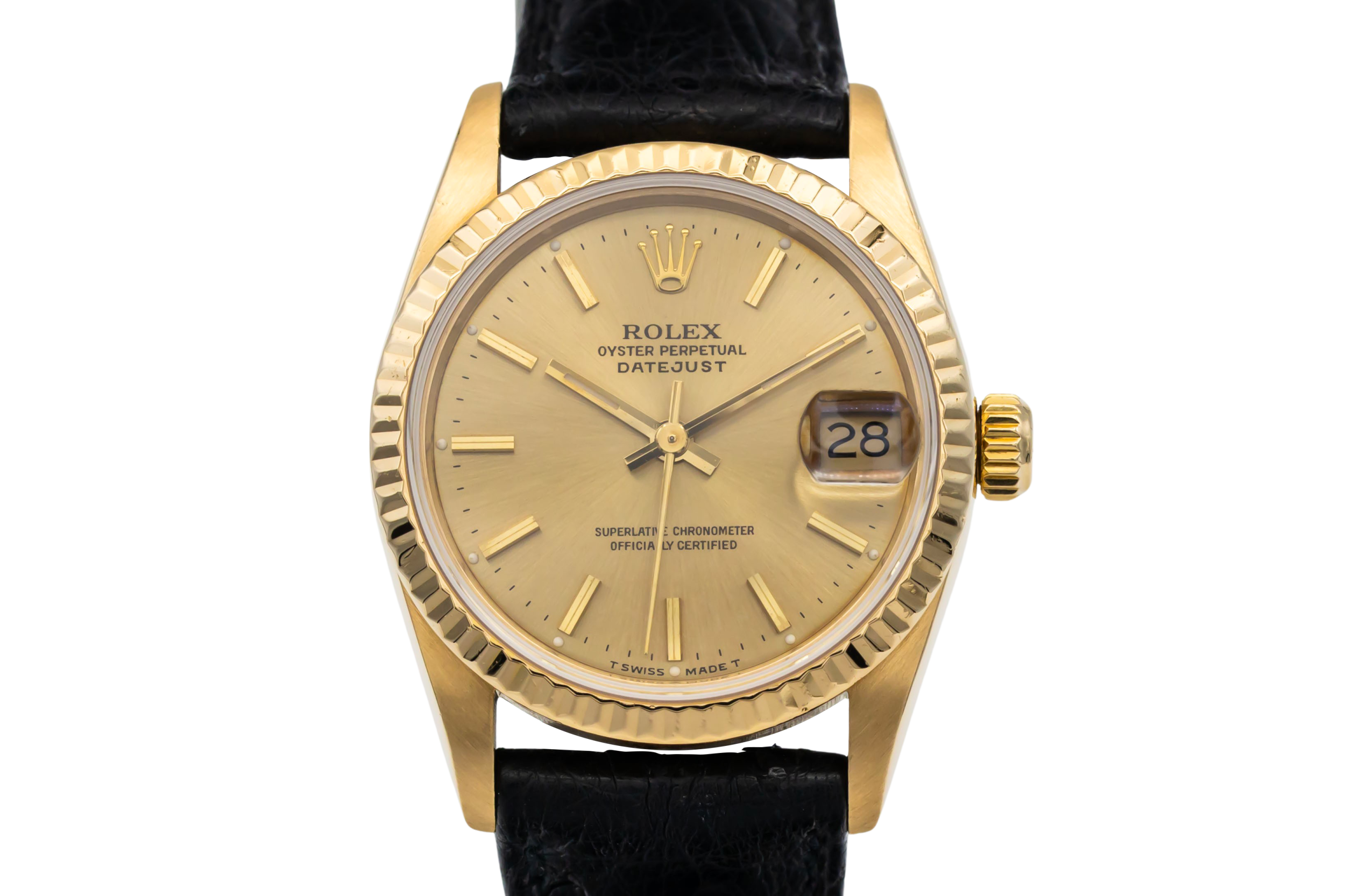 This 1993 Rolex DateJust 31mm features a champagne dial adorned with polished baton hour markers and matching gold hands, offering classic Rolex legibility and style. It is paired with a refined black leather strap that enhances its elegant, dress-watch appeal.