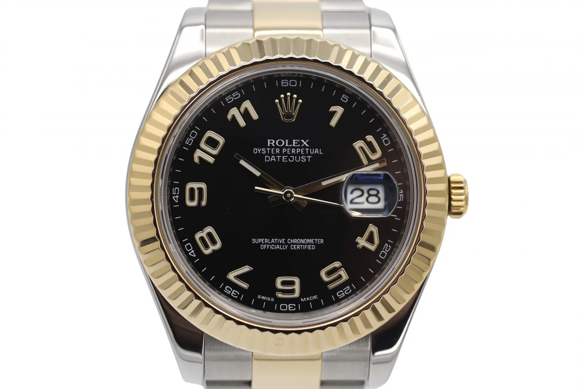 This Rolex DateJust II features a 41mm Black Arabic Dial, a gold fluted bezel and a stainless steel and Gold Oyster bracelet 116333.