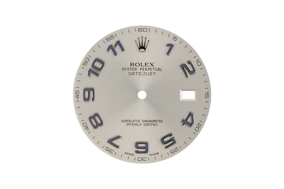 A silver dial with blue stainless steel arabic numerals, For a Rolex DateJust II.