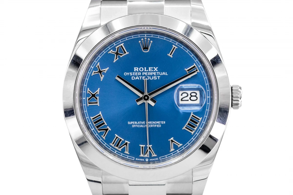 This 2020 Rolex DateJust features a 36mm blue 'azzuro' dial with roman numeral markers and a stainless steel oyster bracelet. It is fitted with a smooth stainless steel bezel.