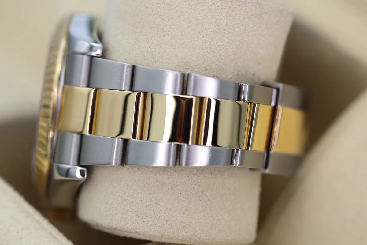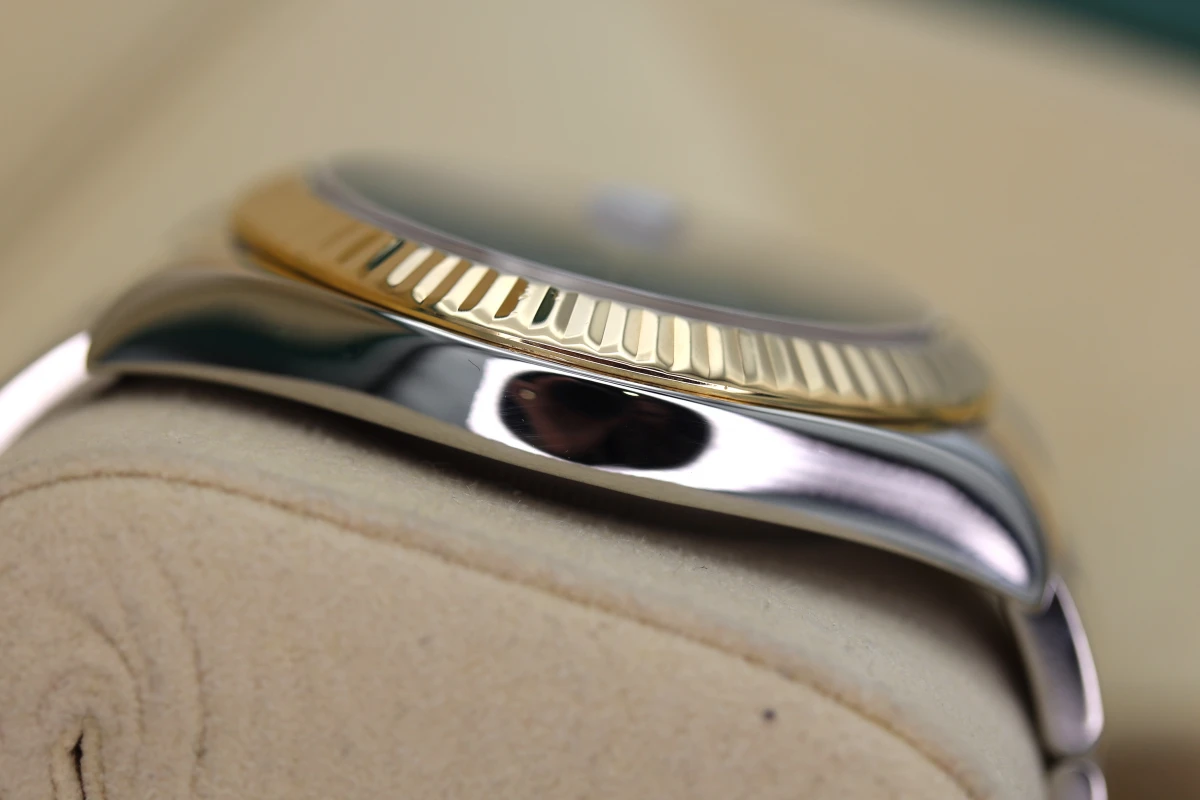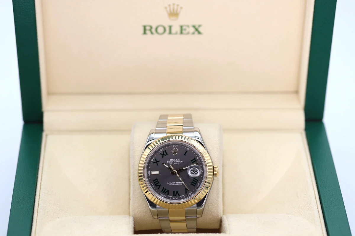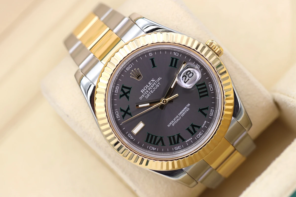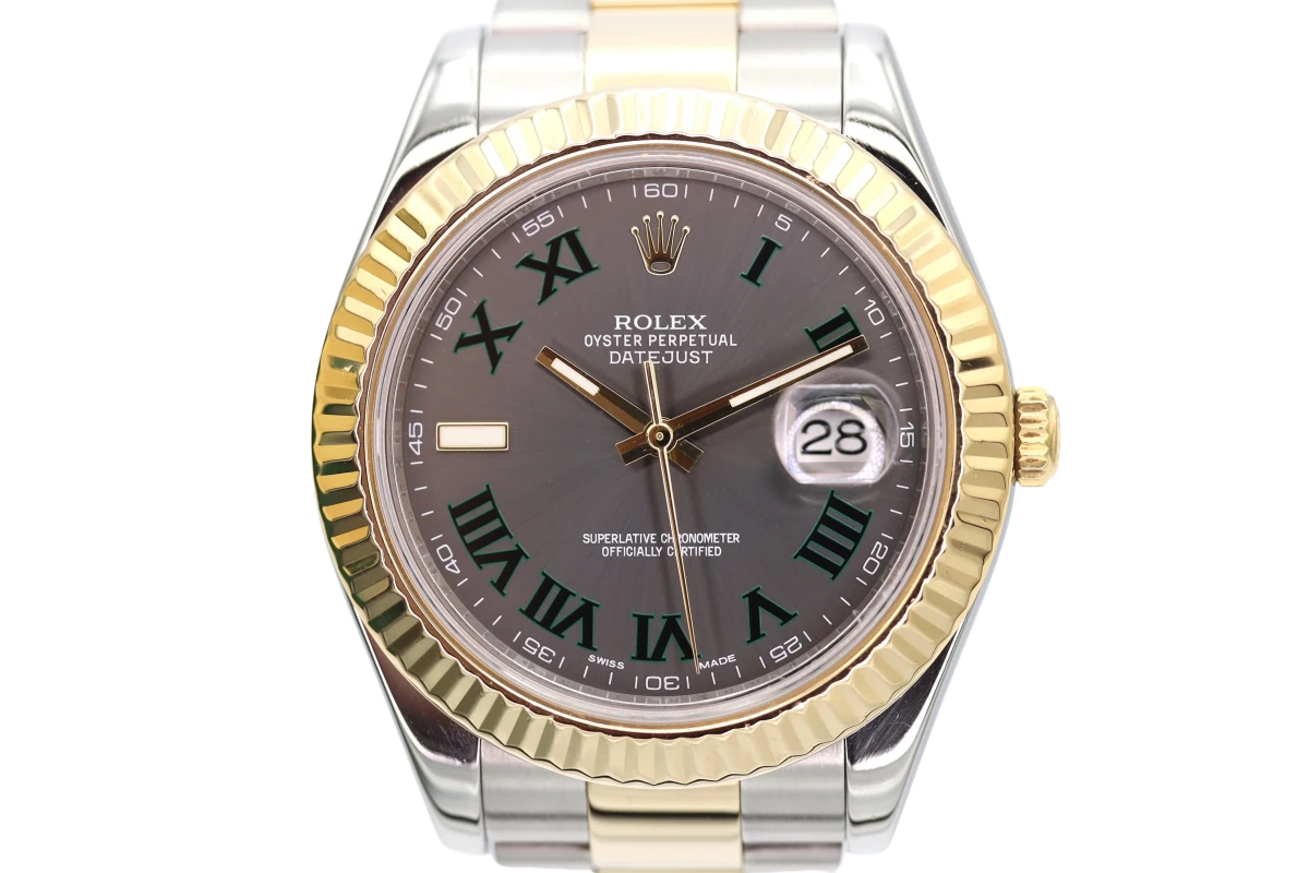 Pre-owned Rolex Datejust II Stainless steel & 18ct Yellow gold, Oyster strap, Slate Grey & Green dial "Wimbledon" This watch does not have original papers. This Rolex comes with an authentic Rolex box, 12 month warranty and full invoice of purchase.