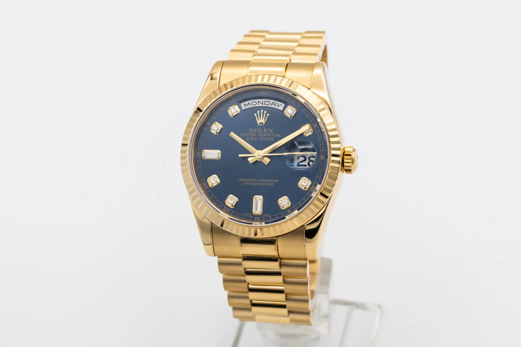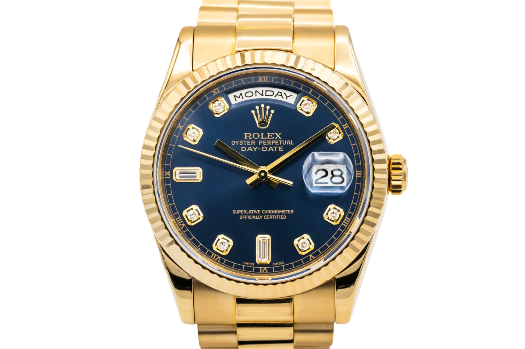 finance this from £375.27 p/m call the shop Read about our Limited Lifetime WarrantyThis 2007 Rolex Day-Date 36mm is a prestigious timepiece crafted entirely in 18ct yellow gold. Featuring a blue dial with diamond hour markers, day display at 12 o’clock and date at 3 o’clock. Finished with a fluted bezel and the iconic Presidential bracelet.