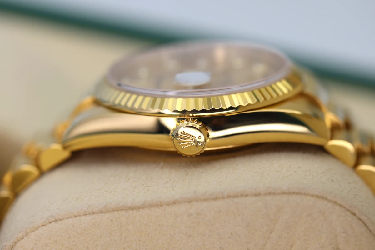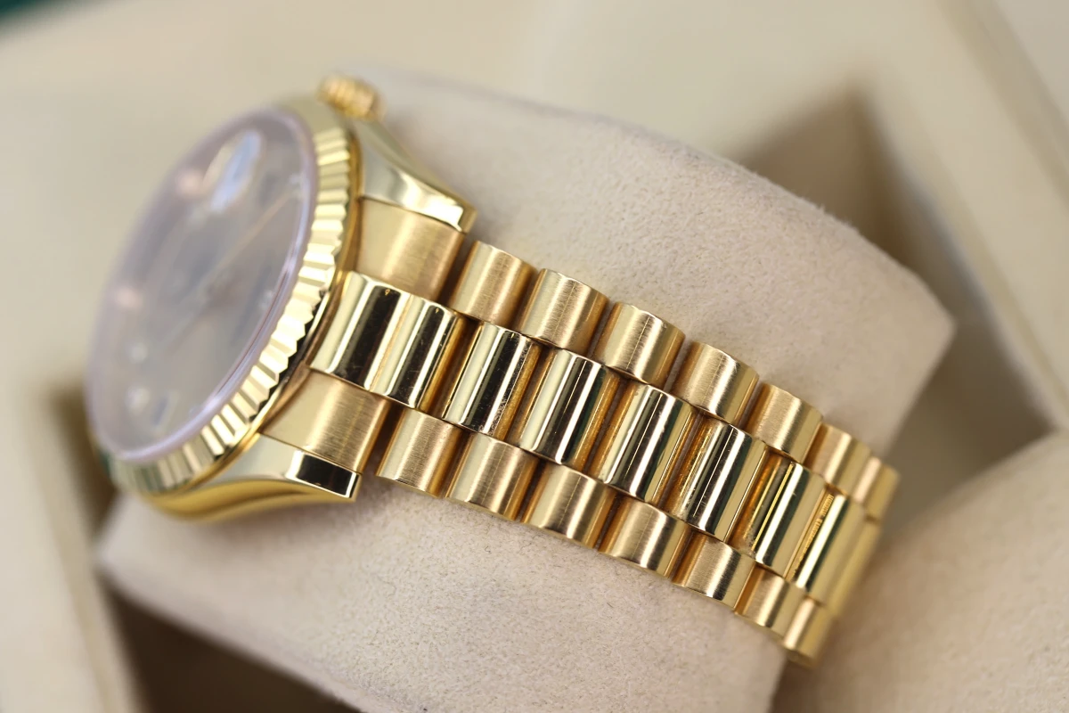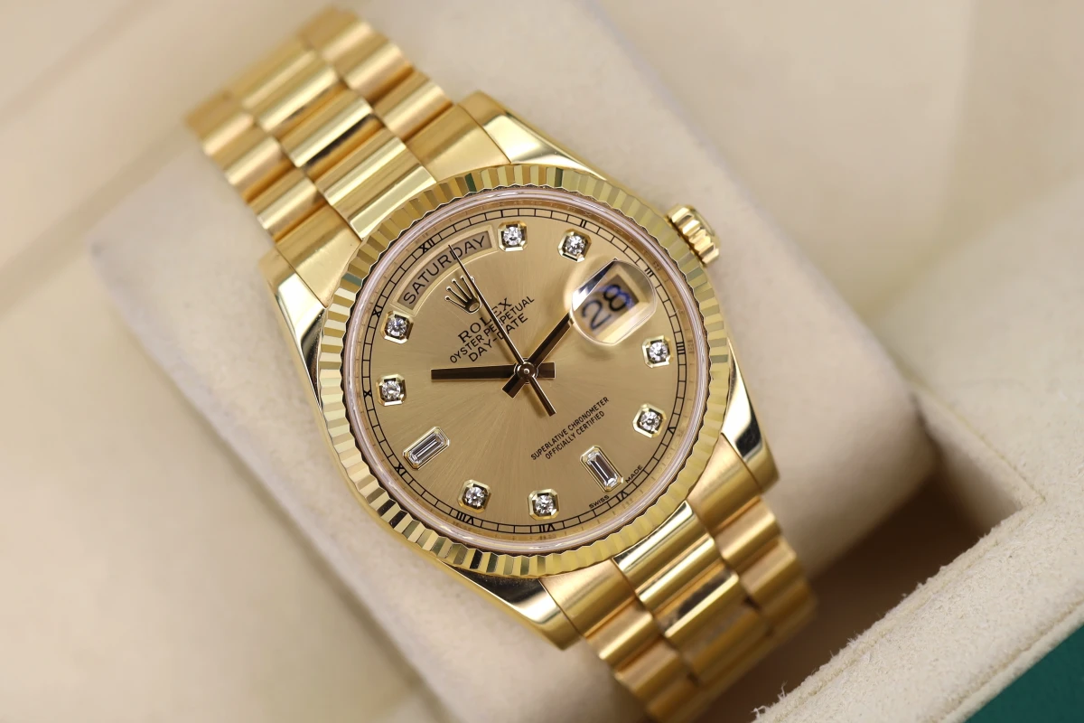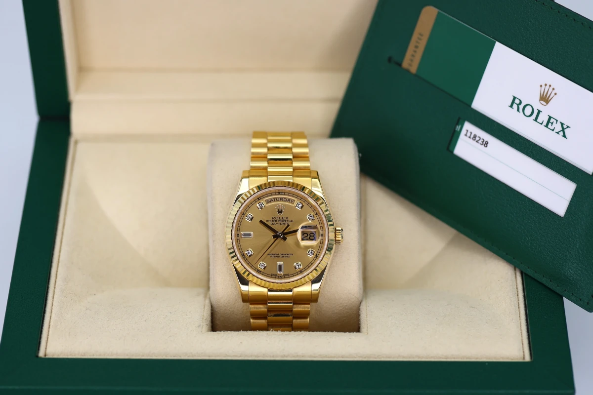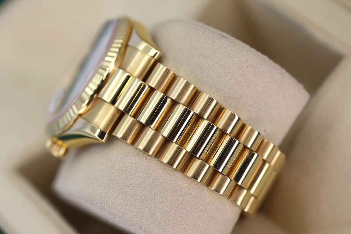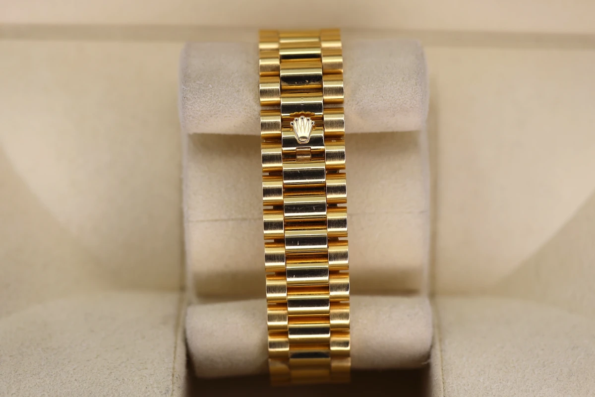 Pre-owned & in fantastic used condition this 2017 Rolex Day-Date is ready for sale still with 2 years Rolex international warranty. It features a full 18ct Yellow gold case and 18ct yellow gold presidential bracelet. The sapphire crystal is completely unmarked with a magnified date wheel at 3pm. The watch is in perfect working order and comes with full box & original Rolex warranty card.
