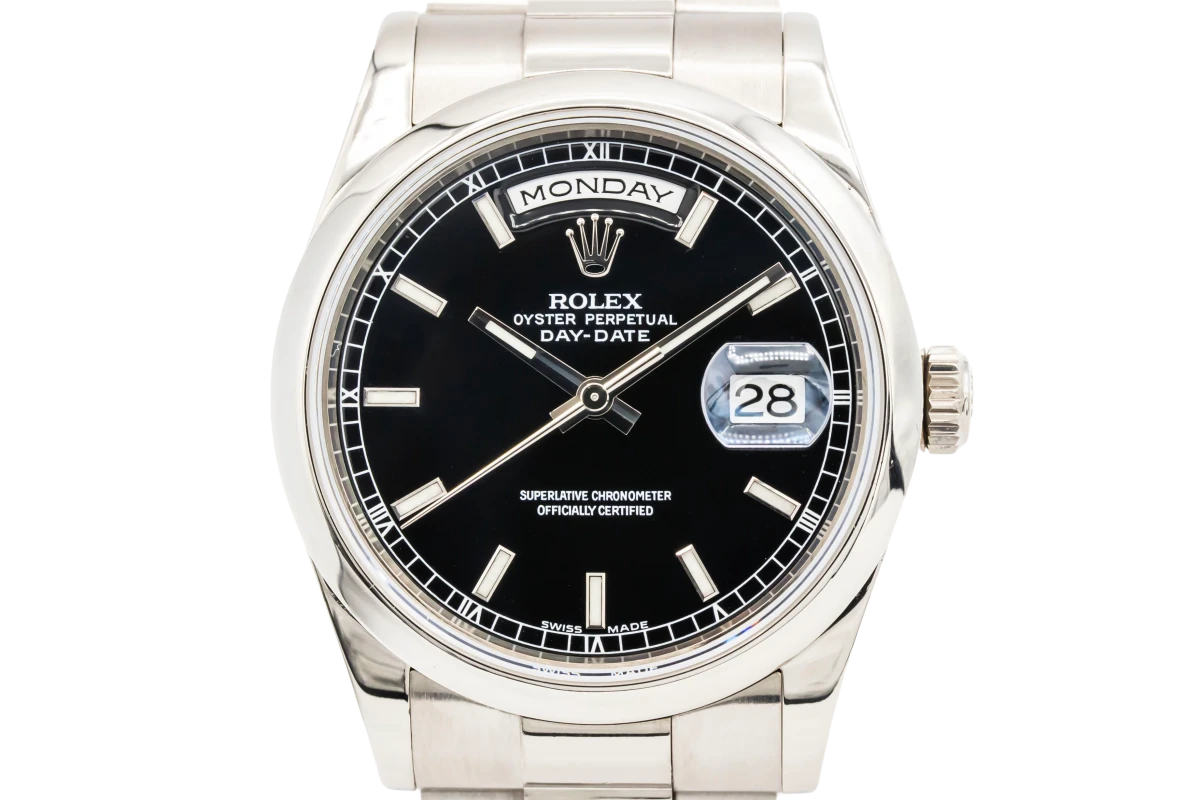 This 2008 Rolex Day-Date 36mm features a black dial with baton markers. The dial is the distinctive face of a Rolex watch, the feature most responsible for its identity and readability. Also featuring a 18ct white gold president bracelet and a smooth bezel.