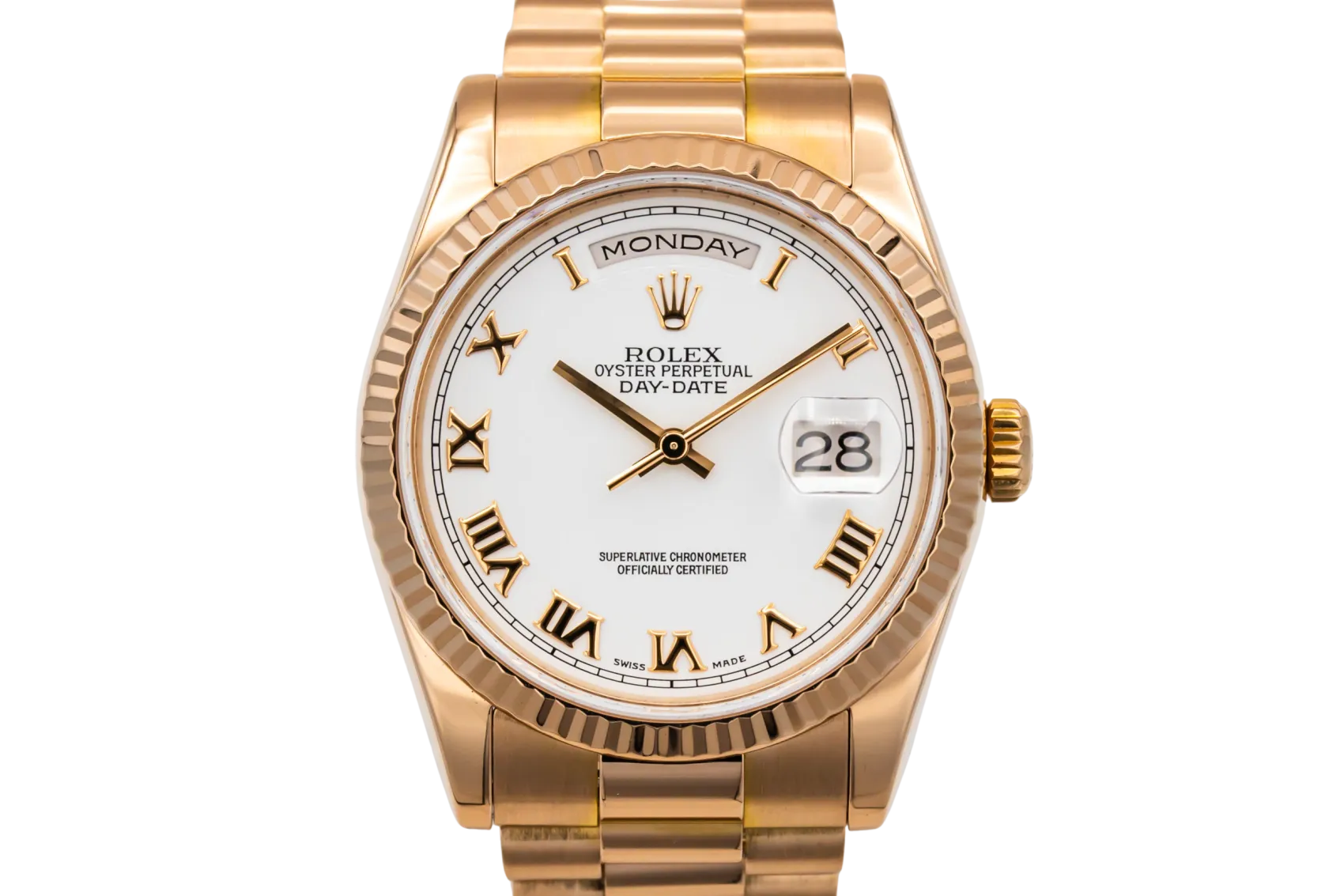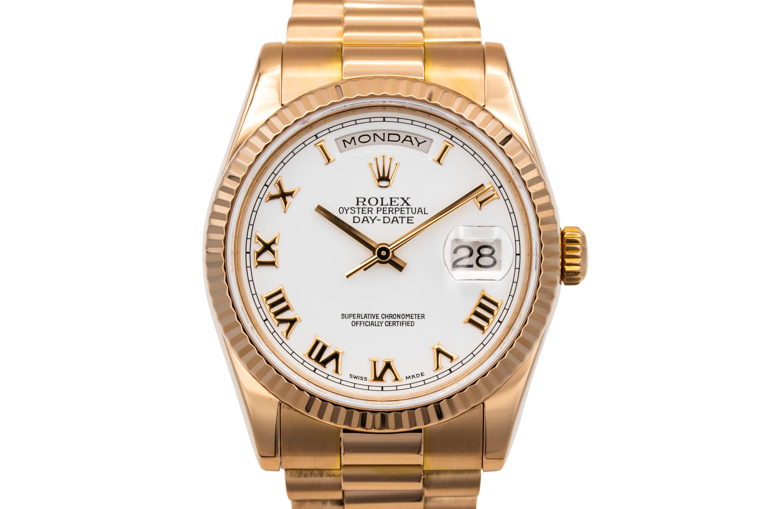 finance this from £343.99 p/m call the shop Read about our Limited Lifetime WarrantyThis 2003 Rolex Day-Date 36mm is a prestigious timepiece crafted entirely in 18ct Everose gold, featuring a classic white dial with roman numeral markers, day display at 12 o’clock and date at 3 o’clock. Finished with a fluted bezel and the iconic Presidential bracelet.